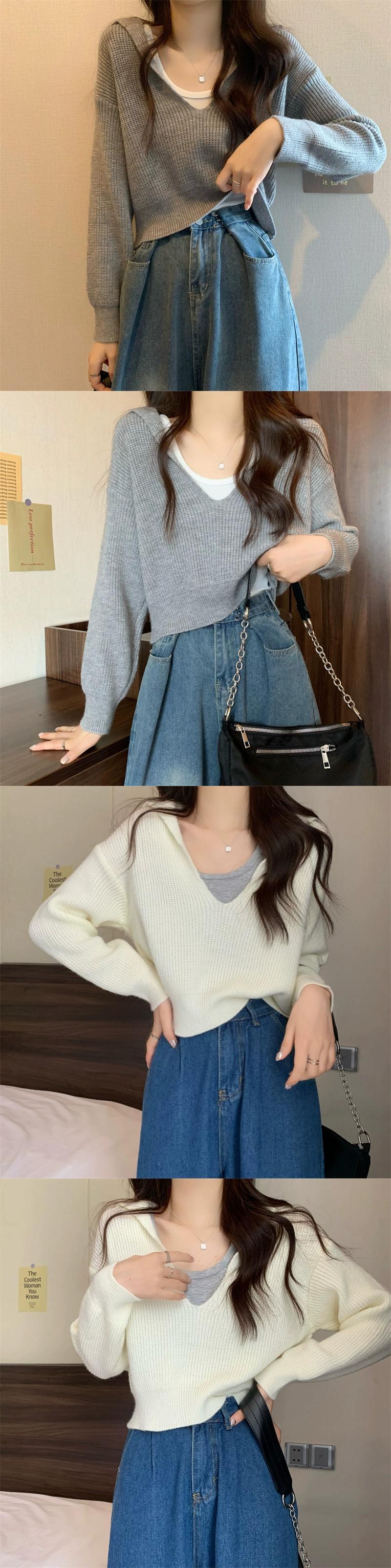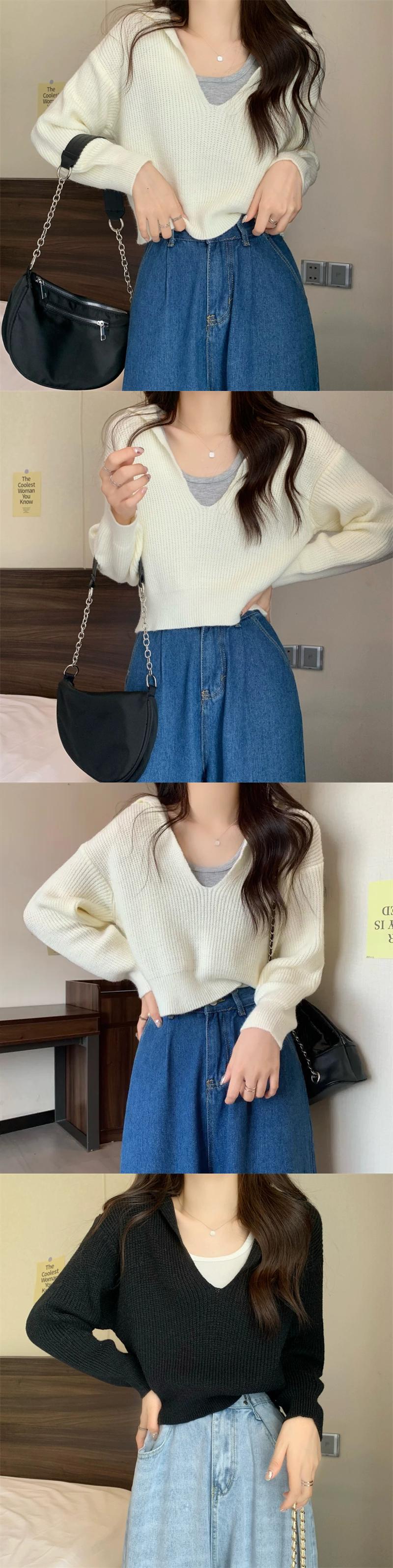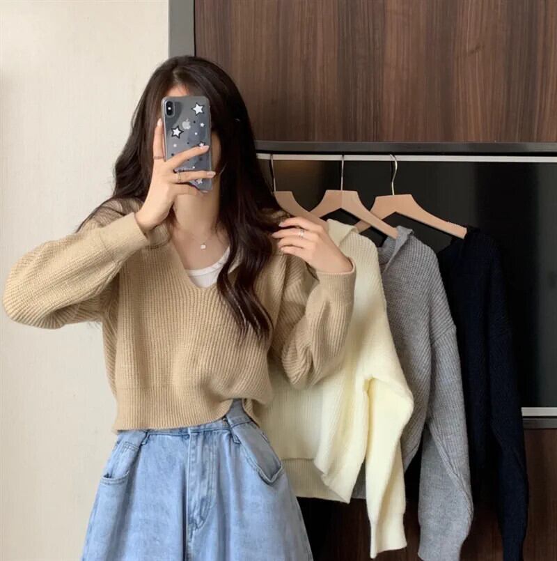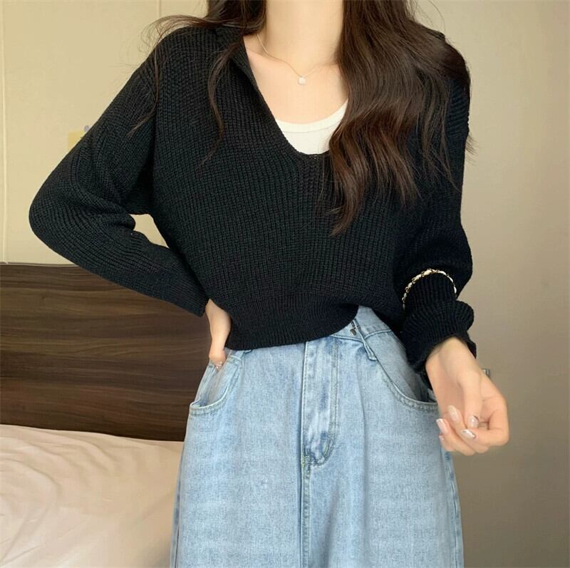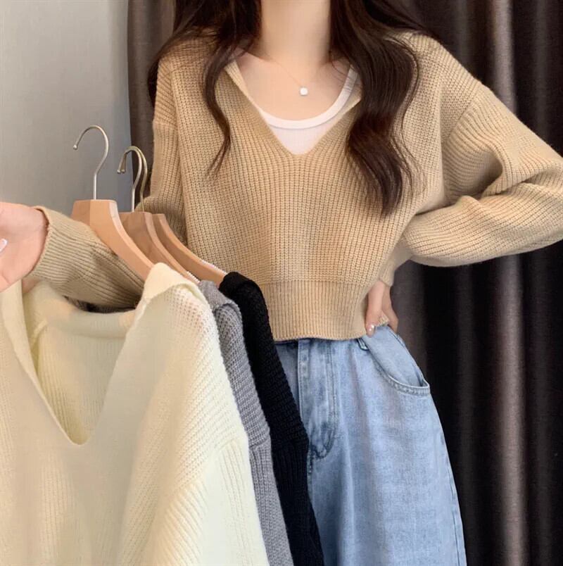 春と秋のグレーのショート V ネックセーター女性、ゆったりと怠惰、スリムで小さい、長袖プルオーバーセーター ロング スプリング 春物 オータム 秋物 Vネック 7460069395073052 | framboise21