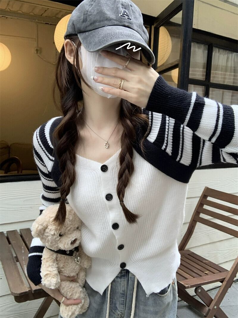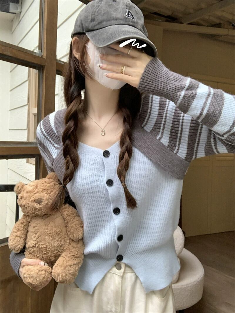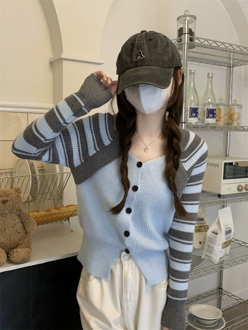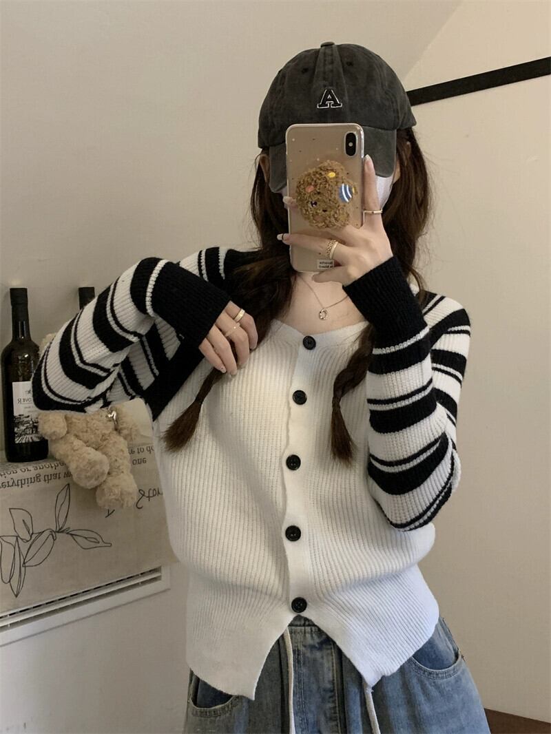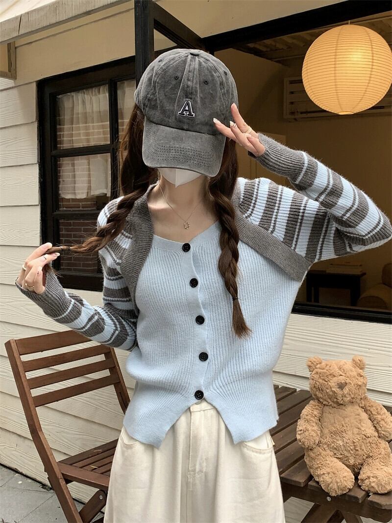 フェイクツーピースストライプVネックセータージャケットレディース、春と秋のデザイン、ゆったりとしたアウターウェア、ショートニットカーディガン小人 スプリング 春物 オータム 秋物 7460048121171701 | framboise21