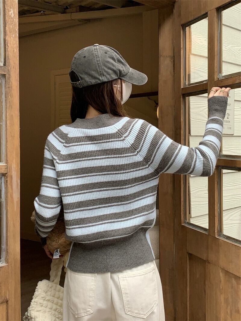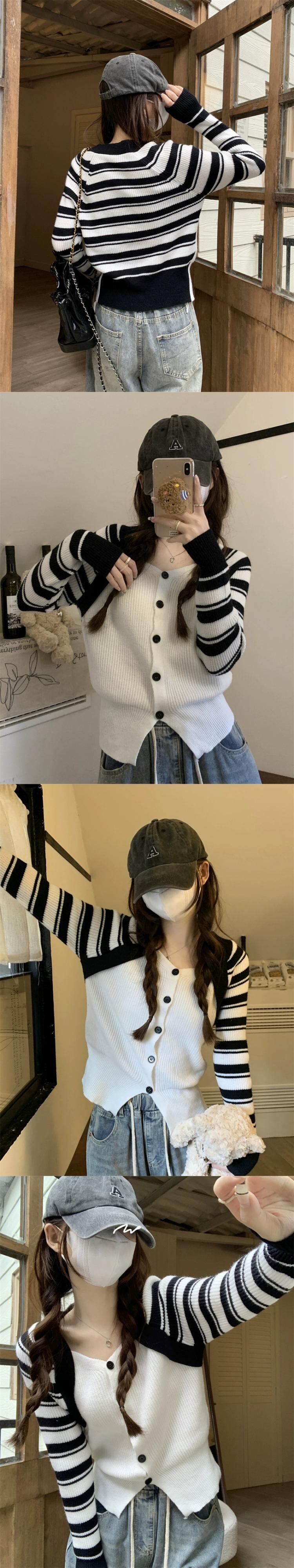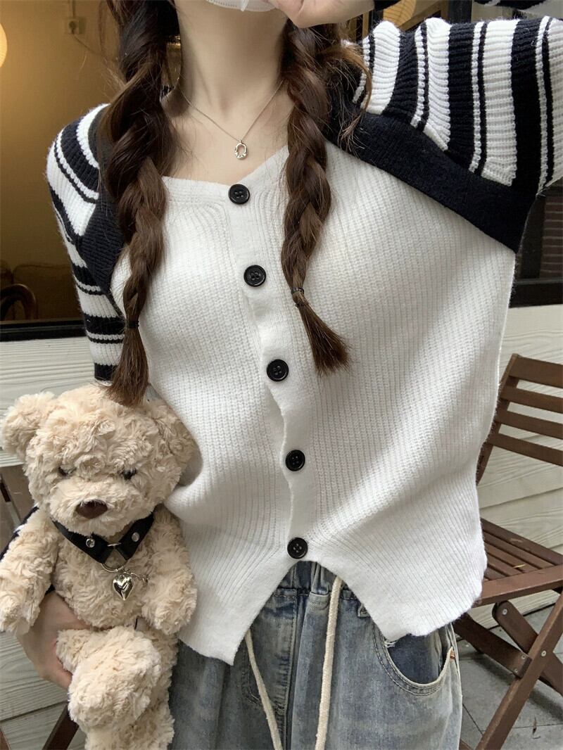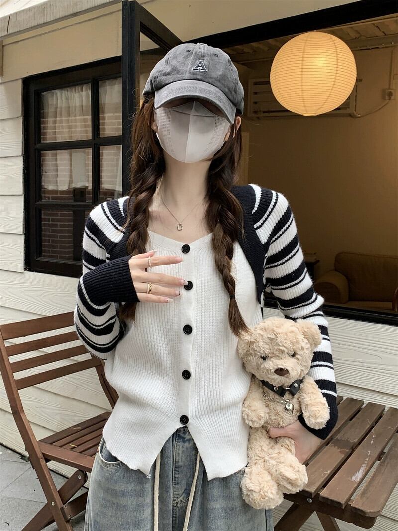 フェイクツーピースストライプVネックセータージャケットレディース、春と秋のデザイン、ゆったりとしたアウターウェア、ショートニットカーディガン小人 スプリング 春物 オータム 秋物 7460048121171701 | framboise21