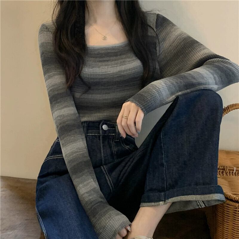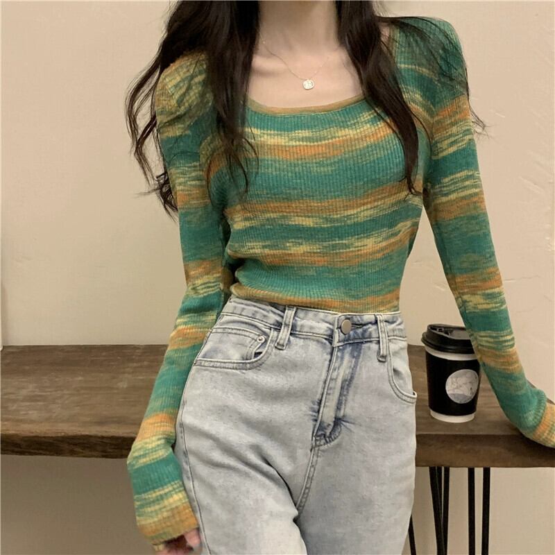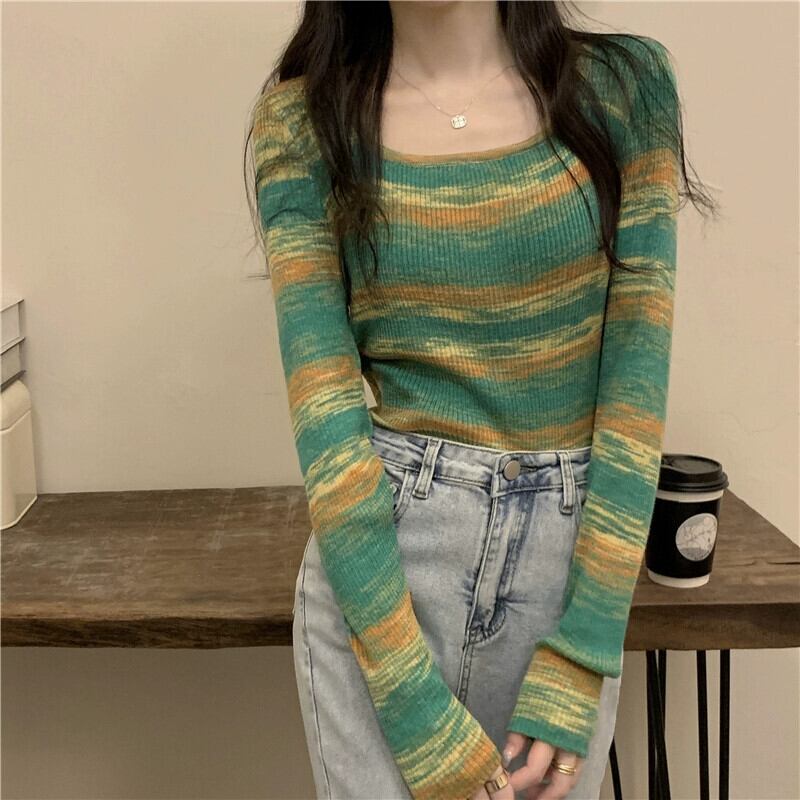 秋冬の絞り染めストライプボトムシャツレディース、ファッショナブルでファッショナブル、アインスタイルのインナーショートセーター、スリムニットスクエアネックトップ オータム 秋物 ウィンター 冬物 スクウェア 7460039029101777 | framboise21