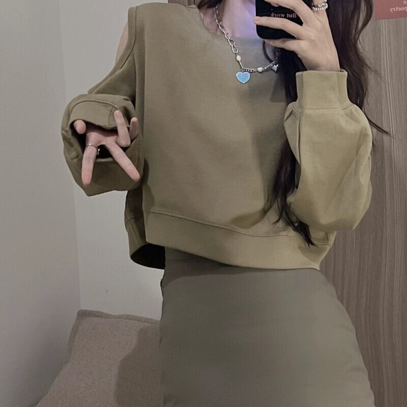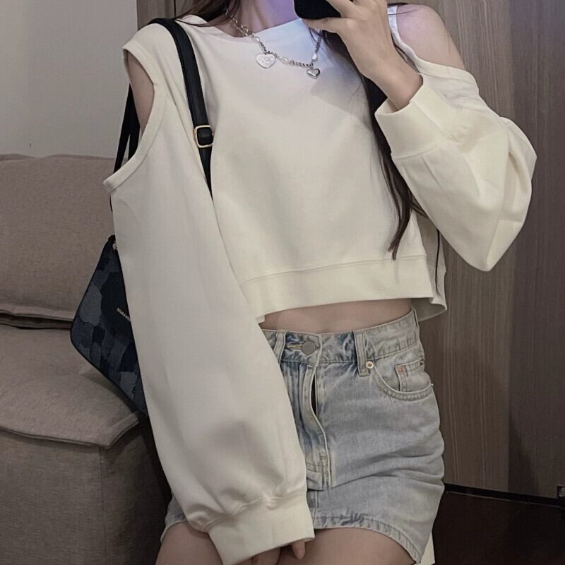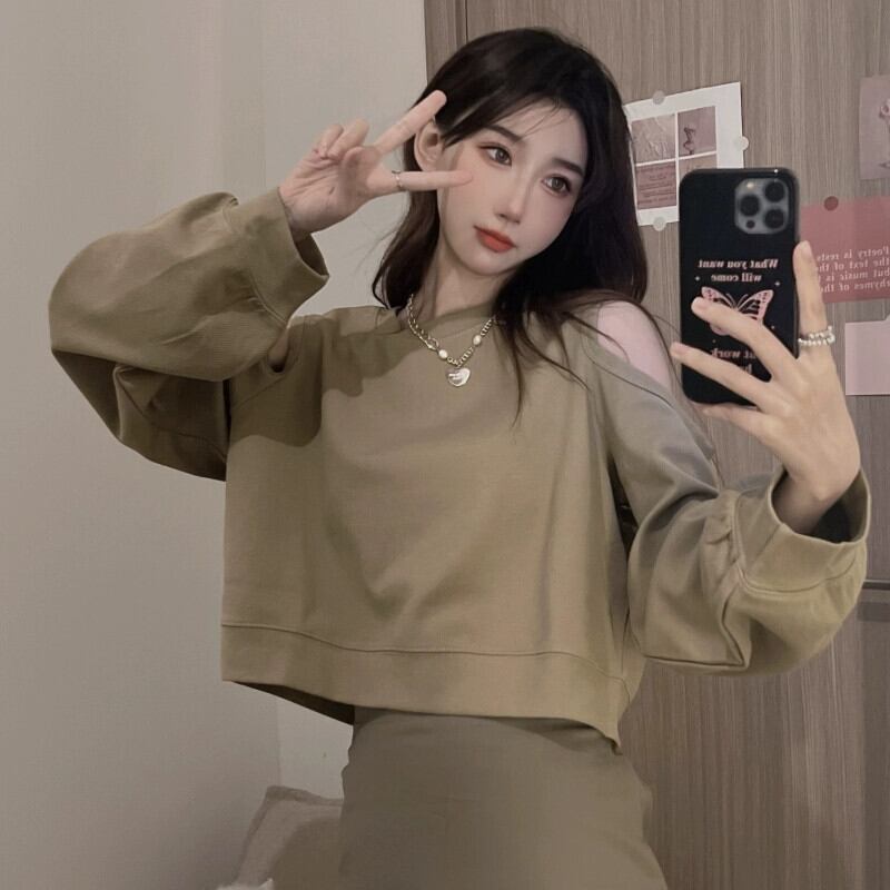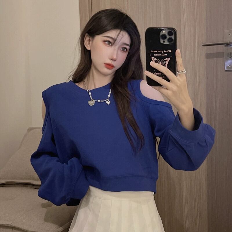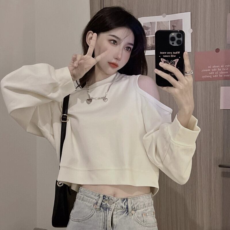 オフショルダーショートスウェットシャツの女性の2023春と秋の新しいレトロなデザイン、ルーズで多用途なバック中空長袖トップ ロング スプリング 春物 オータム 秋物 7460087640368284 | framboise21