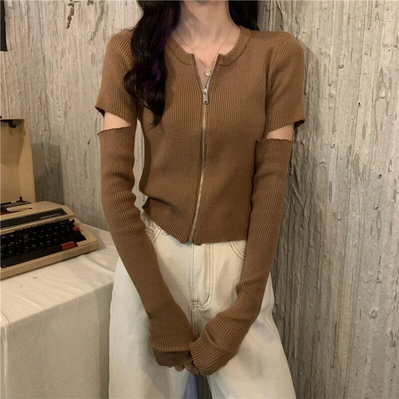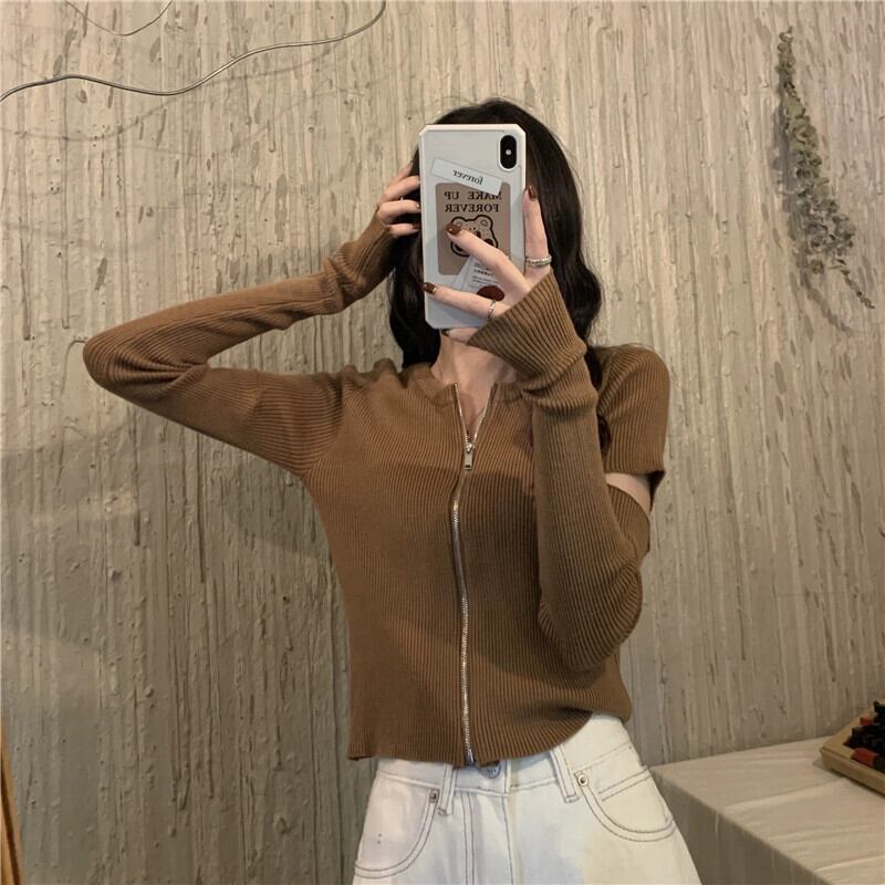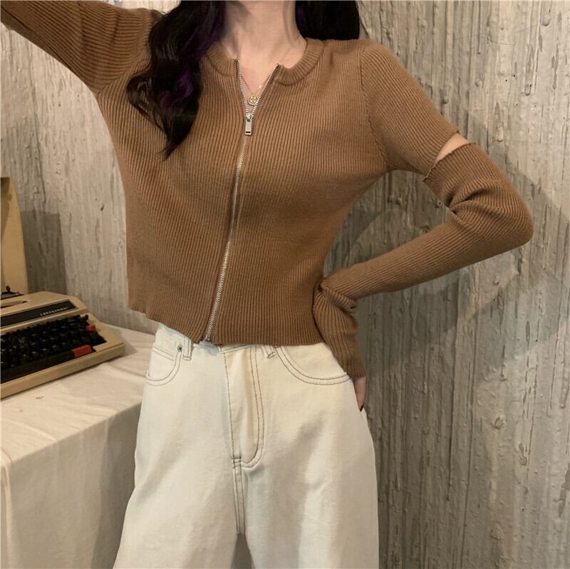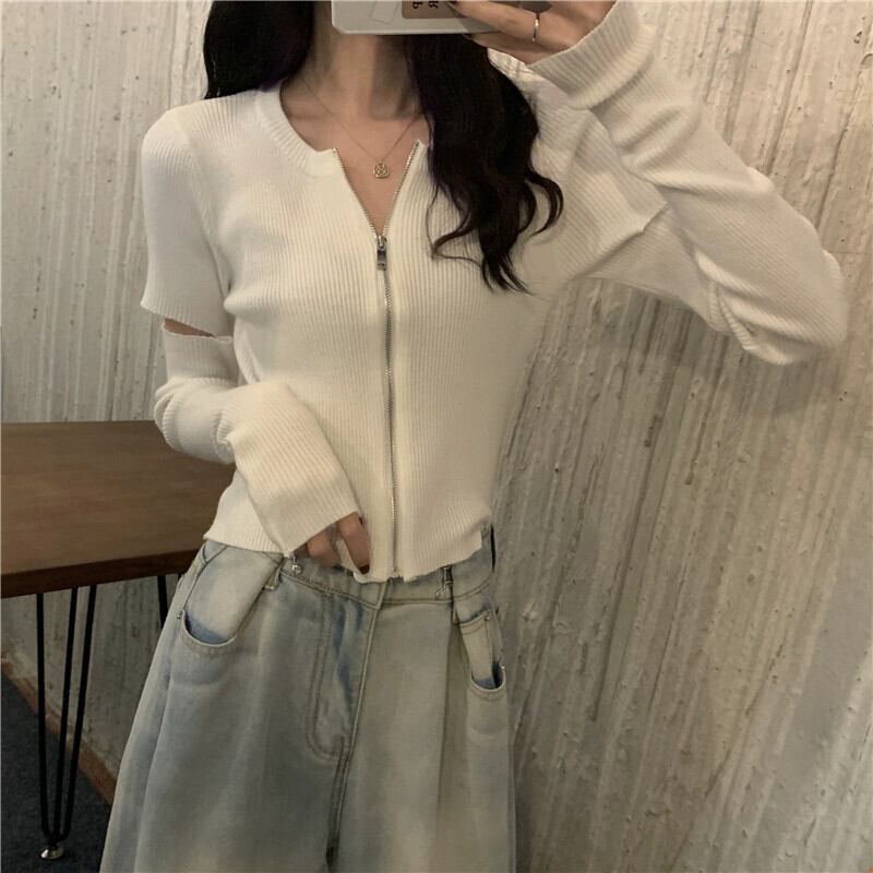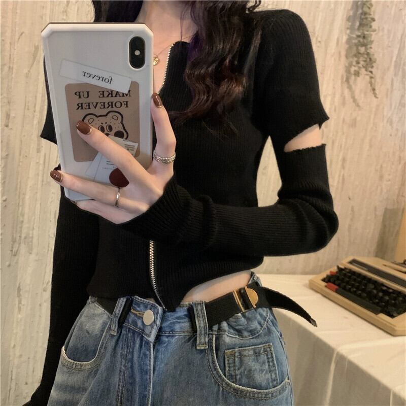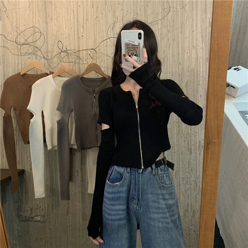 ホットハイウエストショートニットトップレディース、春と秋のデザイン、スリムでスリム、ジッパーホール長袖カーディガン ロング レッド スプリング 春物 オータム 秋物 7460084628774922 | framboise21