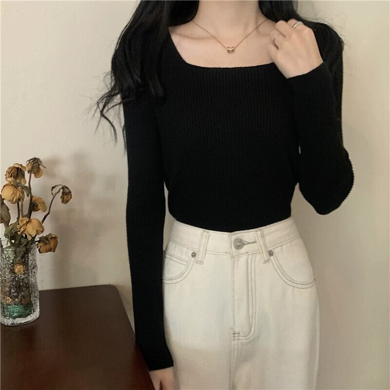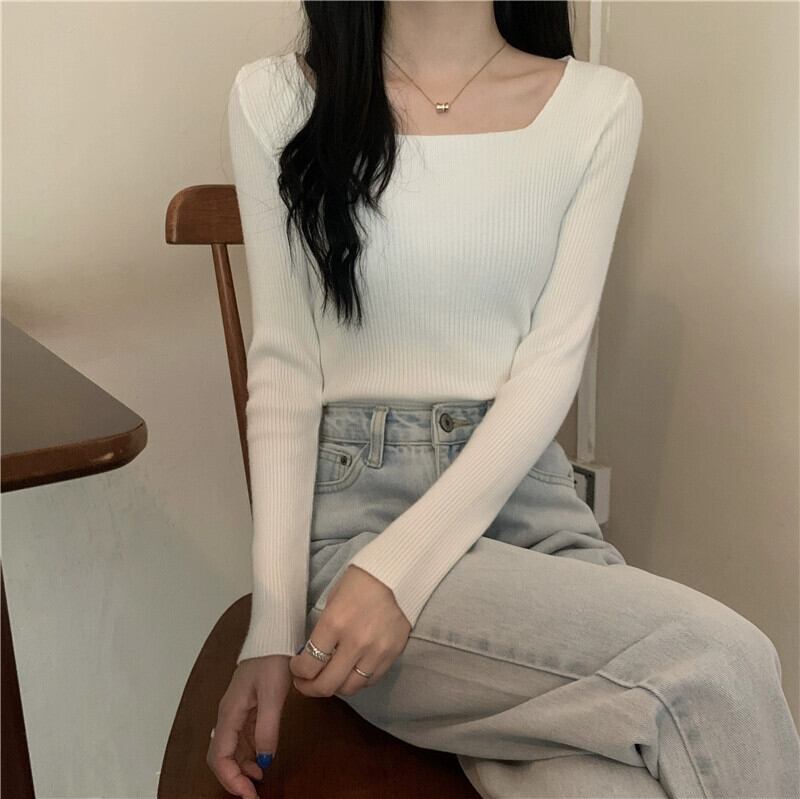 秋冬のスレッドニットボトムシャツレディース、ファッショナブルでスタイリッシュ、スリムフィットインナーセーター、スリムスクエアネック長袖トップ ロング オータム 秋物 ウィンター 冬物 スクウェア 7460083309800820 | framboise21