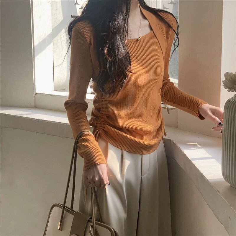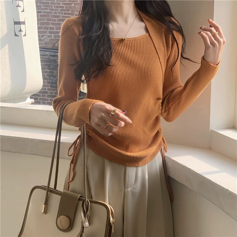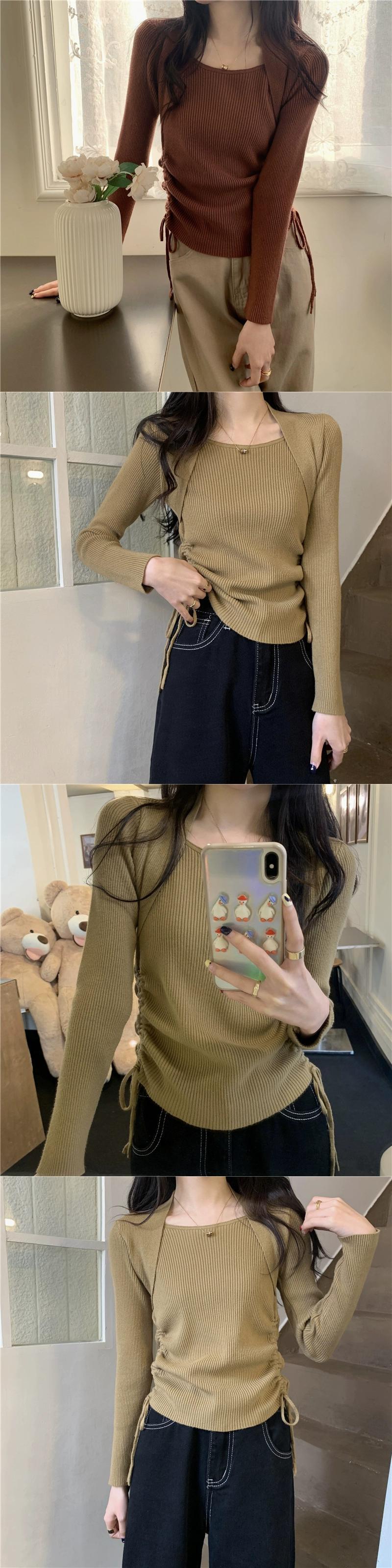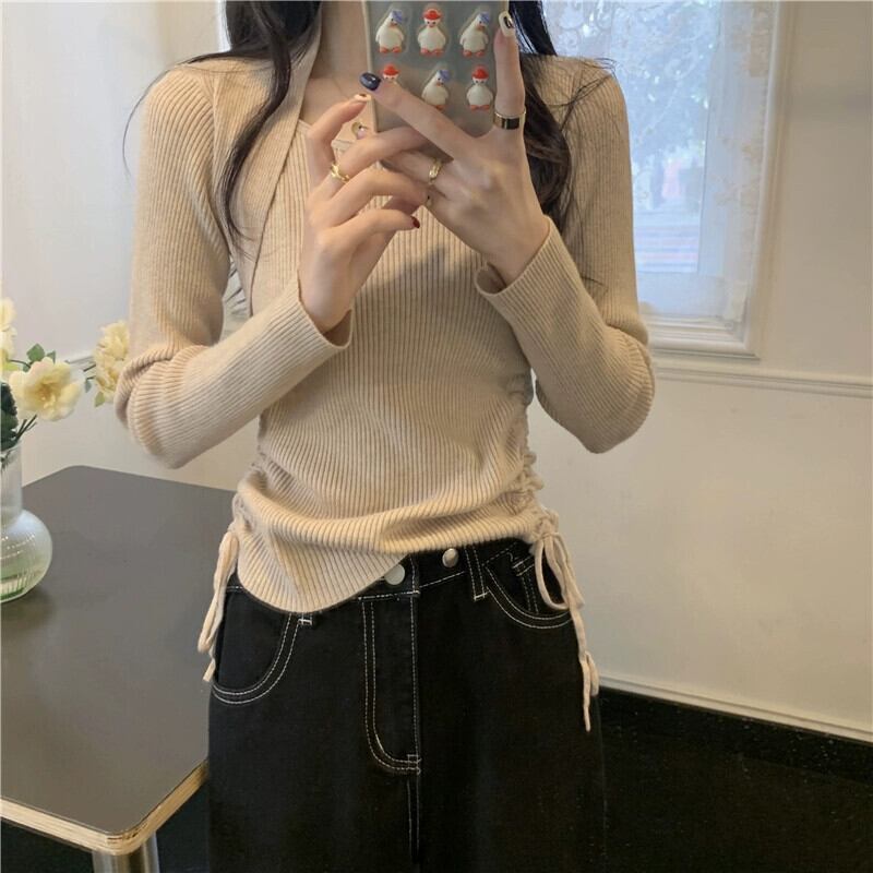 不規則なショートスクエアネックボトリングシャツレディース、春と秋のスタイル、ウエスタンスタイル、スリムフィットインナードローストリングレースアップ長袖ニットトップ ロング スプリング 春物 オータム 秋物 スクウェア 7460075497125697 | framboise21