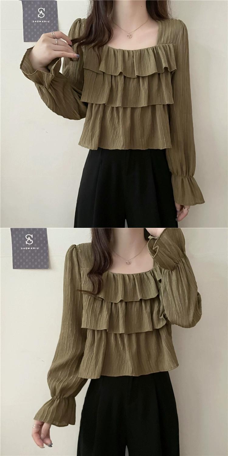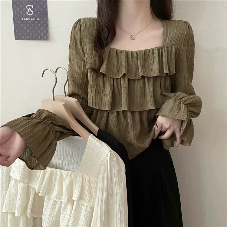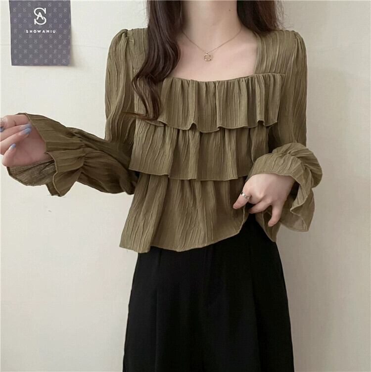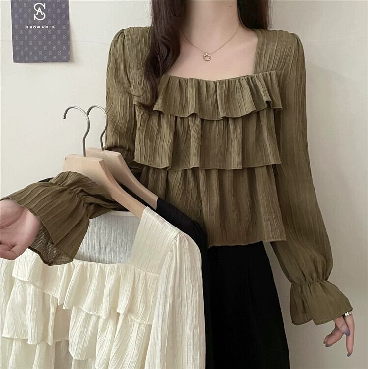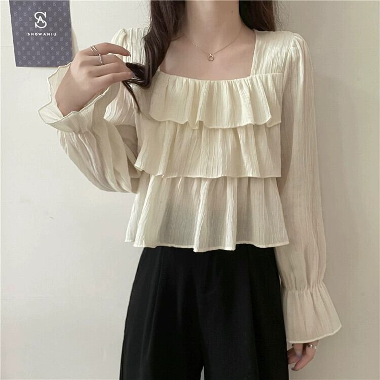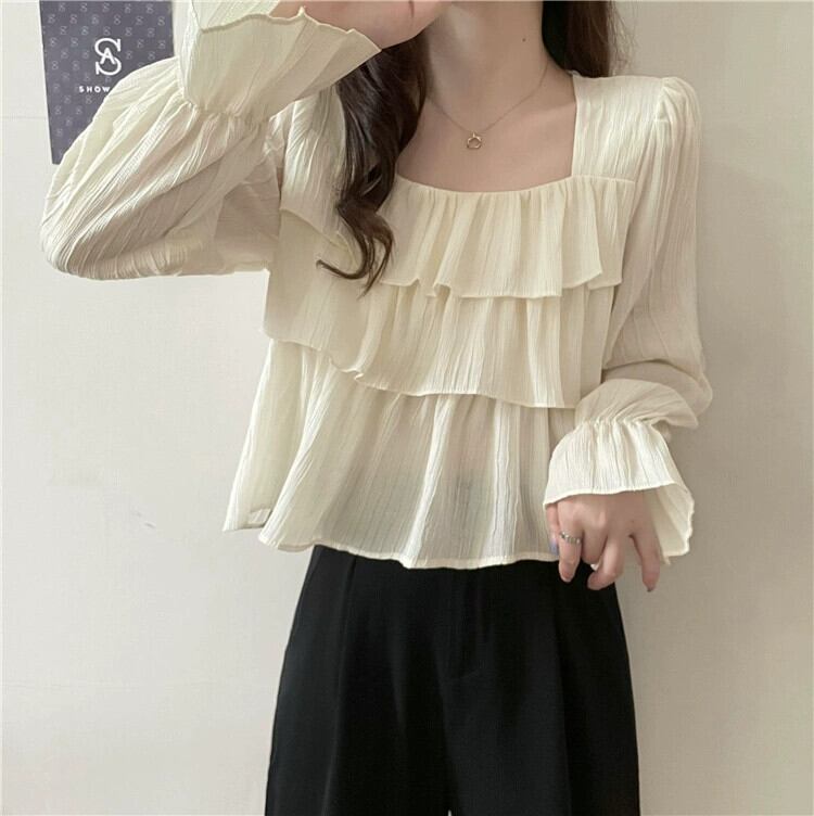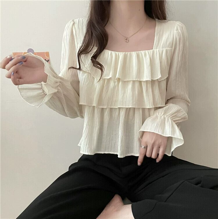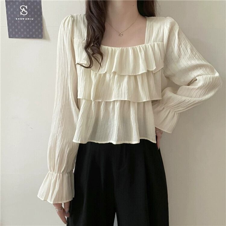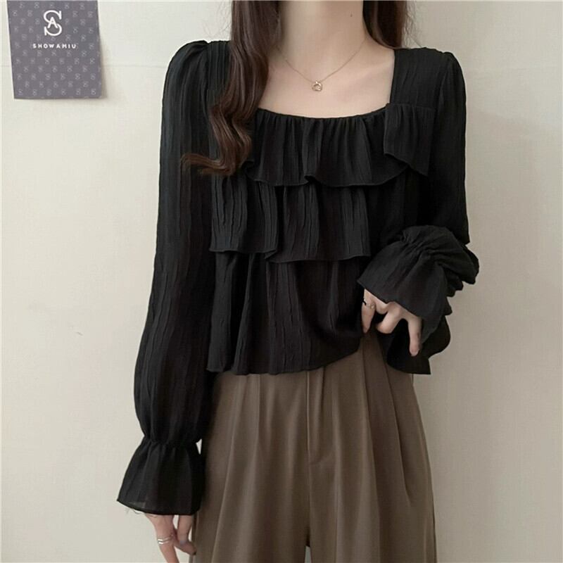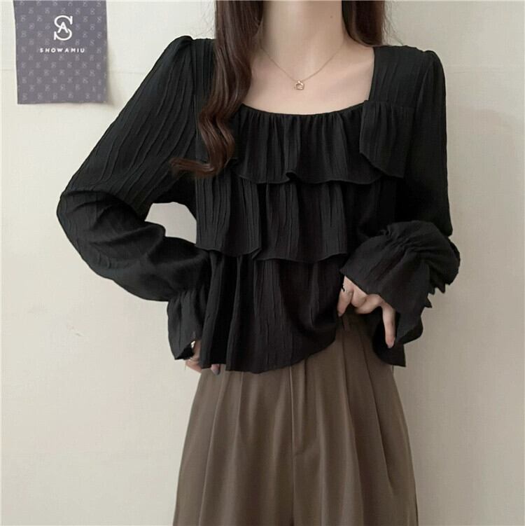 フレンチスクエアカラー長袖シャツの女性、春と秋のハイエンドデザイン、ルーズでスリム、黒のショートフリルトップ ロング ブラック スプリング 春物 オータム 秋物 スクウェア 7460098873692082 | framboise21
