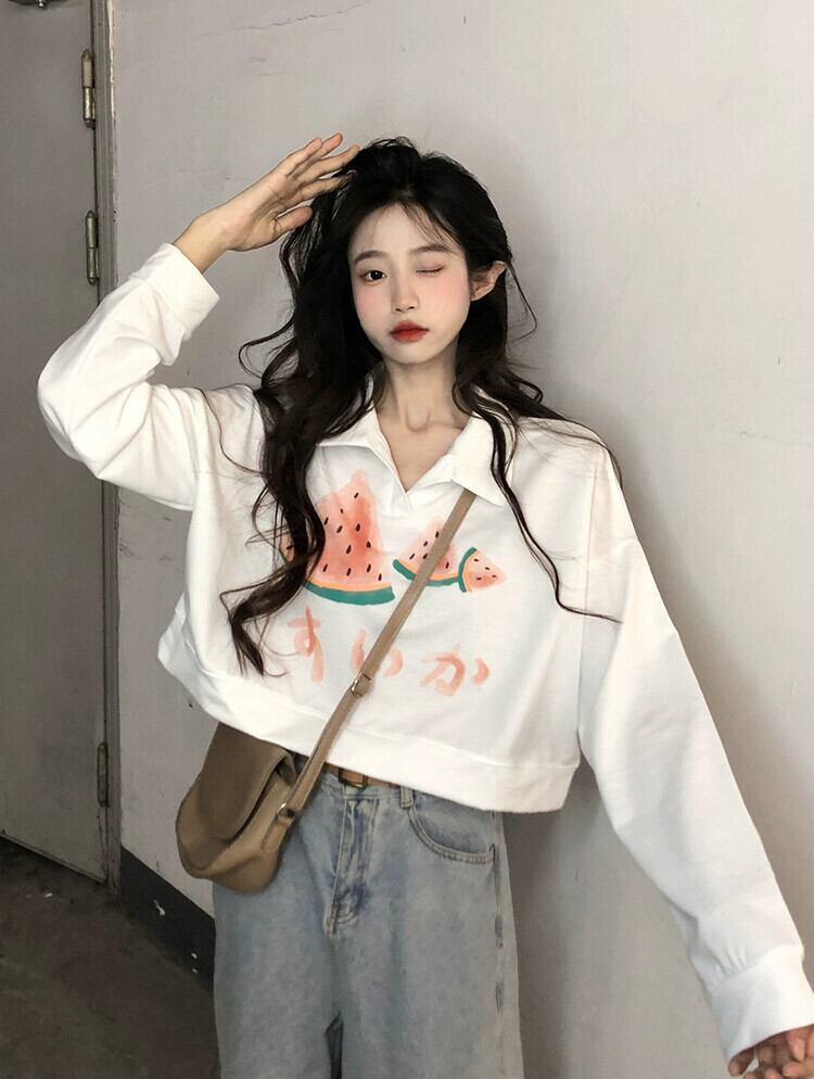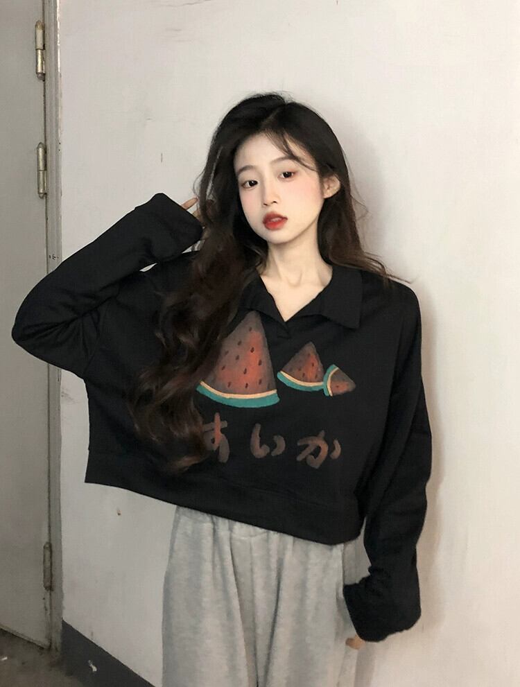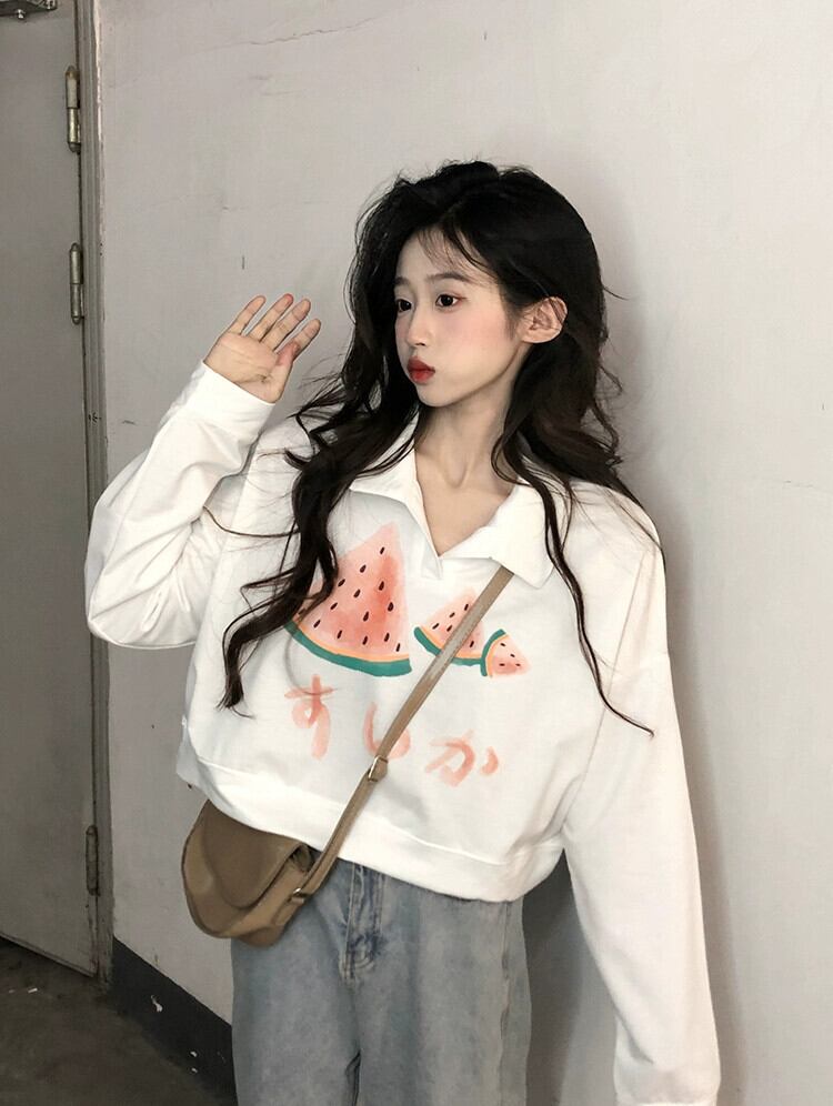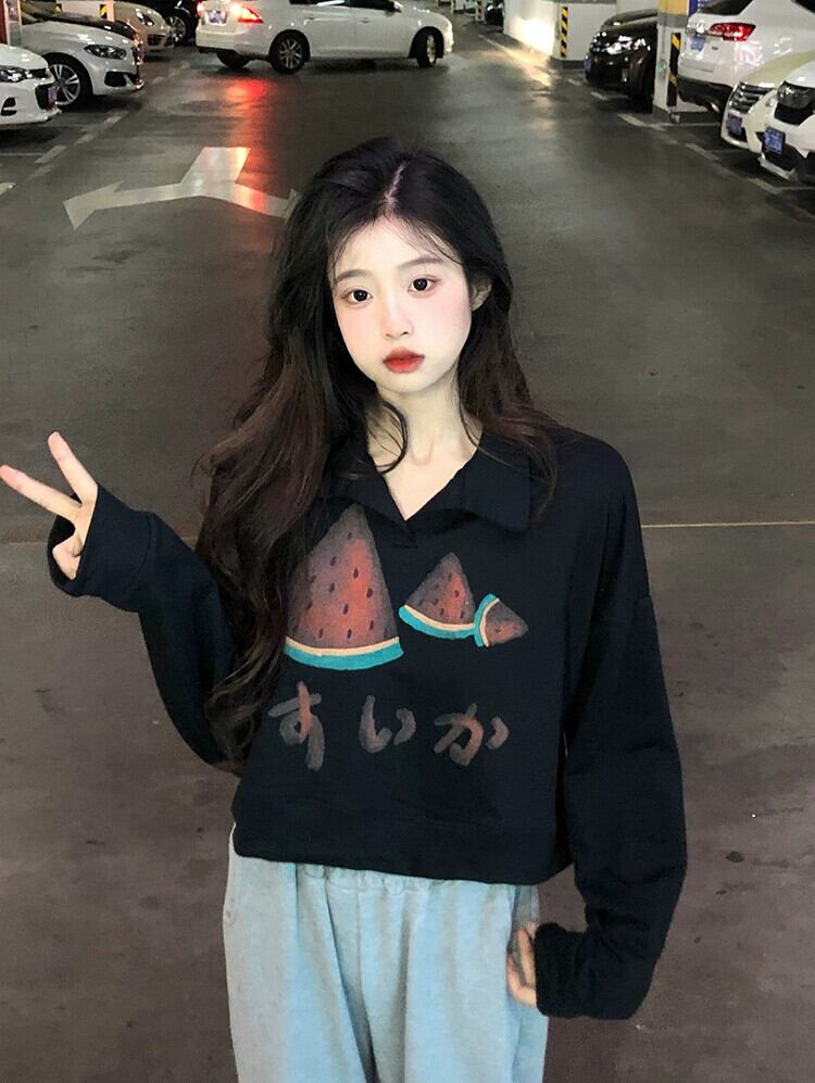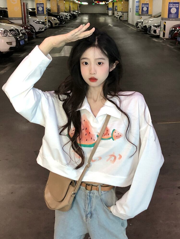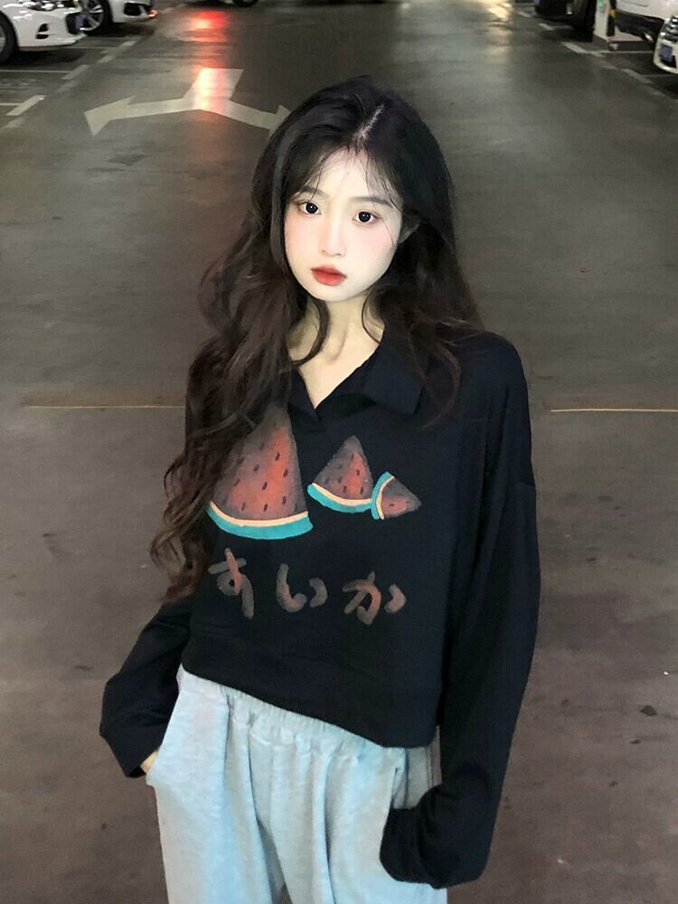 小さなショートポロカラースウェットシャツ女性の春と秋のルーズデザイン学生多用途プルオーバープリント長袖トップ ロング スプリング 春物 オータム 秋物 7460097709934090 | framboise21