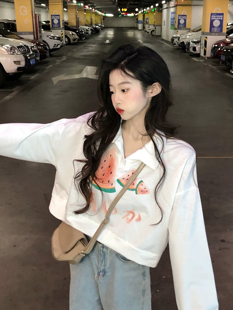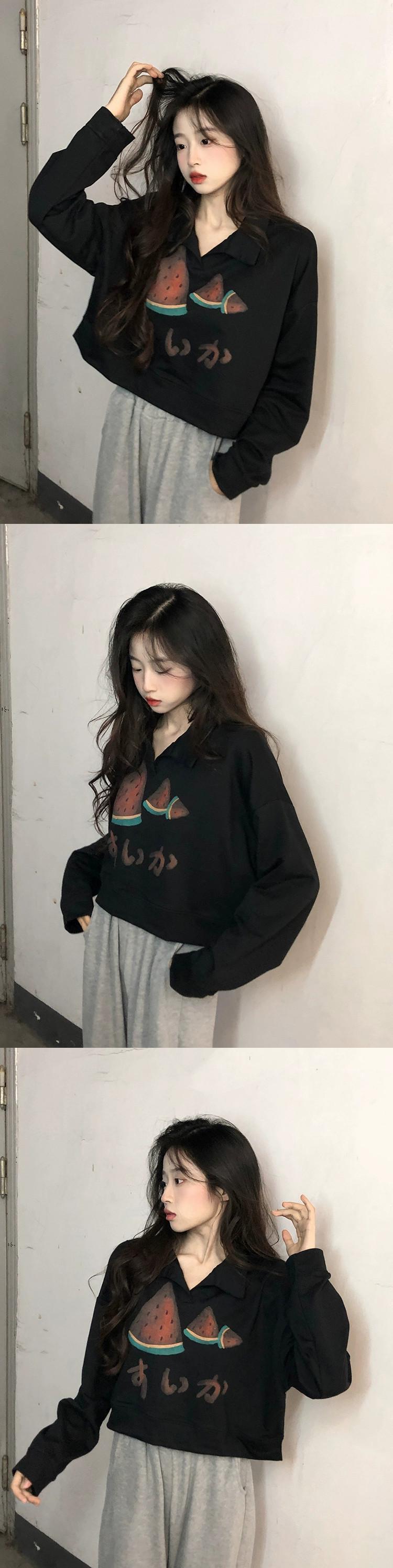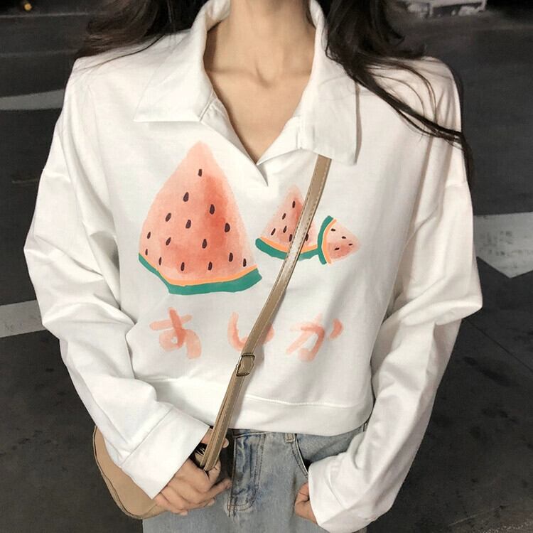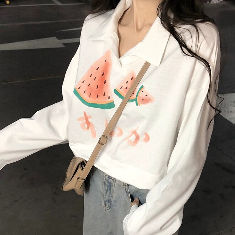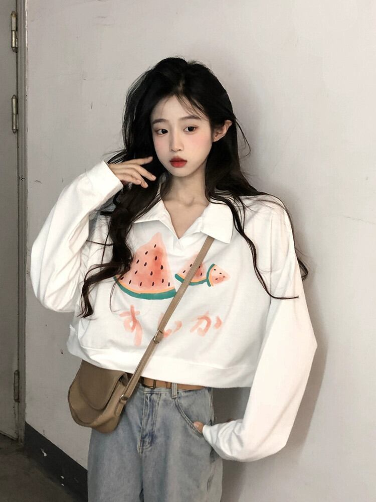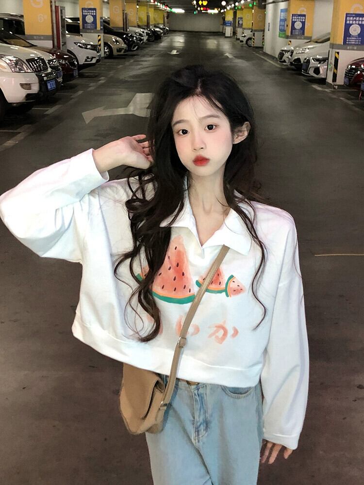 小さなショートポロカラースウェットシャツ女性の春と秋のルーズデザイン学生多用途プルオーバープリント長袖トップ ロング スプリング 春物 オータム 秋物 7460097709934090 | framboise21