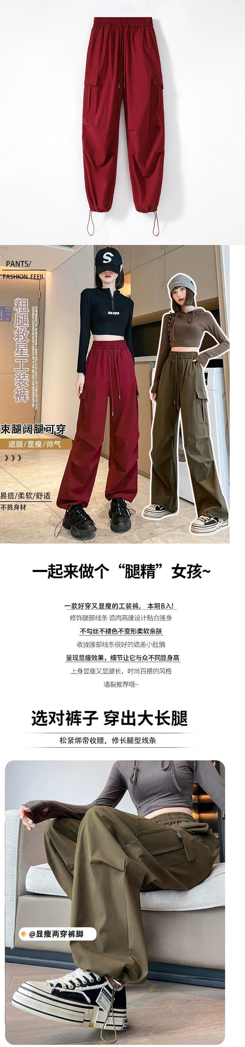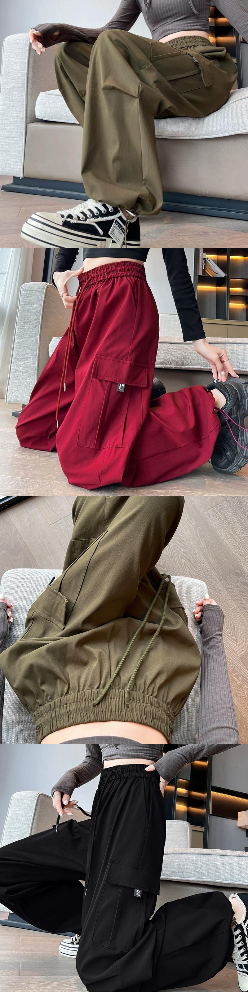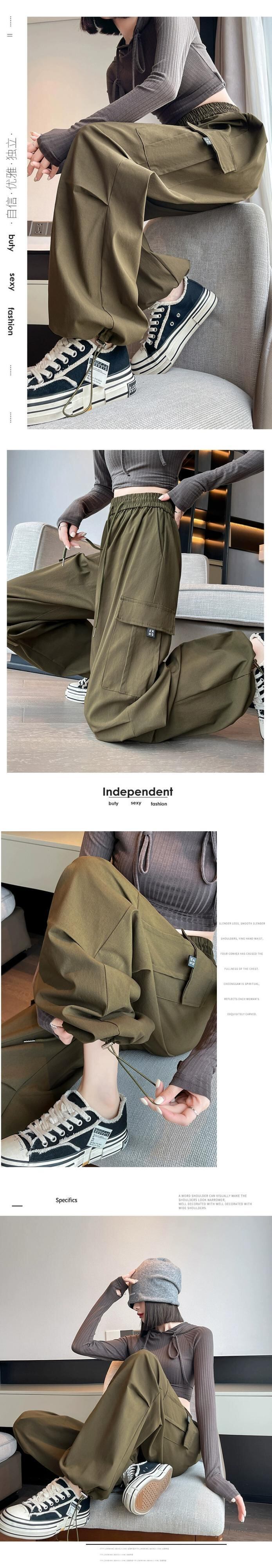 アメリカンミリタリーグリーンカーゴパンツレディース、春と秋のハイストリートドローストリングレッグスウェットパンツストレートハイウエストドレープワイドレッグパンツ ハイウェスト スプリング 春物 オータム 秋物 ワイドパンツ 7460066946740478 | framboise21