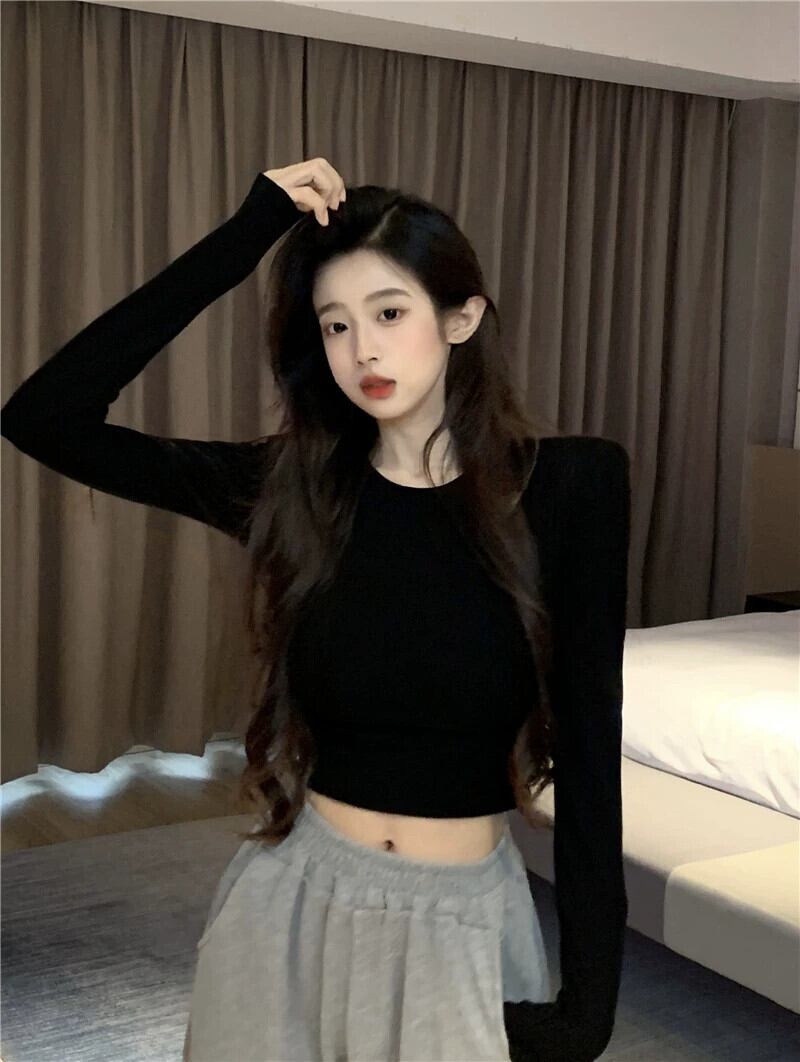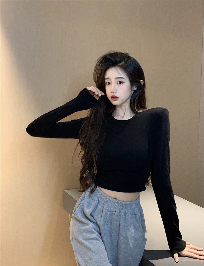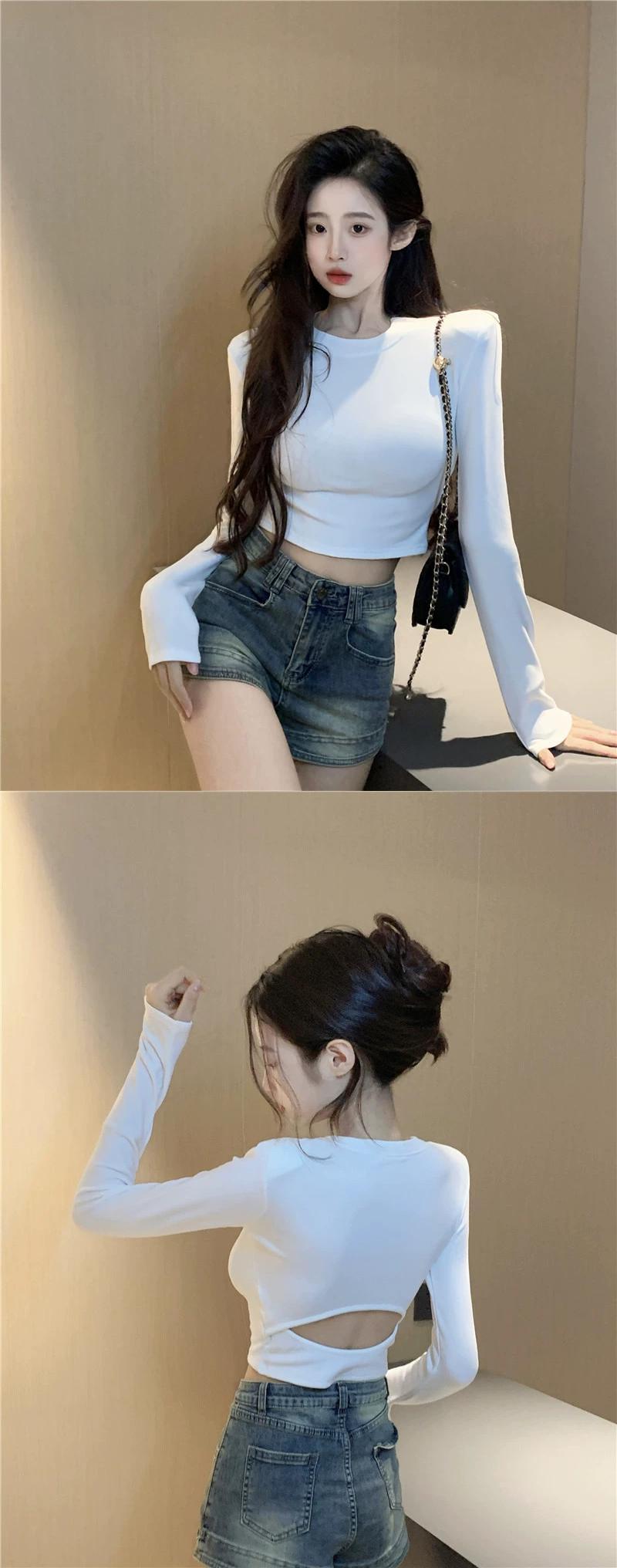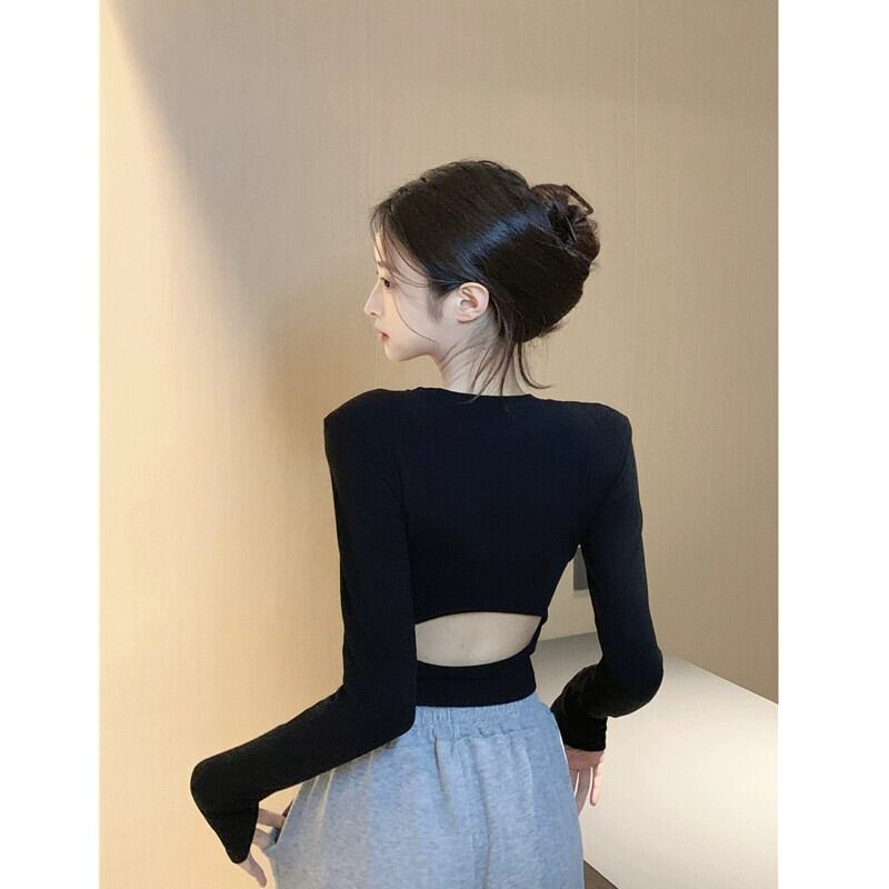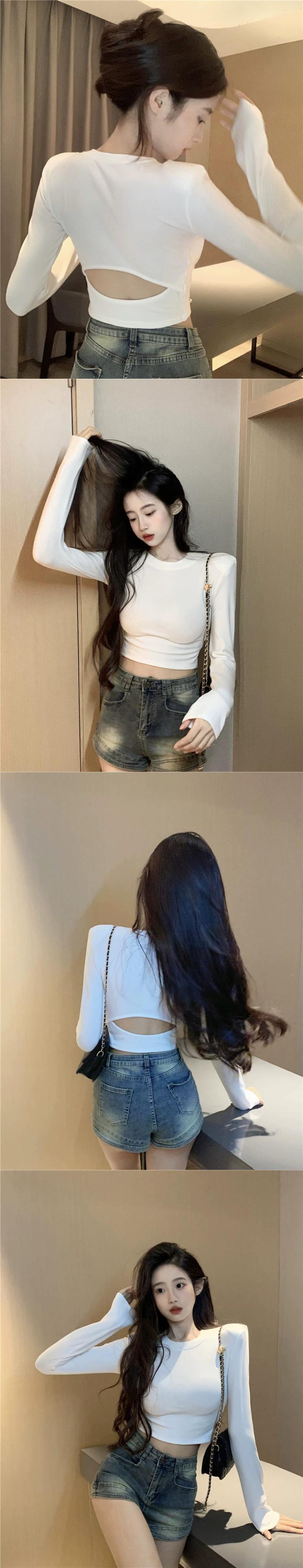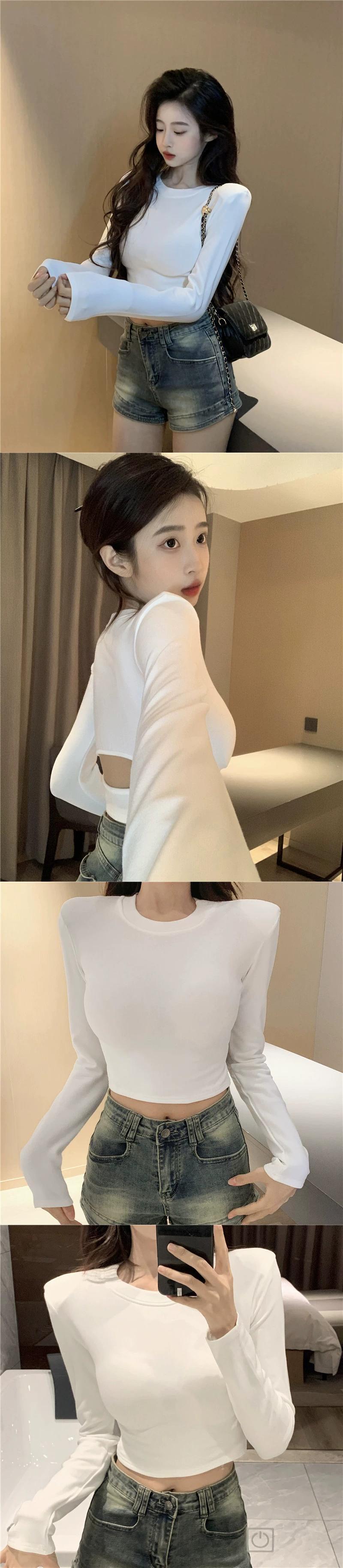 春と秋のデザインの背中の開いた中空ハイウエストショートクロップトップ女性スリムフィットインナーボトム長袖Tシャツ ロング スプリング 春物 オータム 秋物 7460072424718255 | framboise21