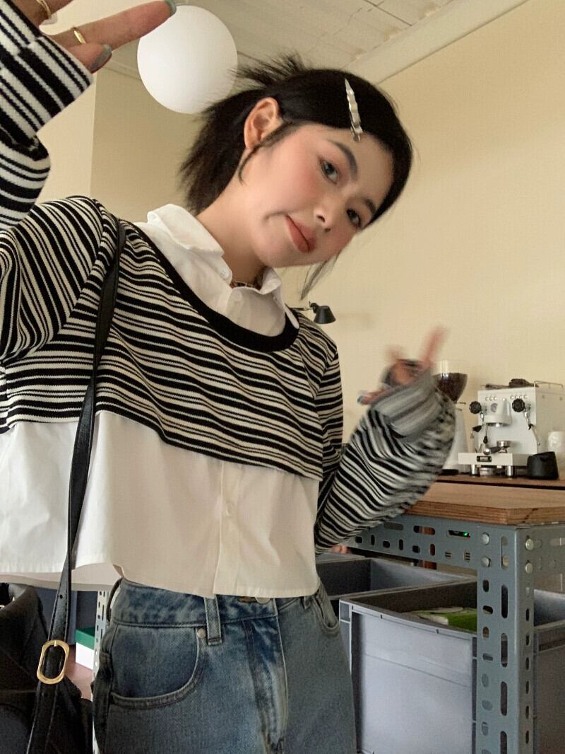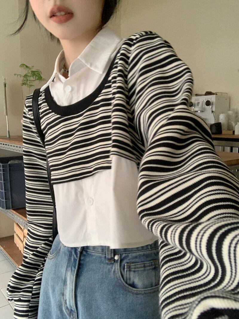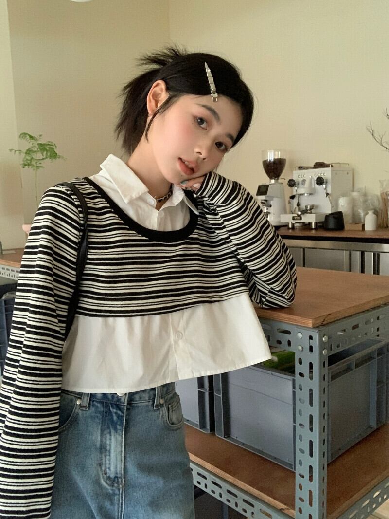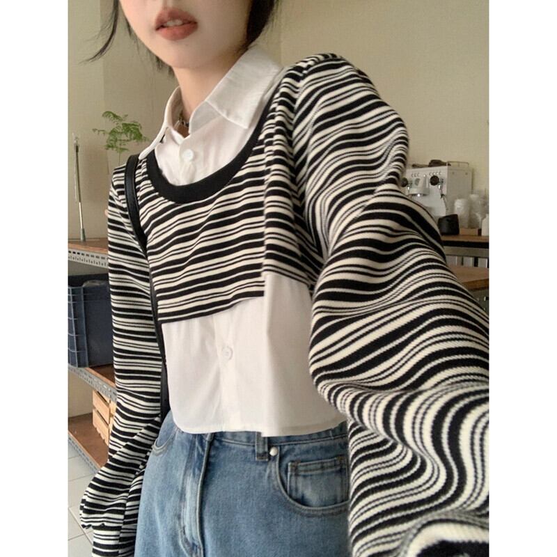 偽ツーピースストライプポロカラースウェットシャツ女性の春と秋の2023新しい人気デザインショートトップ小人 スプリング 春物 オータム 秋物 7460094248169028 | framboise21