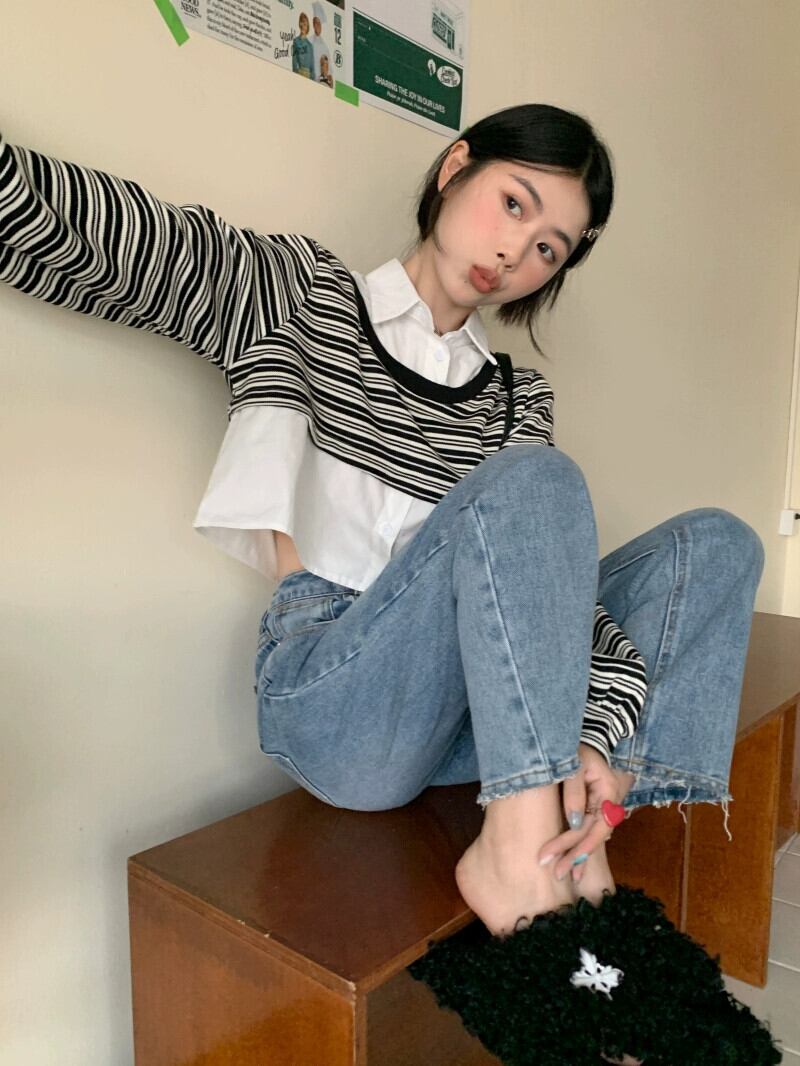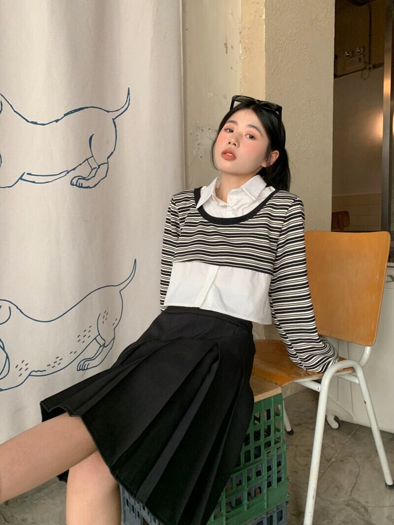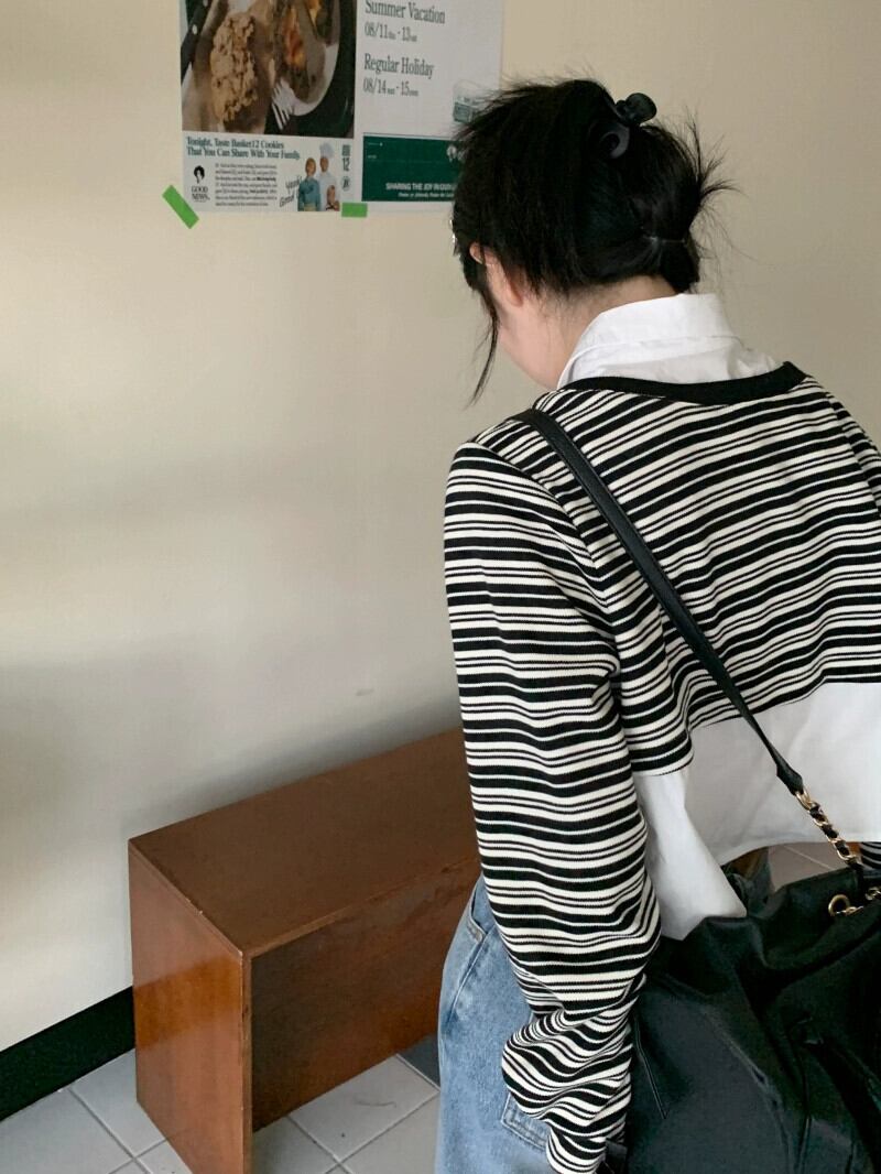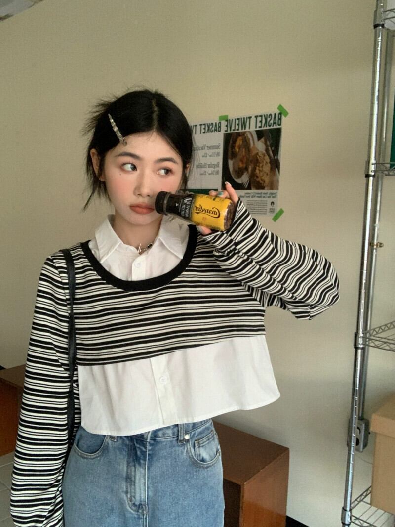 偽ツーピースストライプポロカラースウェットシャツ女性の春と秋の2023新しい人気デザインショートトップ小人 スプリング 春物 オータム 秋物 7460094248169028 | framboise21
