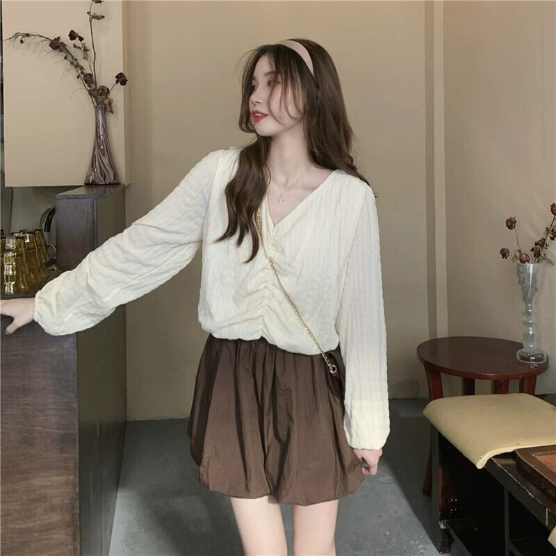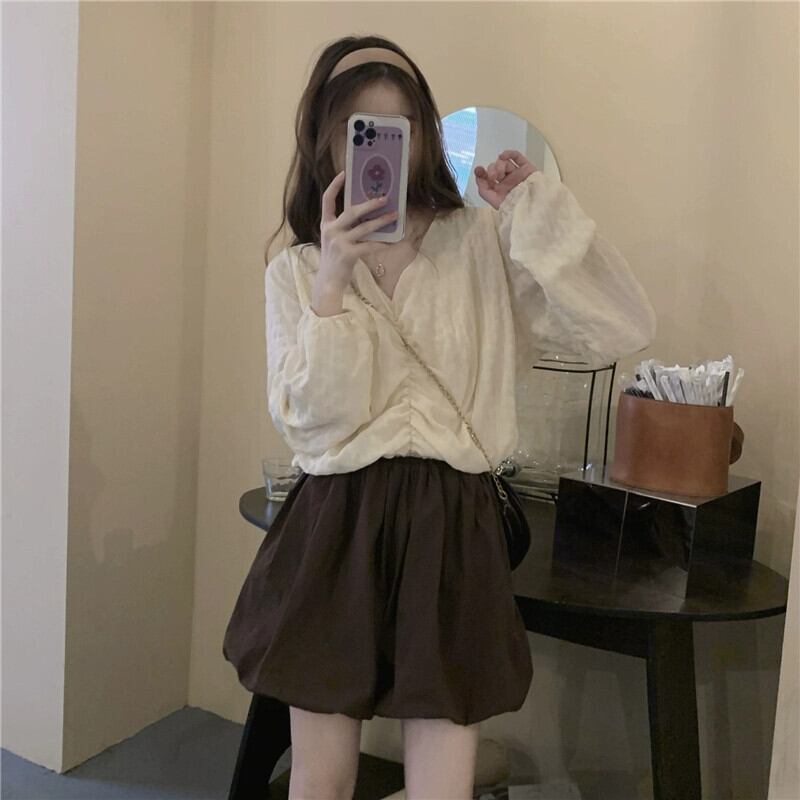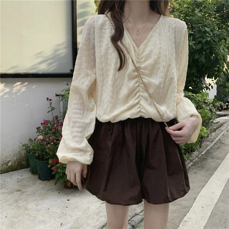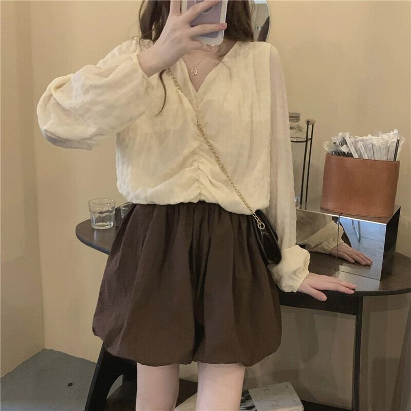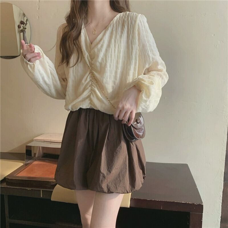 パフスリーブシャツレディース2023春秋新作フレンチデザインゆったり万能ショートVネック長袖トップス ロング スプリング 春物 オータム 秋物 7460082916051873 | framboise21
