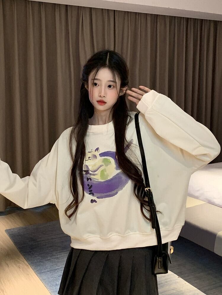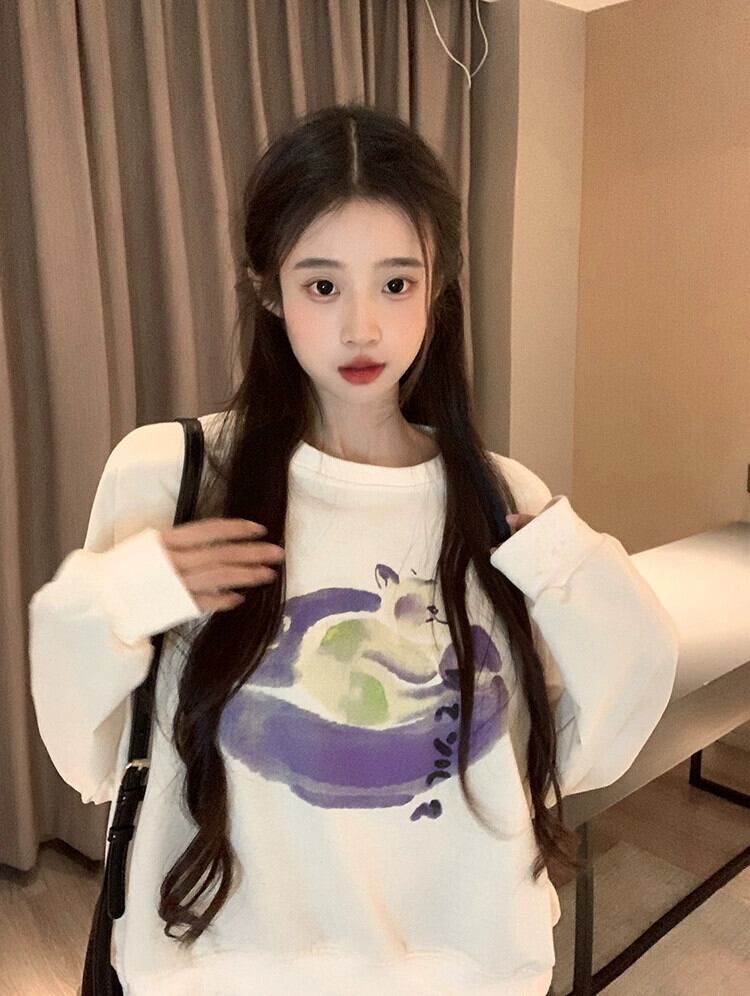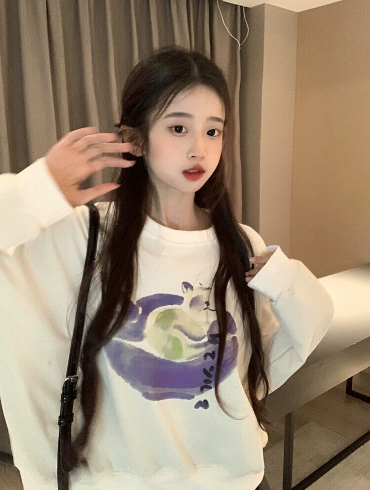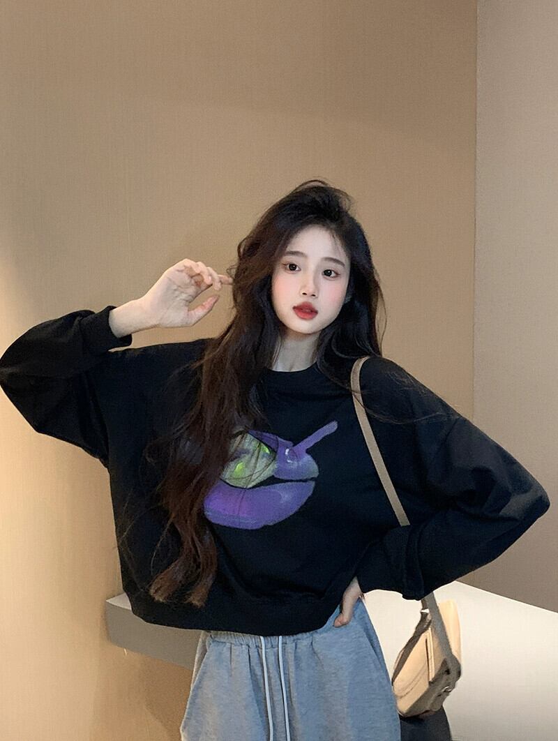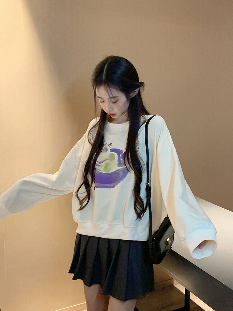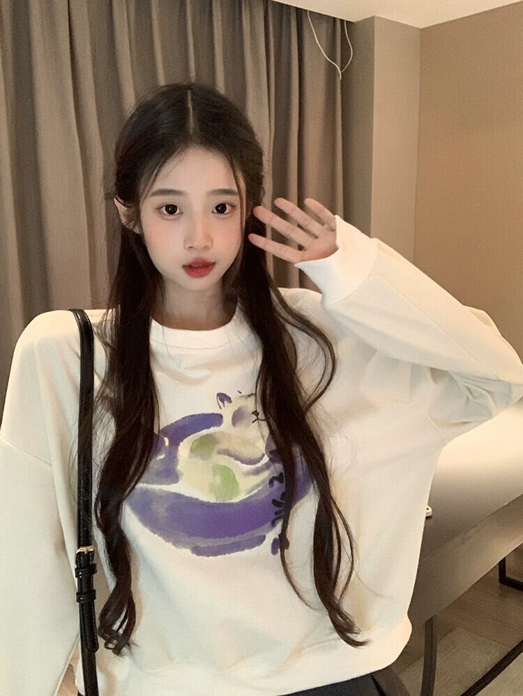 漫画プリントショートトレーナー女性春と秋 2023 新しいスタイルルーズスタイルデザインラウンドネック長袖トップ ロング スプリング 春物 オータム 秋物 Oネック 7460077110033491 | framboise21