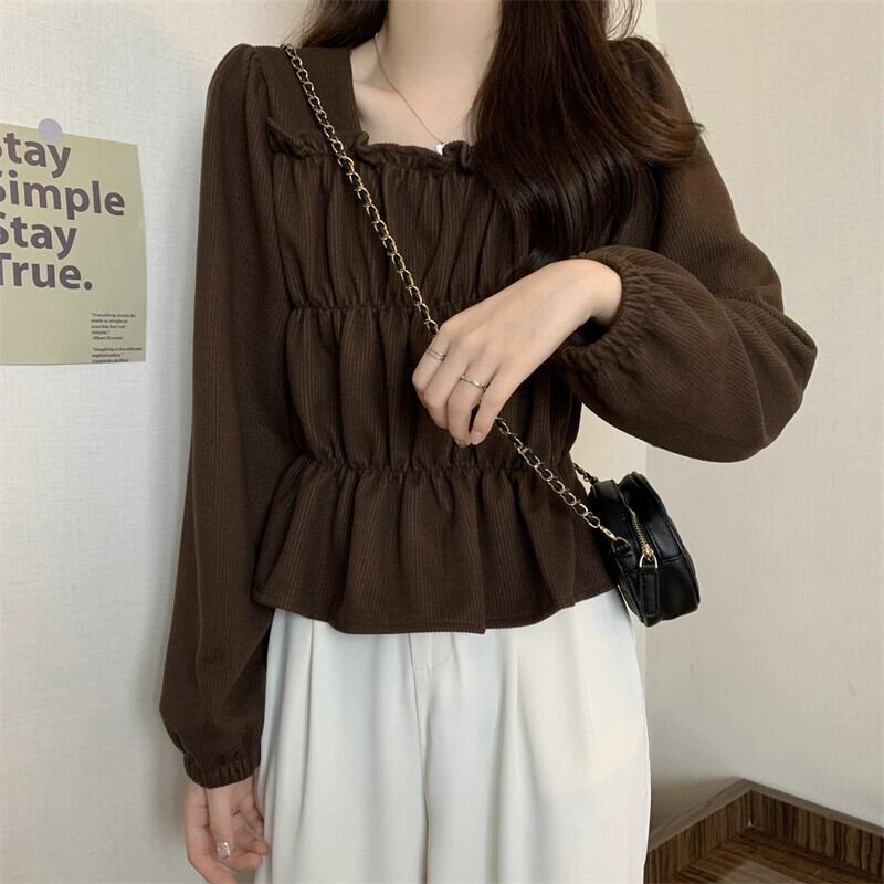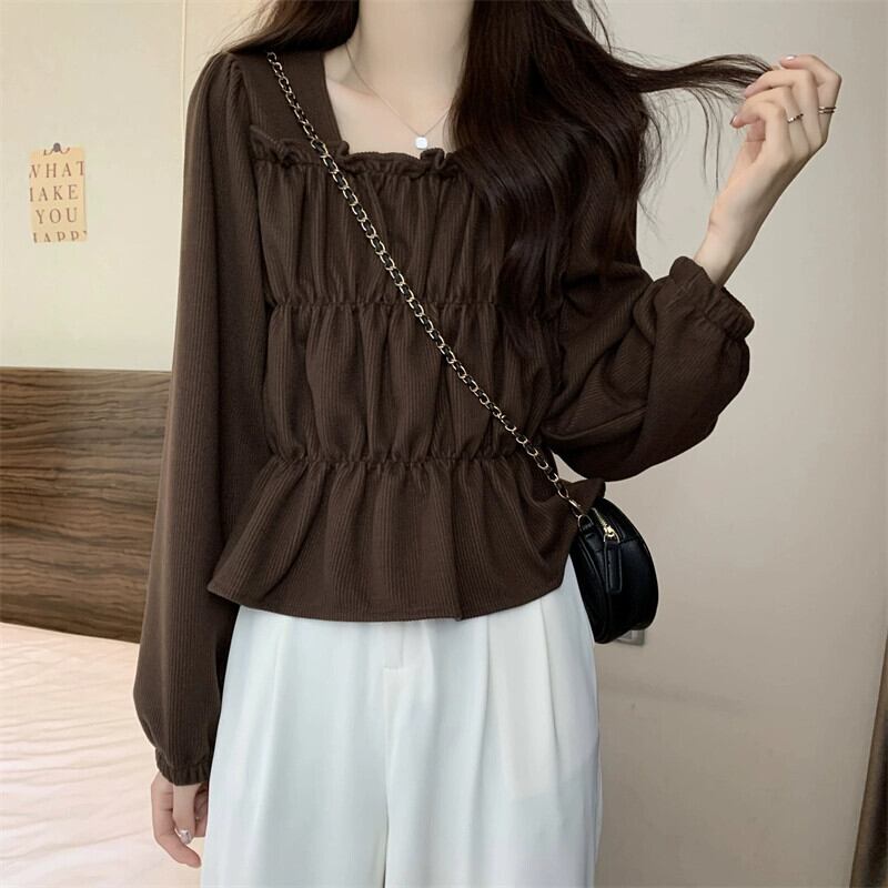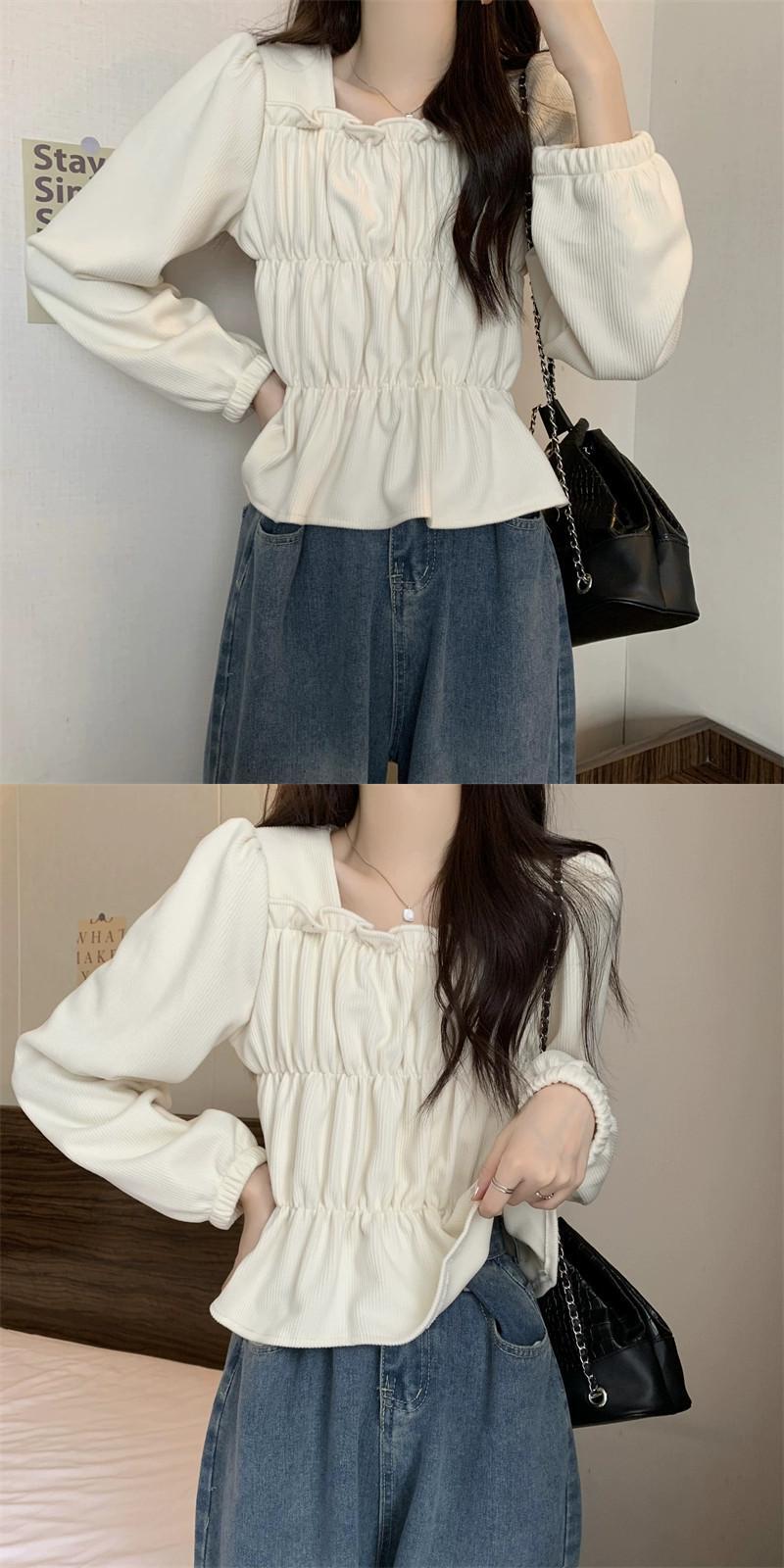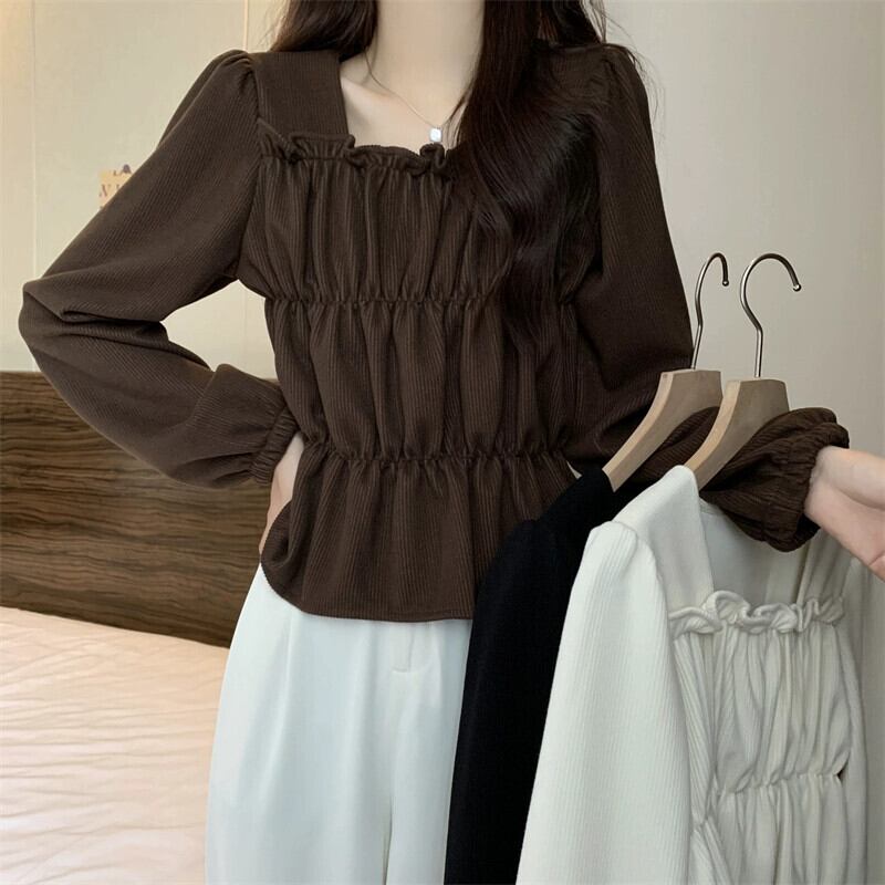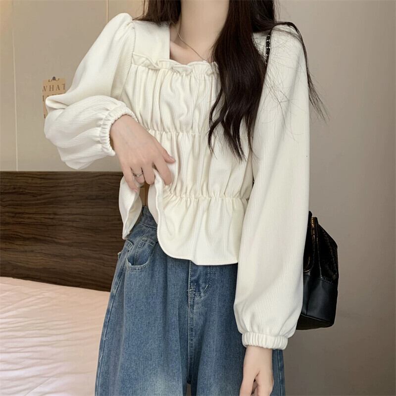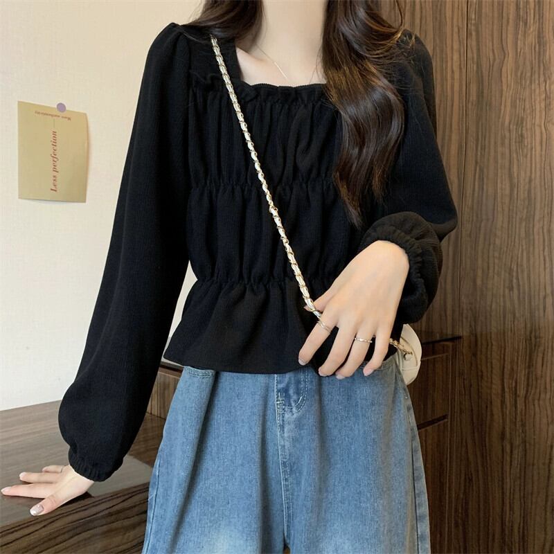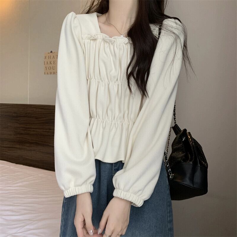 ショートスクエアネックパフスリーブシャツレディース、春と秋のフランスのレトロなデザイン、ゆったりとスリムなプリーツ長袖トップ ロング スプリング 春物 オータム 秋物 スクウェア 7460046385803354 | framboise21