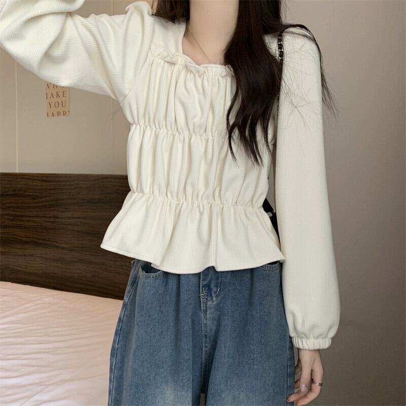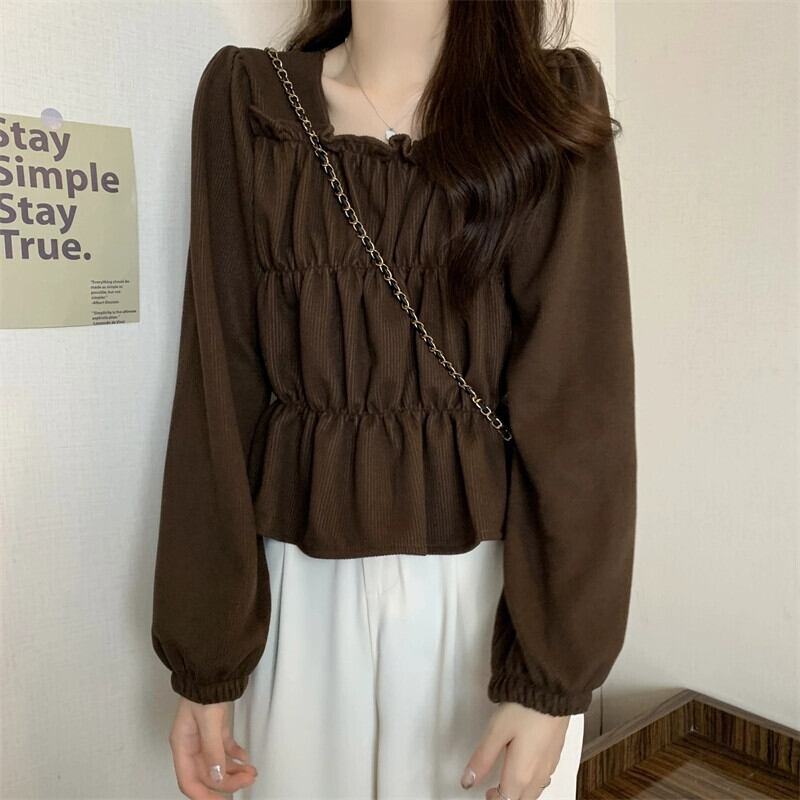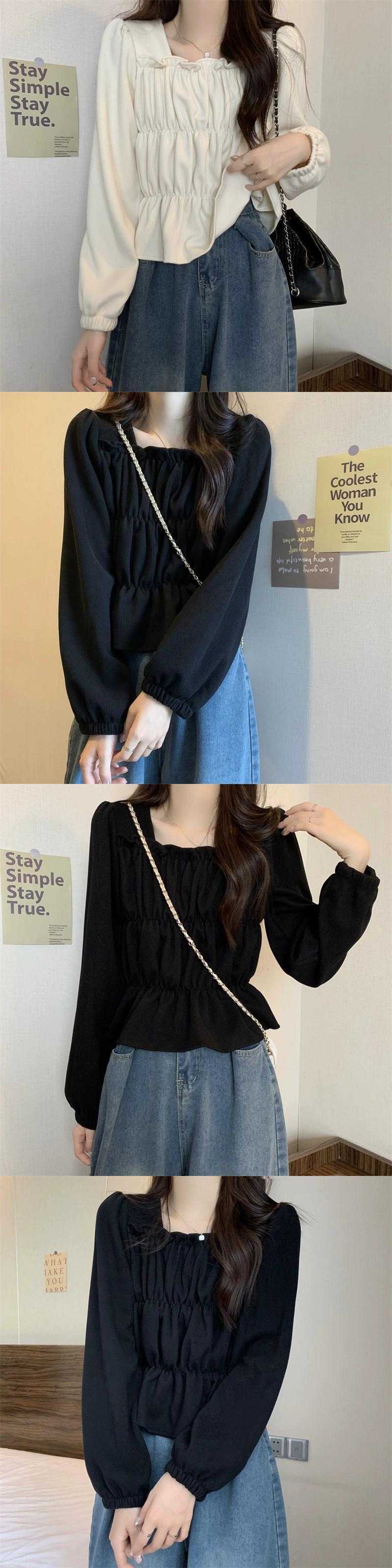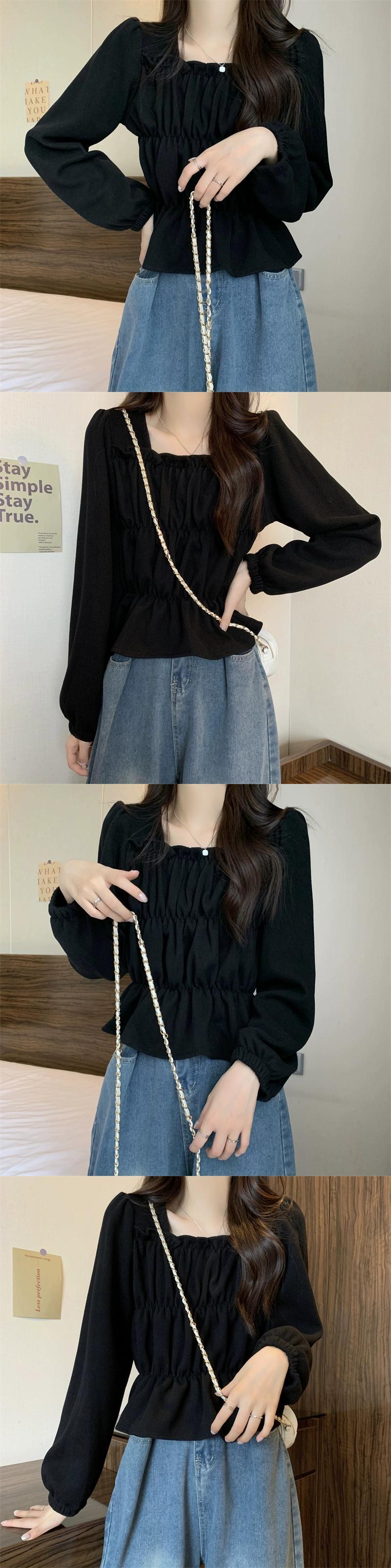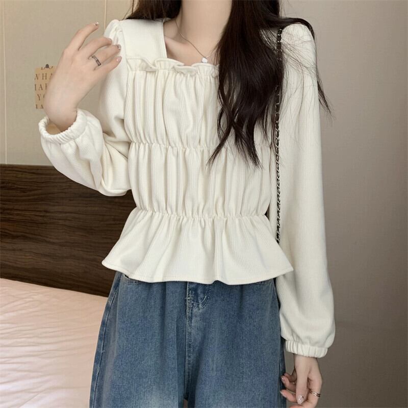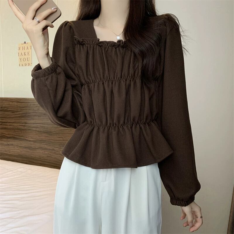 ショートスクエアネックパフスリーブシャツレディース、春と秋のフランスのレトロなデザイン、ゆったりとスリムなプリーツ長袖トップ ロング スプリング 春物 オータム 秋物 スクウェア 7460046385803354 | framboise21