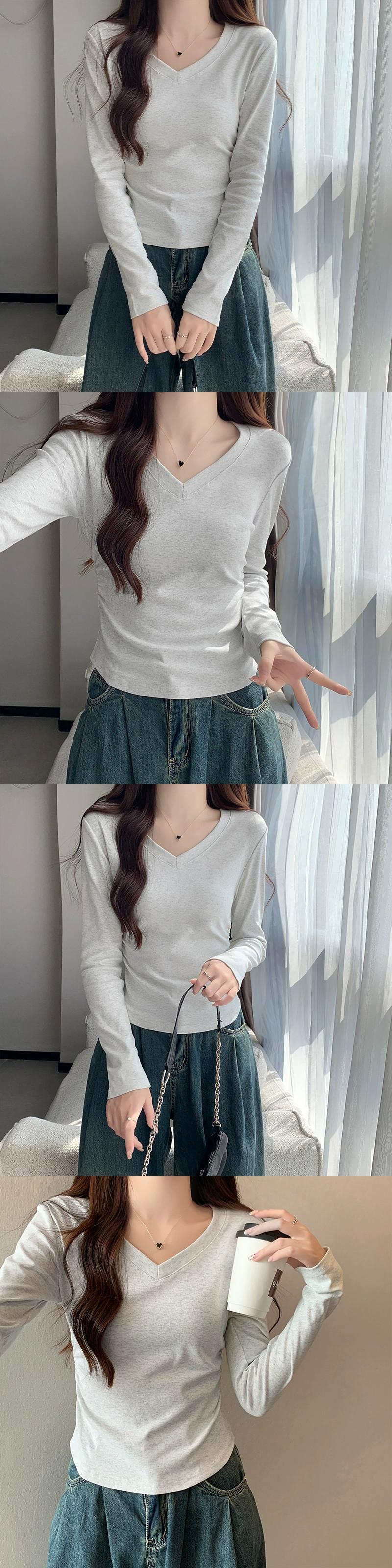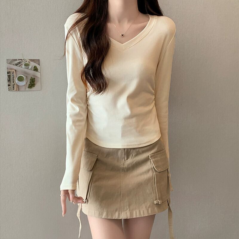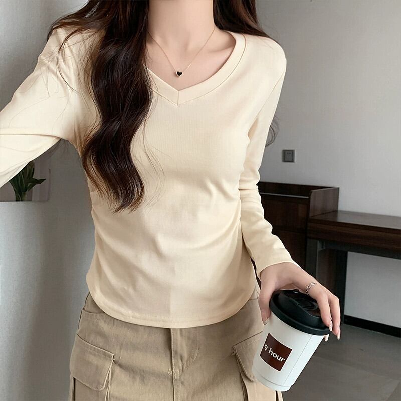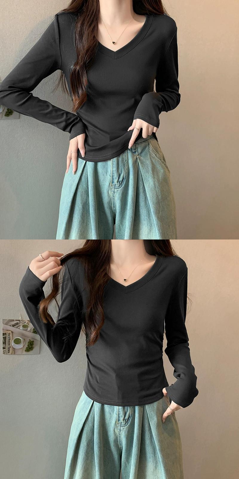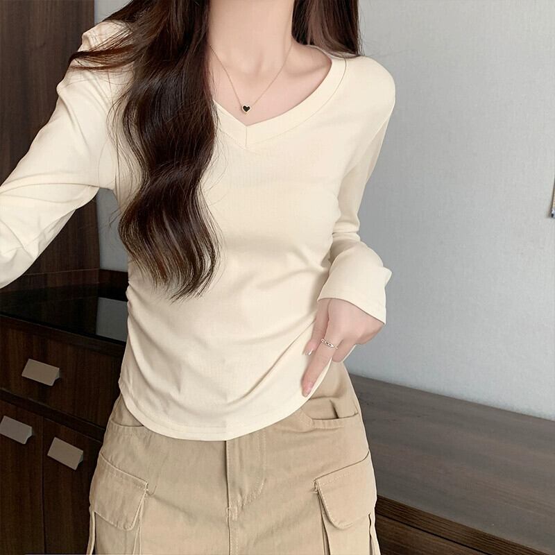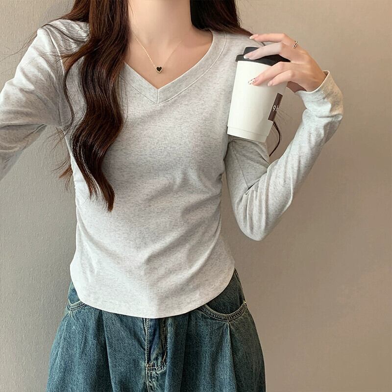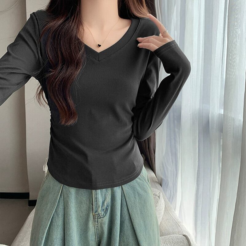 春と秋の純綿 V ネック長袖 T シャツの女性、ファッショナブルでファッショナブル、スリムでスリム、ショート プリーツ ボトム トップ ロング コットン スプリング 春物 オータム 秋物 Vネック Tシャツ 7460074742643807 | framboise21