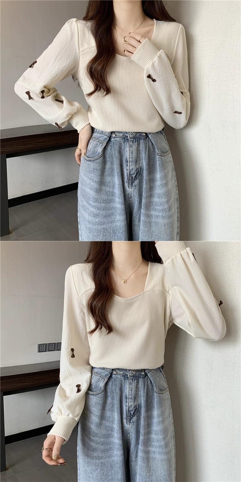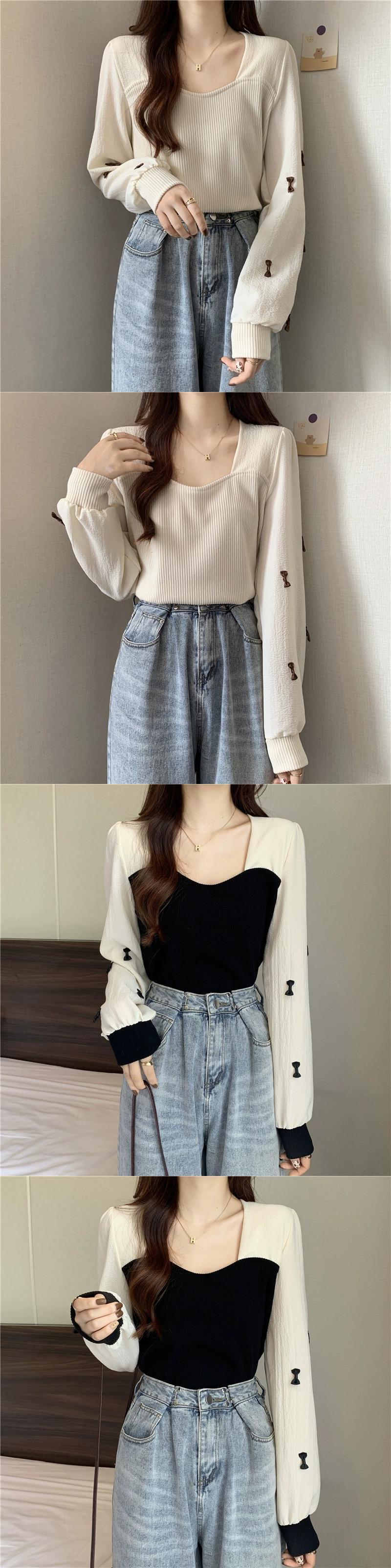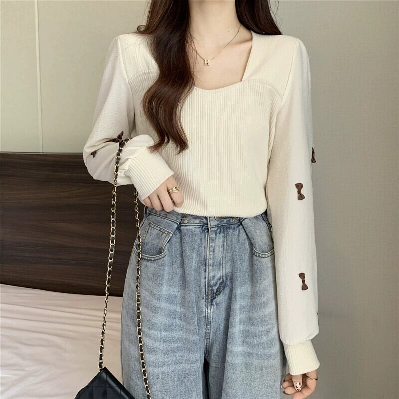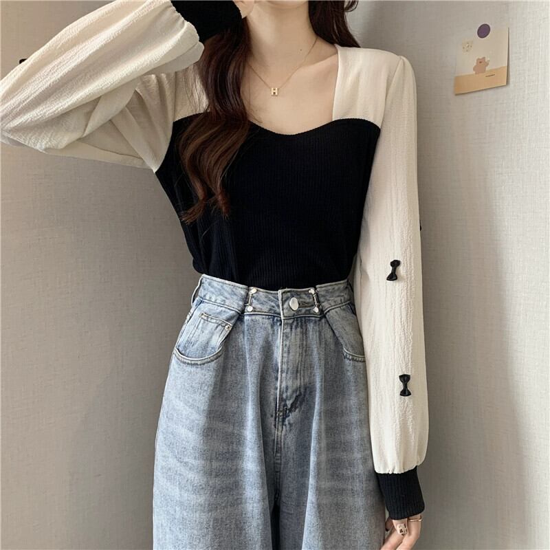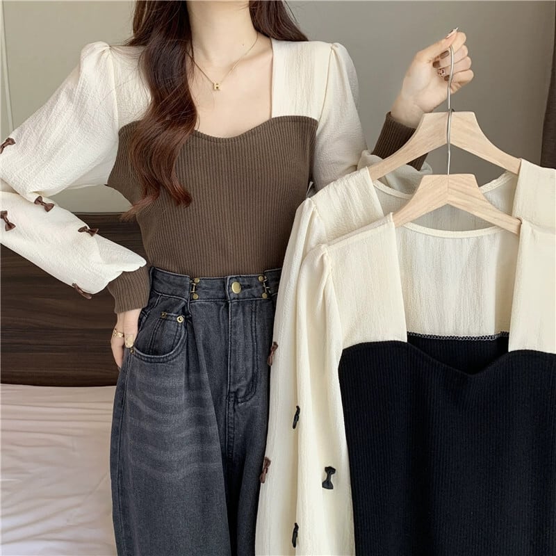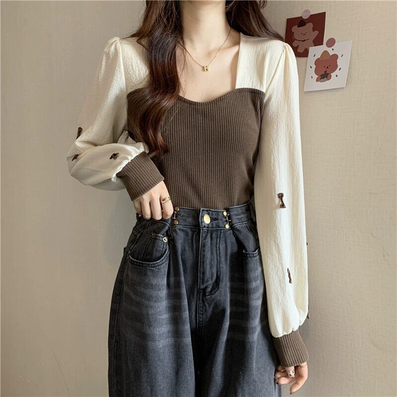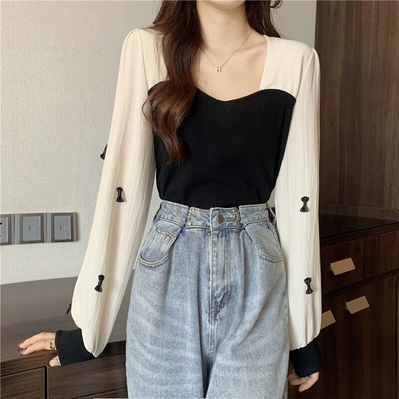 スプライスフェイクツーピーススクエアカラーシャツ女性の春と秋の 2023 新作フレンチデザインショート長袖ニットトップ ロング スプリング 春物 オータム 秋物 スクウェア 7460094783763511 | framboise21