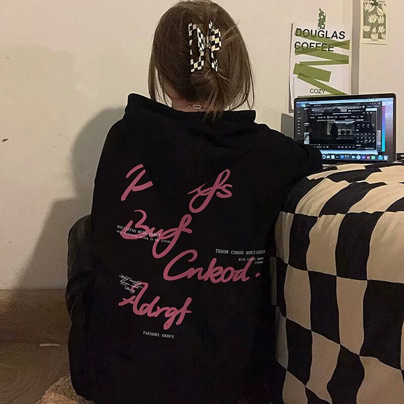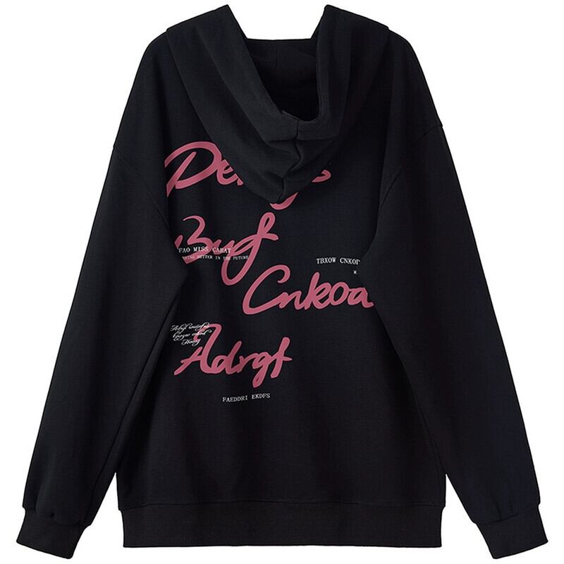 黒のプルオーバーフード付きスウェットシャツの女性 2023 新スタイル春と秋の怠惰なデザインオーバーサイズプリントトップ ブラック スプリング 春物 オータム 秋物 7460087123849251 | framboise21