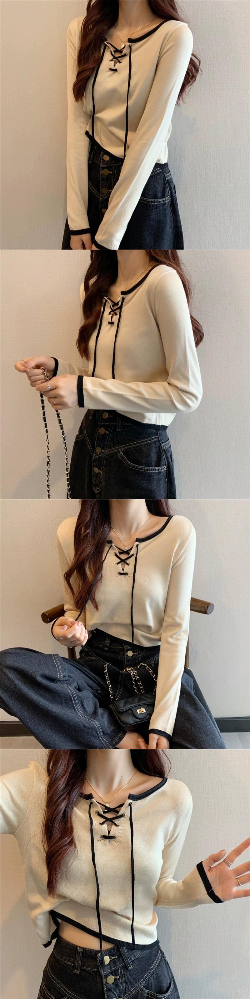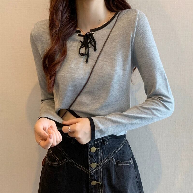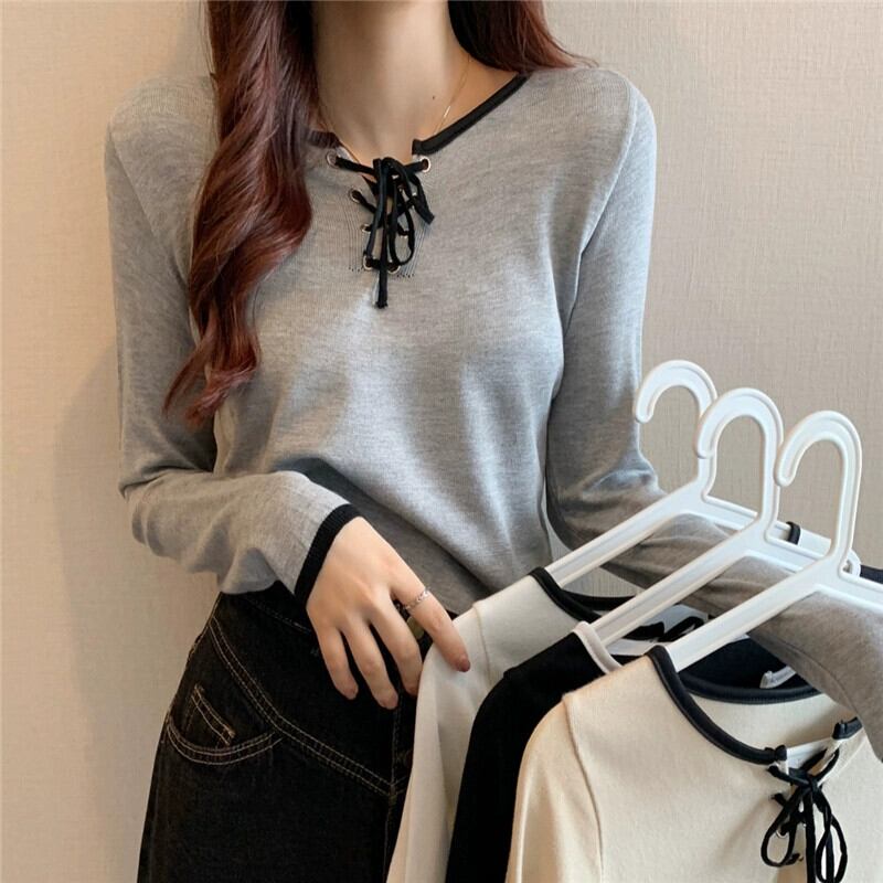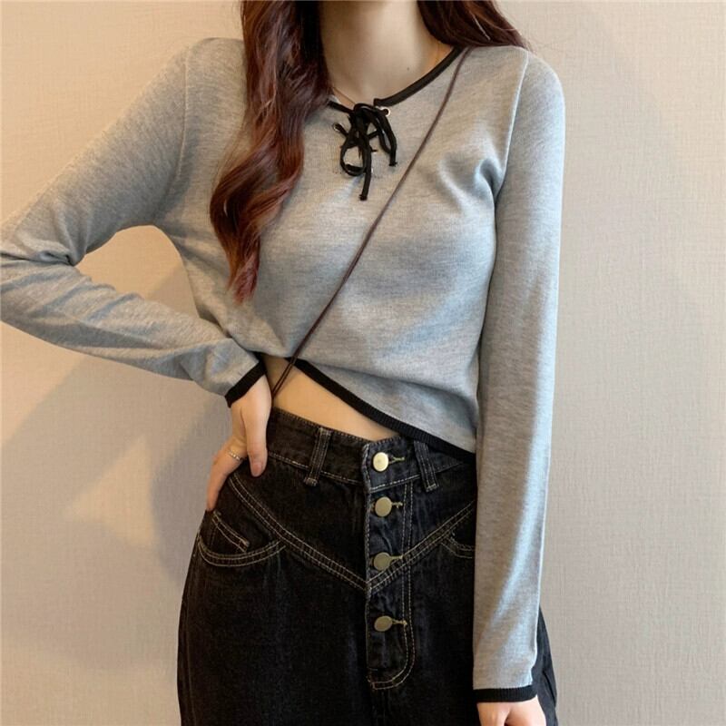 秋と冬のレースアップVネック長袖ボトリングシャツ女性、ファッショナブルで西洋風のデザイン、短いニットセーターとスリムフィット ショート ロング オータム 秋物 ウィンター 冬物 7460069197360339 | framboise21