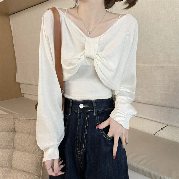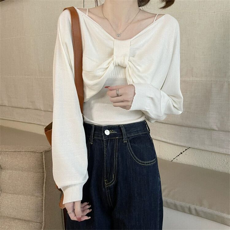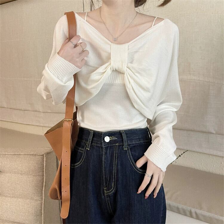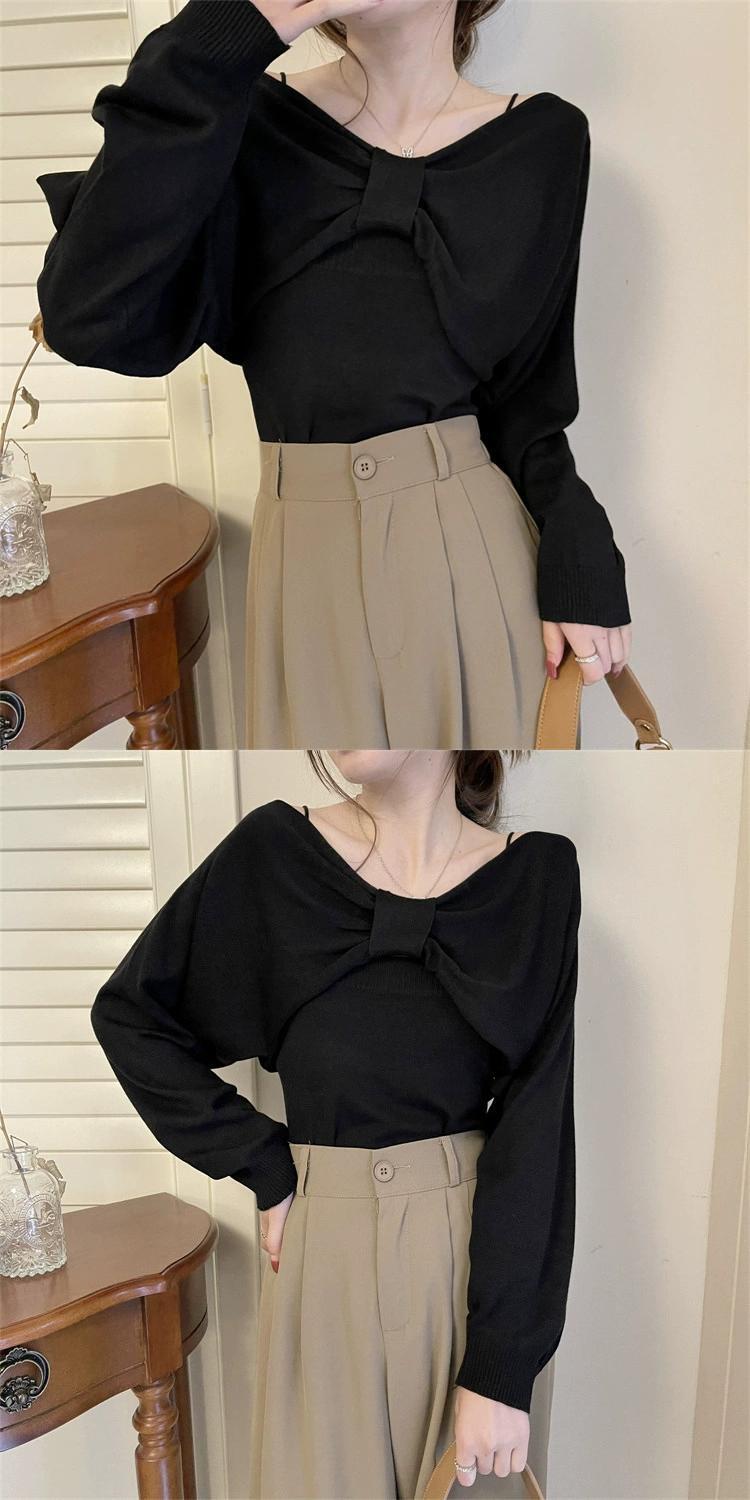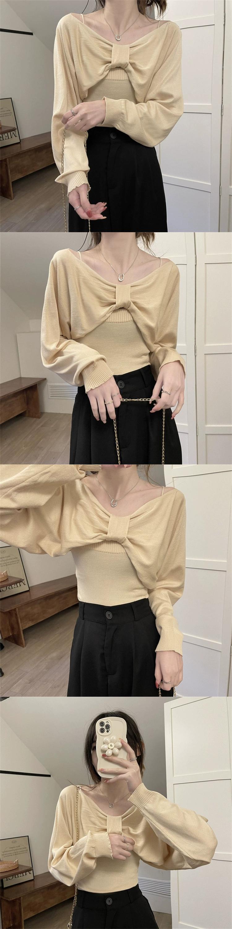 リボン長袖ニットトップ女性、春と秋のハイエンドデザイン、スリムフィットショートワンラインカラーボトムシャツトレンディ ロング スプリング 春物 オータム 秋物 7460018850176113 | framboise21