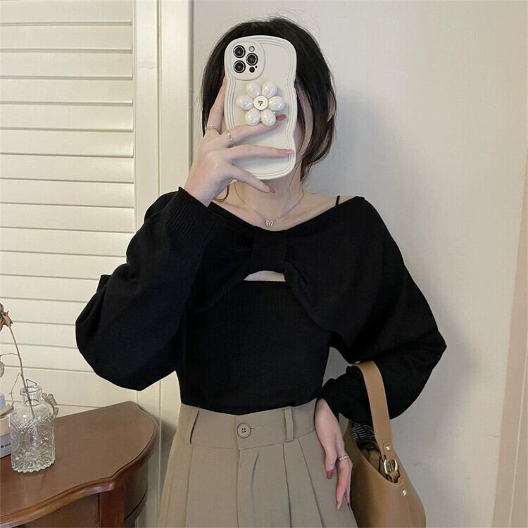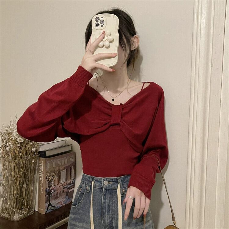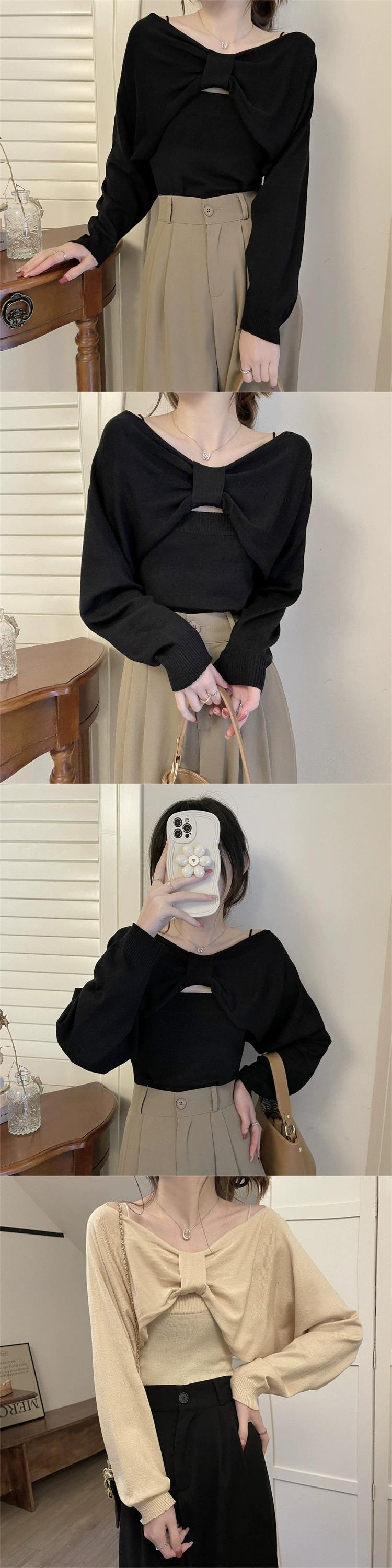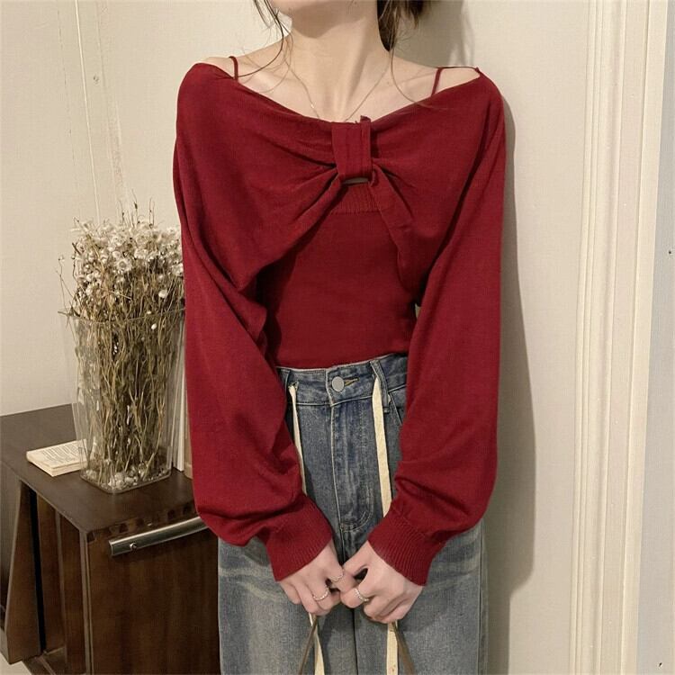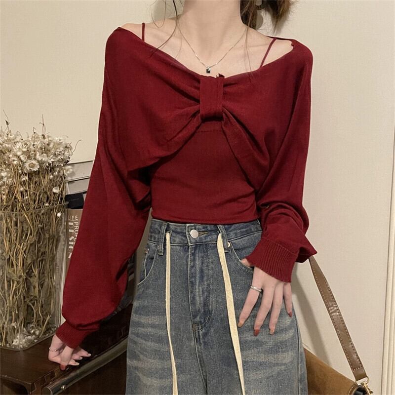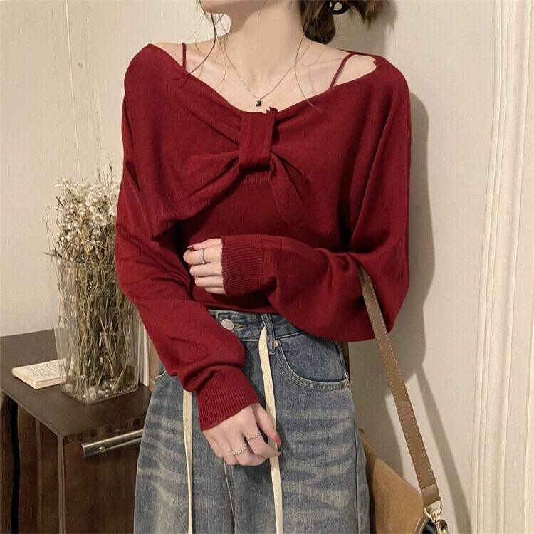 リボン長袖ニットトップ女性、春と秋のハイエンドデザイン、スリムフィットショートワンラインカラーボトムシャツトレンディ ロング スプリング 春物 オータム 秋物 7460018850176113 | framboise21