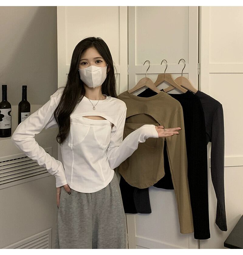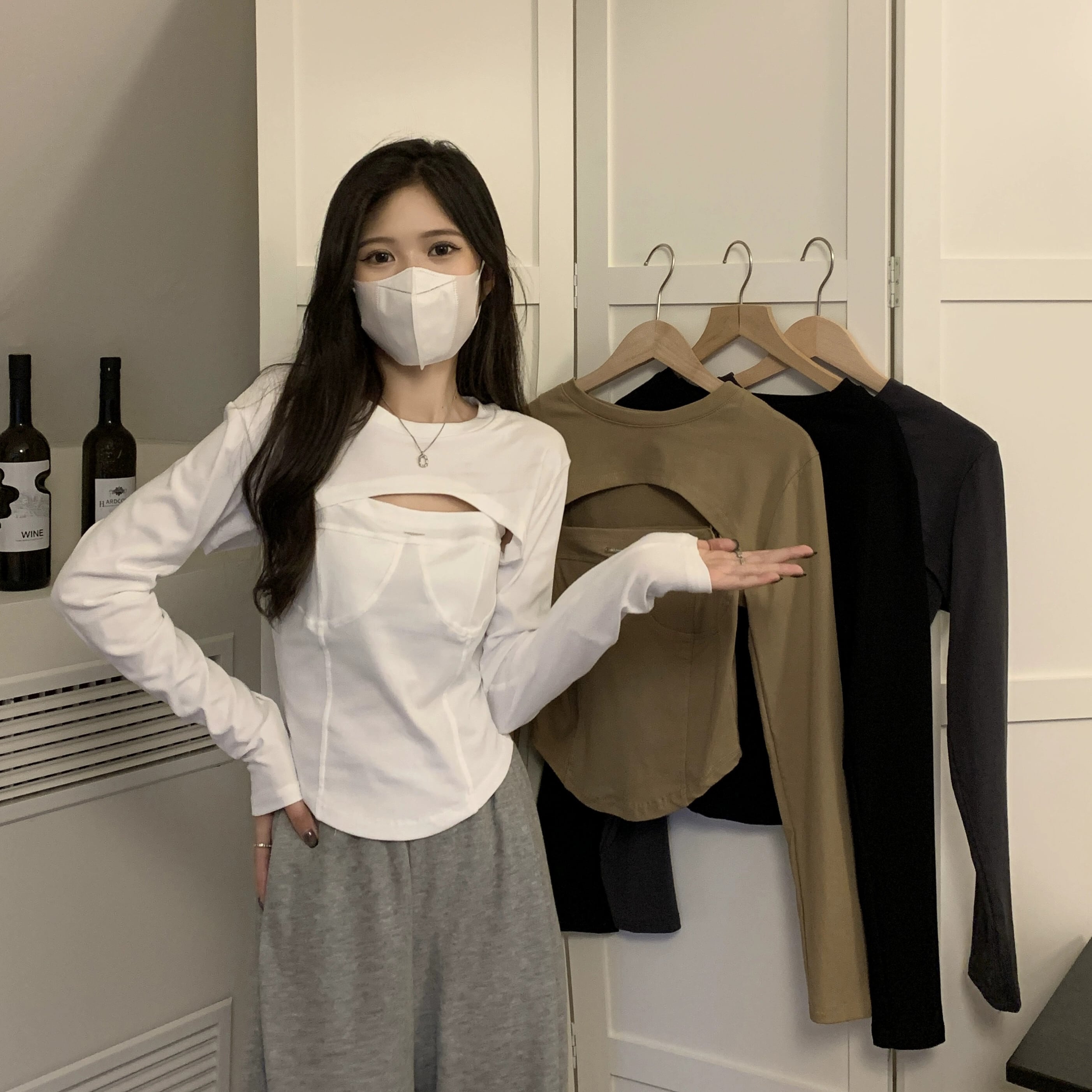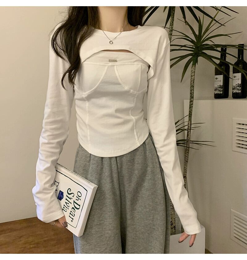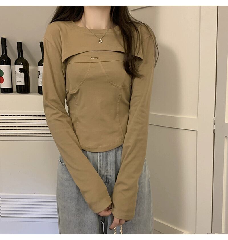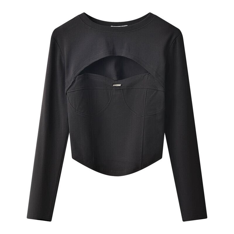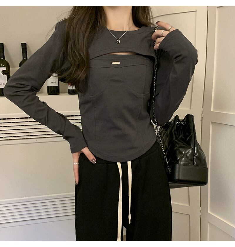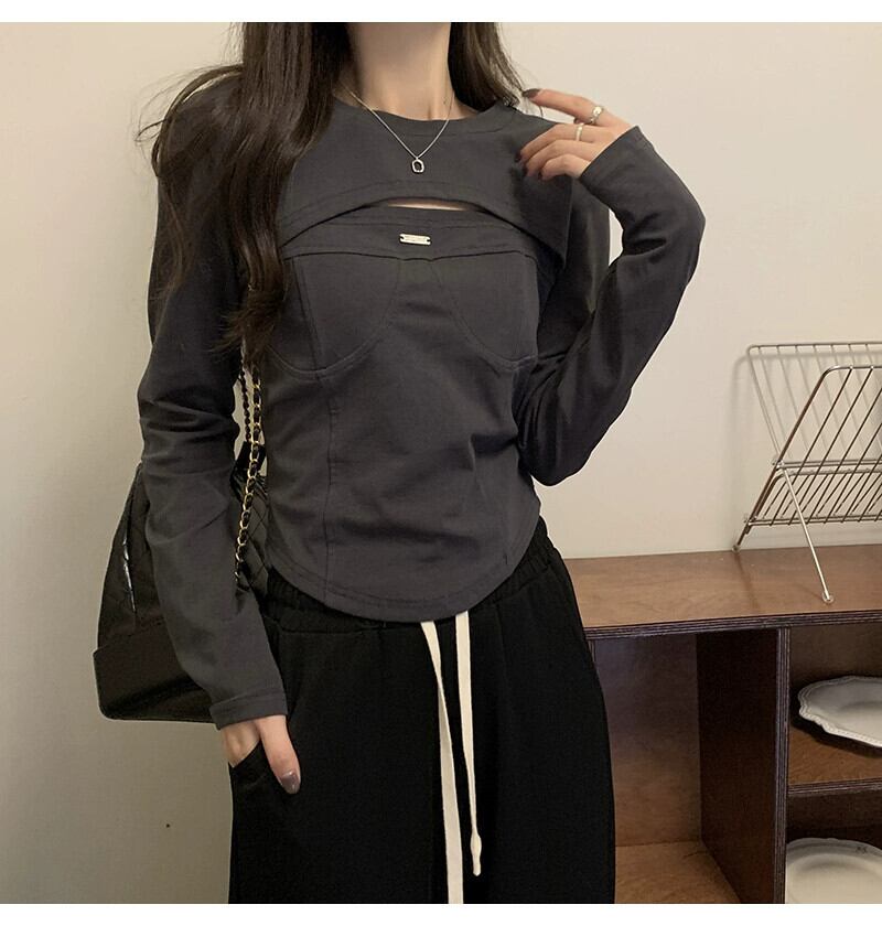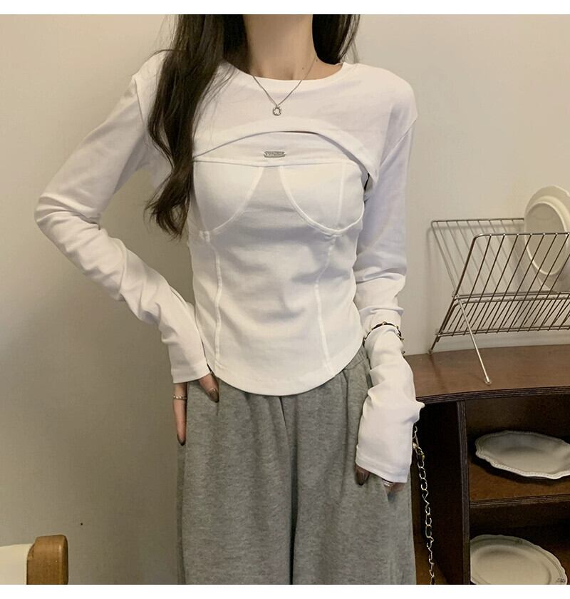 不規則なショート長袖トップスレディース、春と秋のデザイン、カーブした裾のスリムフィット、ボトムTシャツ2点セット ロング スプリング 春物 オータム 秋物 746005144345171 | framboise21