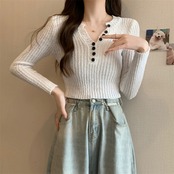 V ネックボトリングシャツ 2023 新しい女性の秋冬スタイルのインナーウェア痩身ショート長袖ニットセーター ロング オータム 秋物 ウィンター 冬物 Vネック 7460078790604304