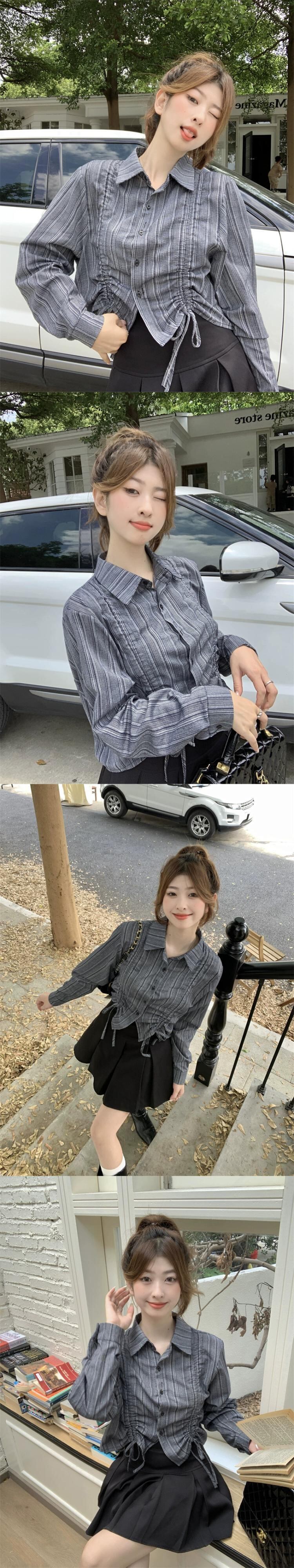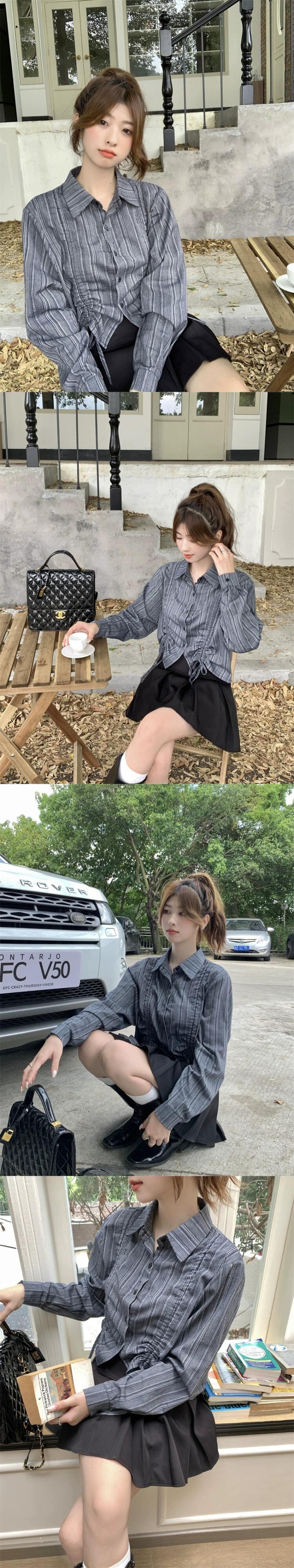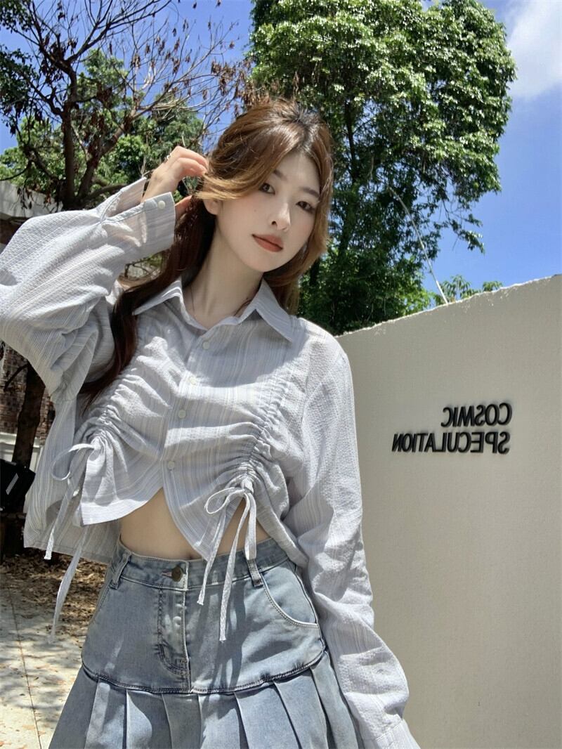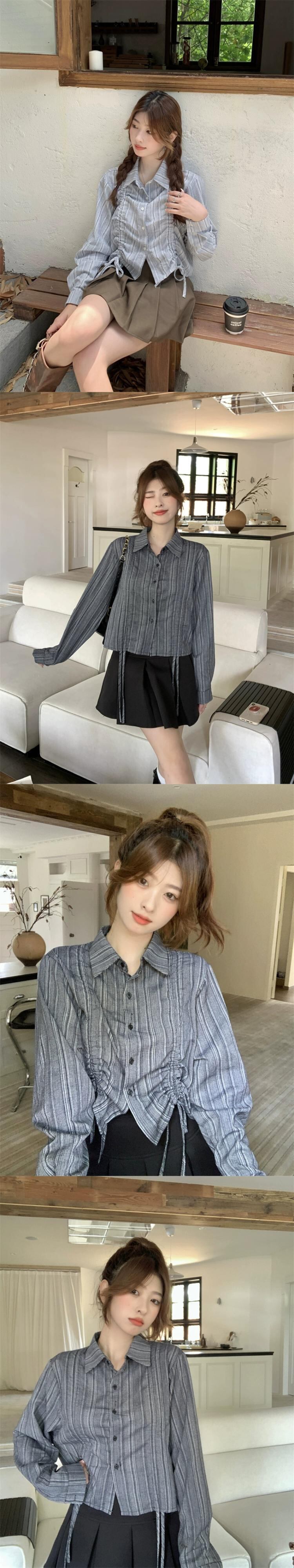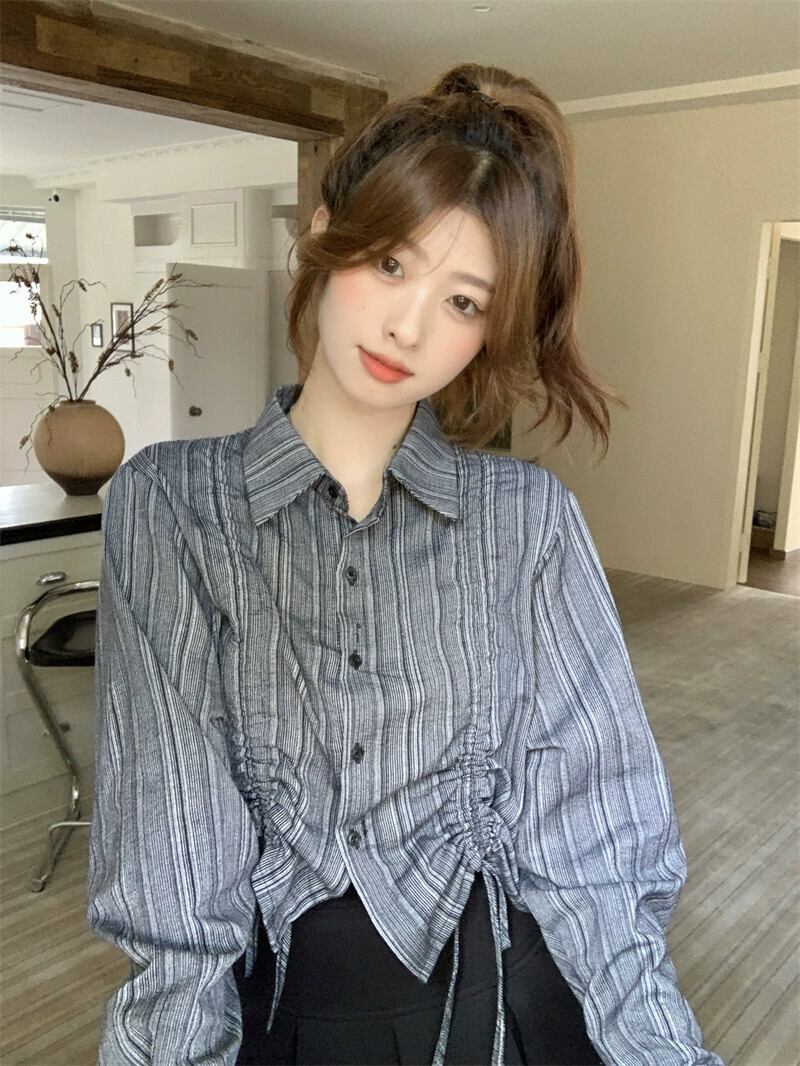 ストライプのショート長袖シャツ 2023 新しい女性の春と秋のデザインの小さなゆったりとしたシックな巾着トップ ロング スプリング 春物 オータム 秋物 7460088741791016 | framboise21
