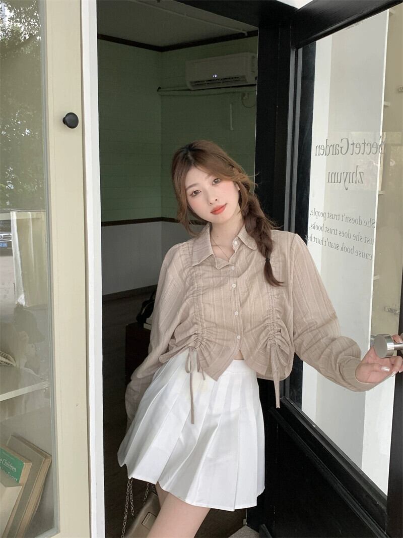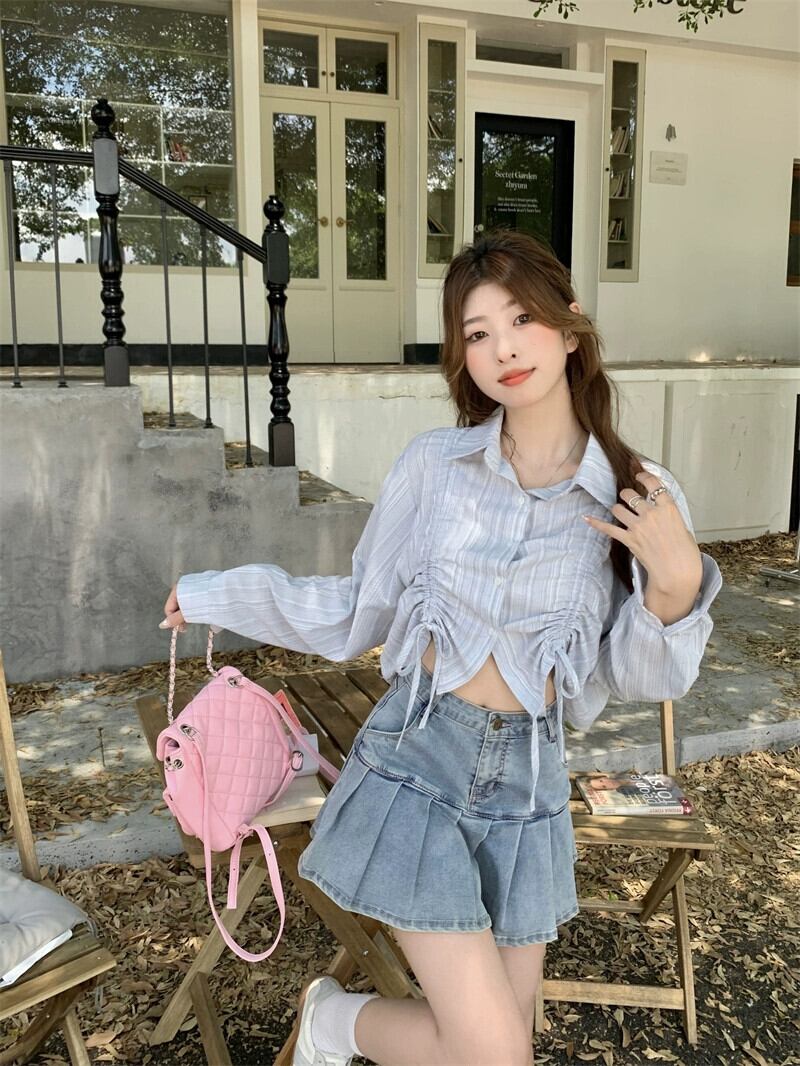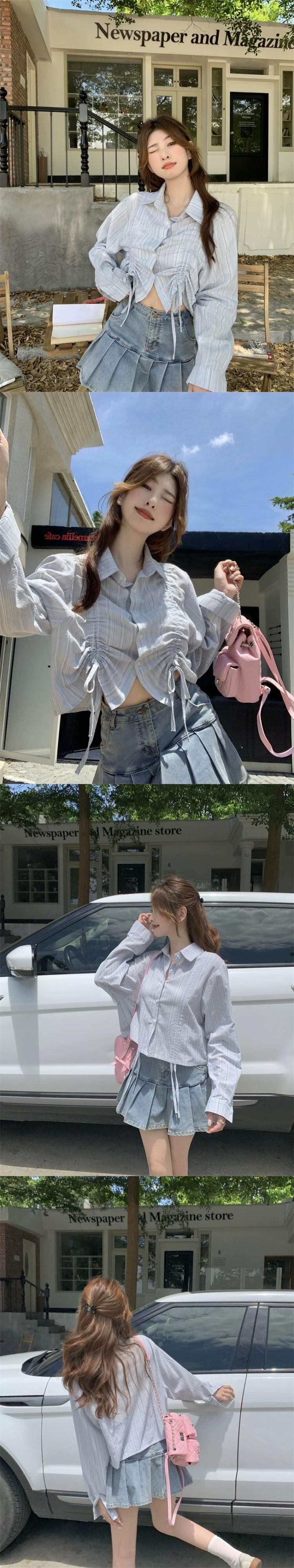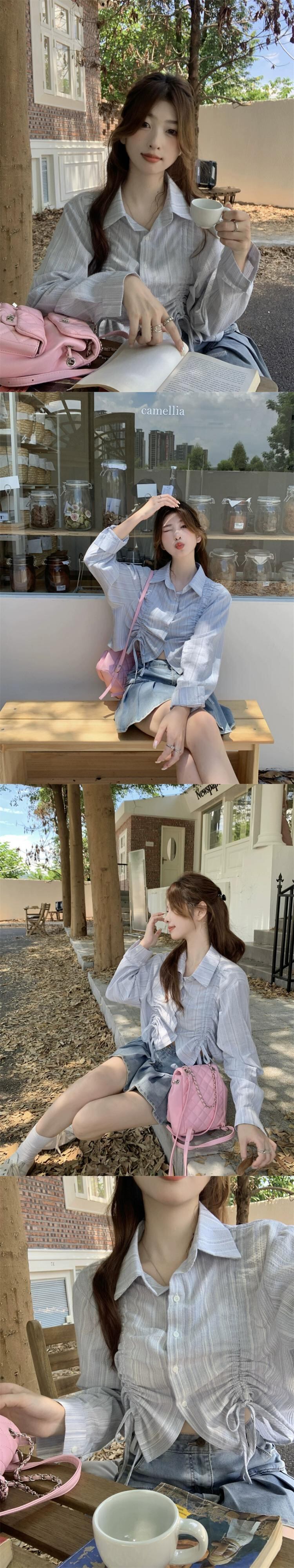 ストライプのショート長袖シャツ 2023 新しい女性の春と秋のデザインの小さなゆったりとしたシックな巾着トップ ロング スプリング 春物 オータム 秋物 7460088741791016 | framboise21