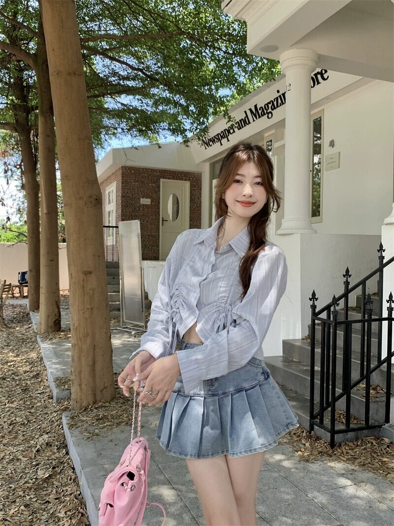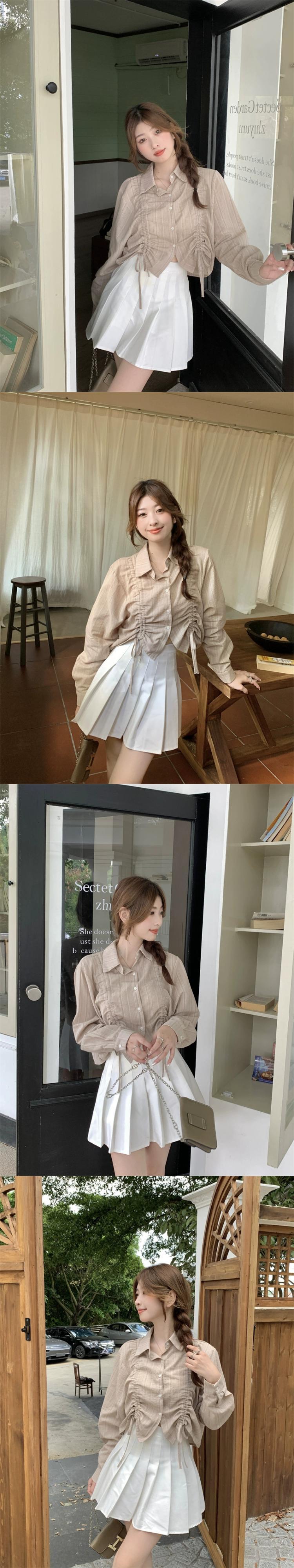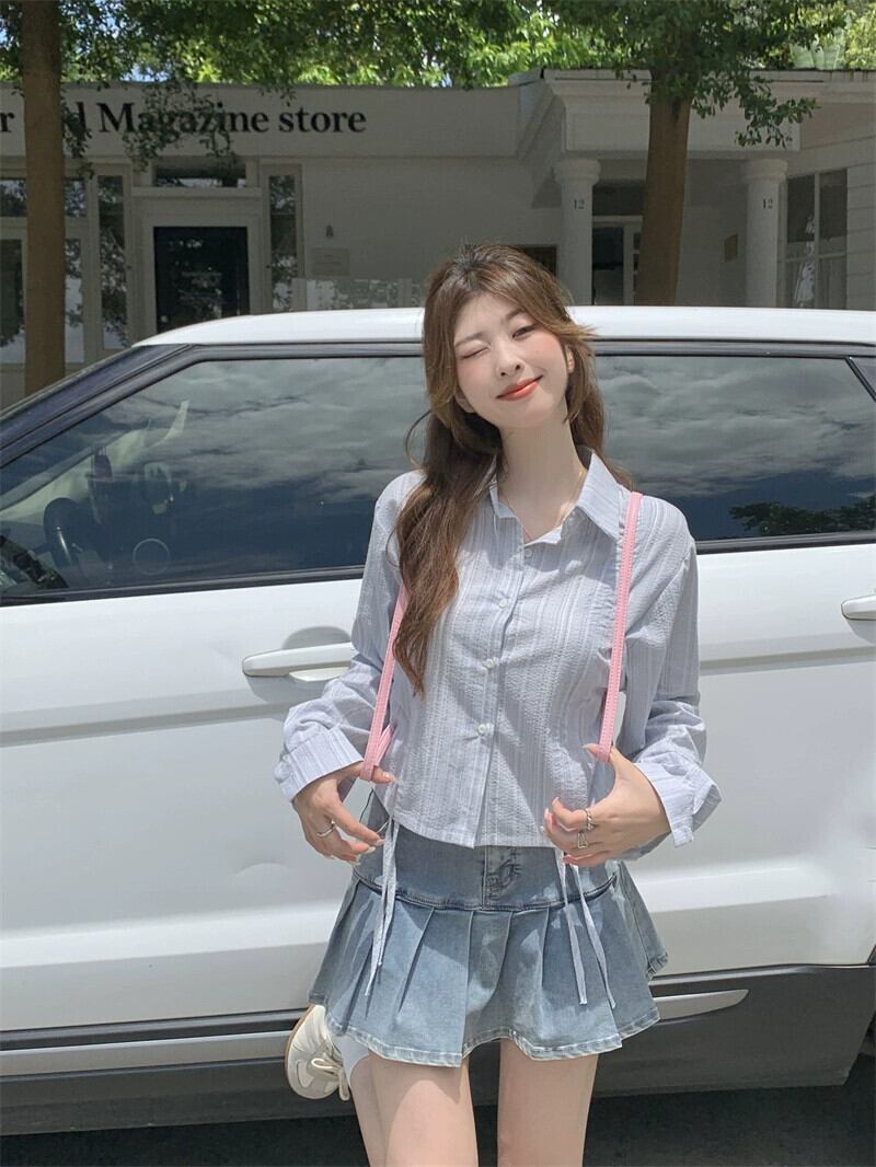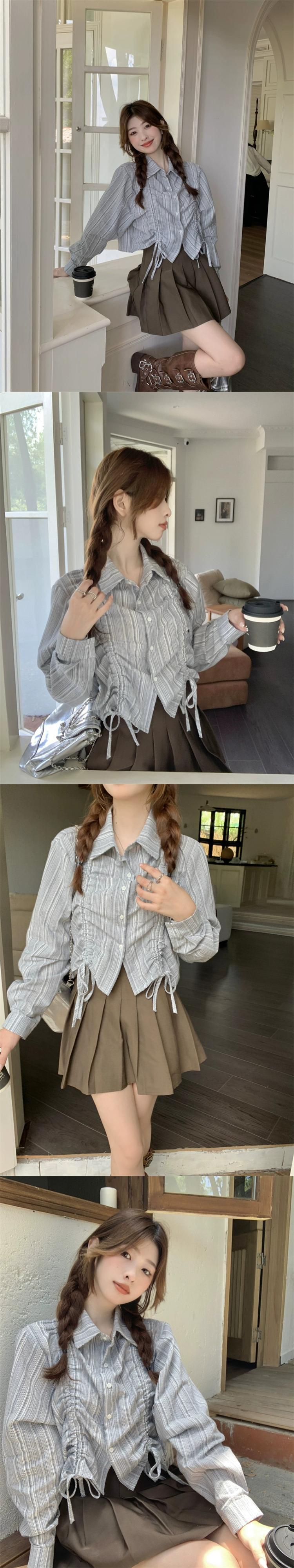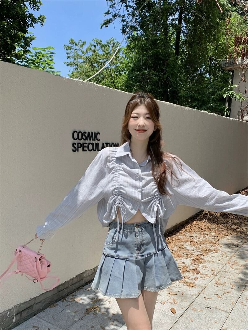 ストライプのショート長袖シャツ 2023 新しい女性の春と秋のデザインの小さなゆったりとしたシックな巾着トップ ロング スプリング 春物 オータム 秋物 7460088741791016 | framboise21