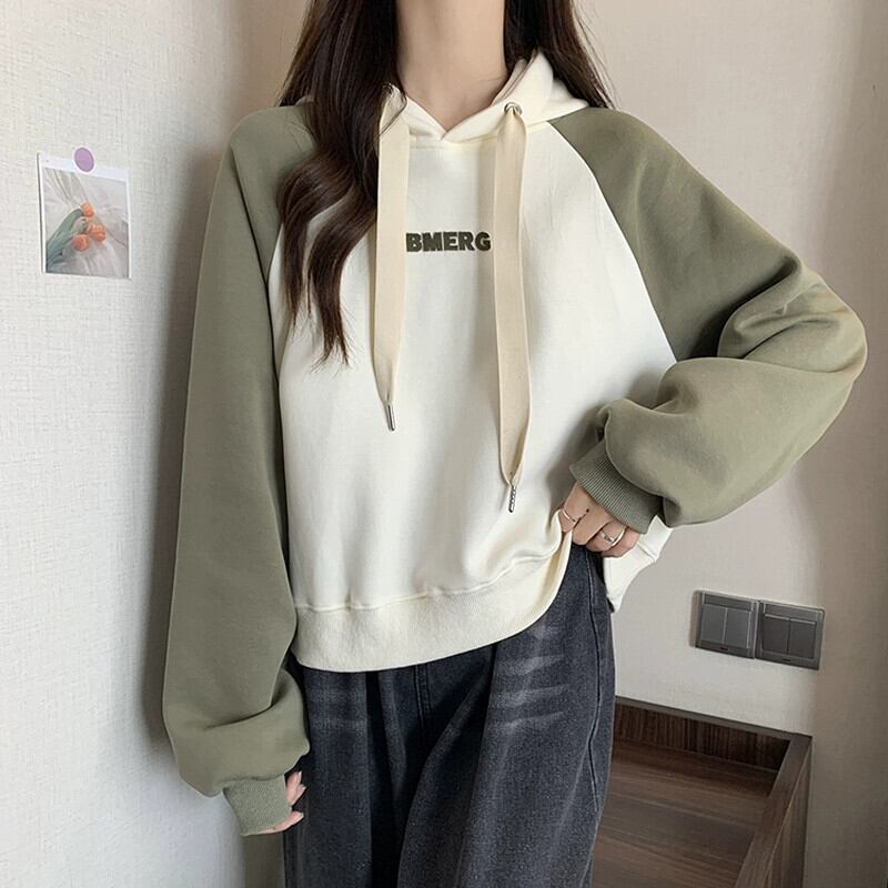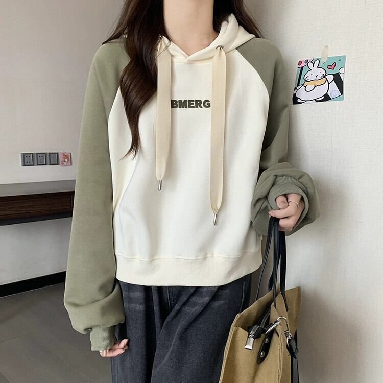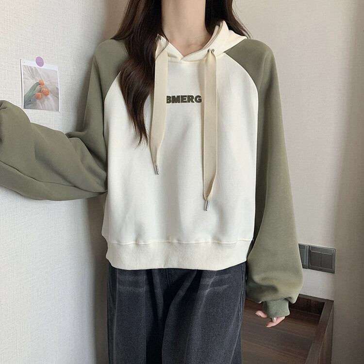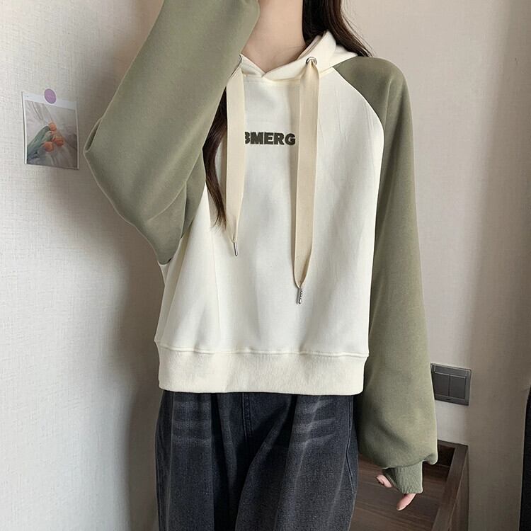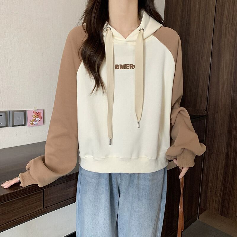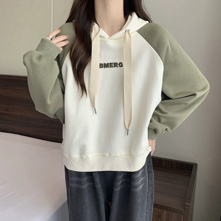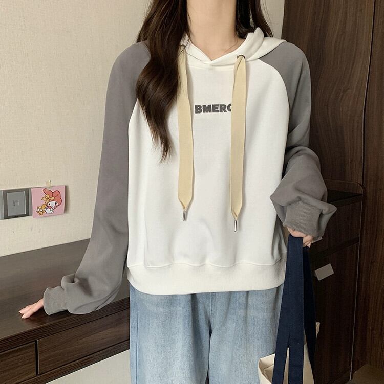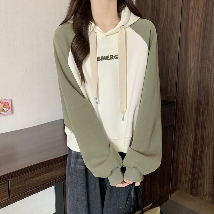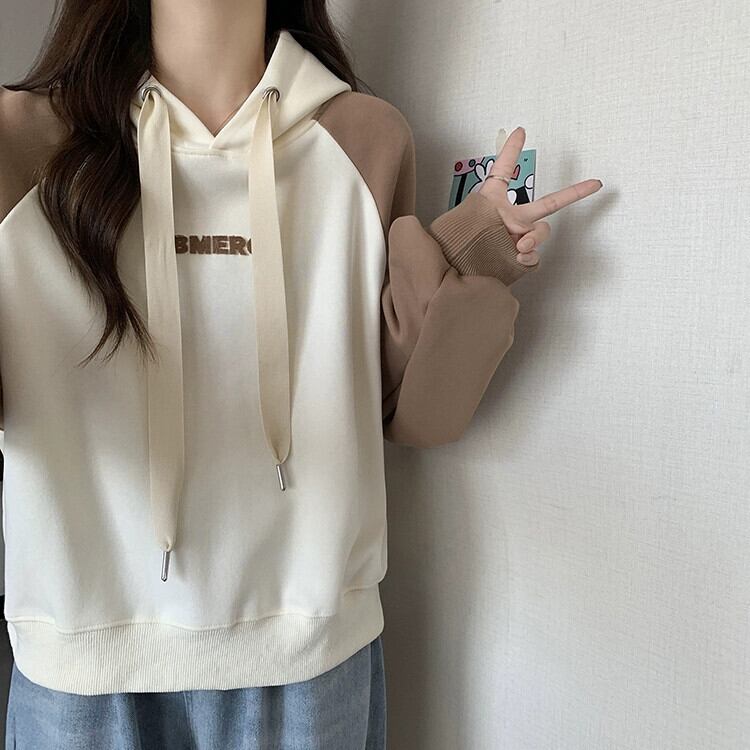 コントラストカラーのフード付きラグランスリーブスウェットシャツの女性の2023春、秋、冬の新しい人気のデザイン、ゆったりと多用途の長袖トップ ロング スプリング 春物 オータム 秋物 ウィンター 冬物 7460030129545440 | framboise21