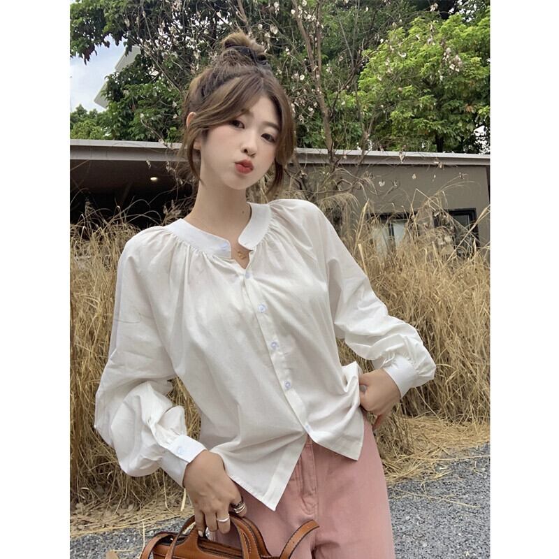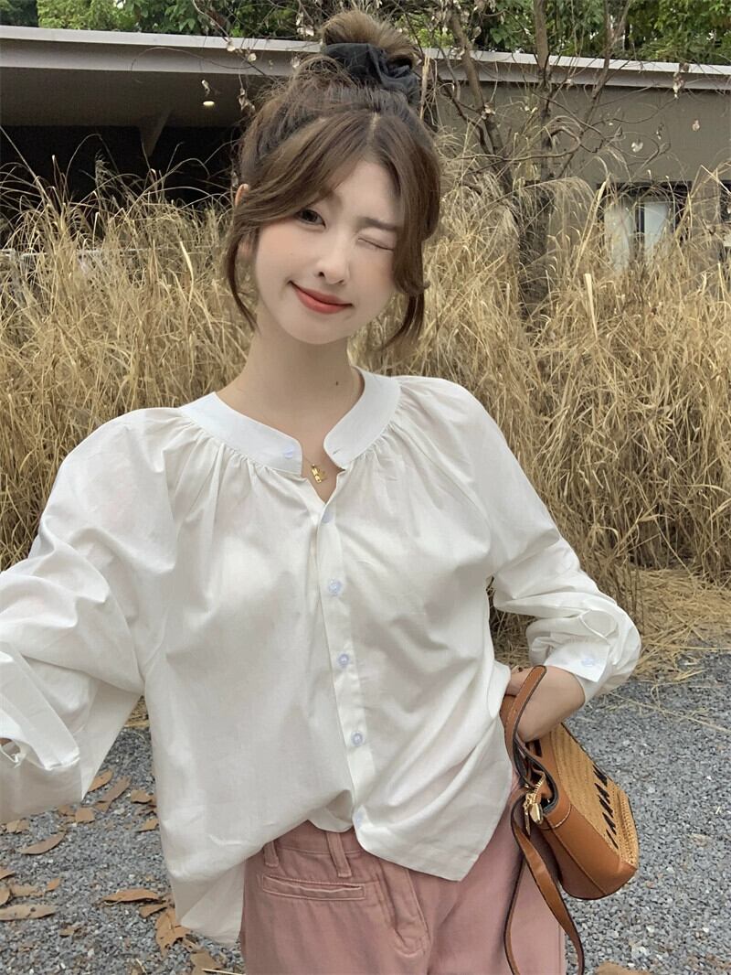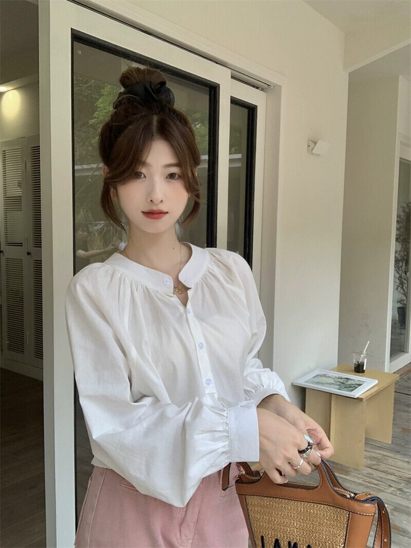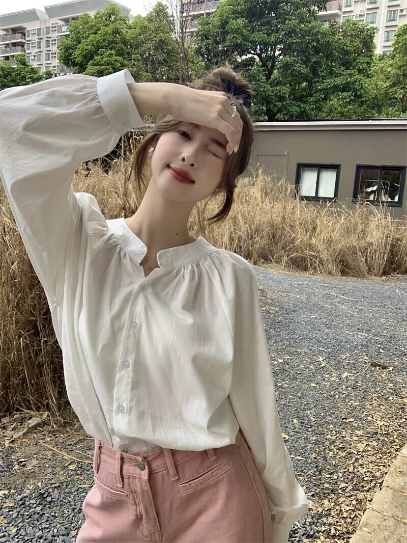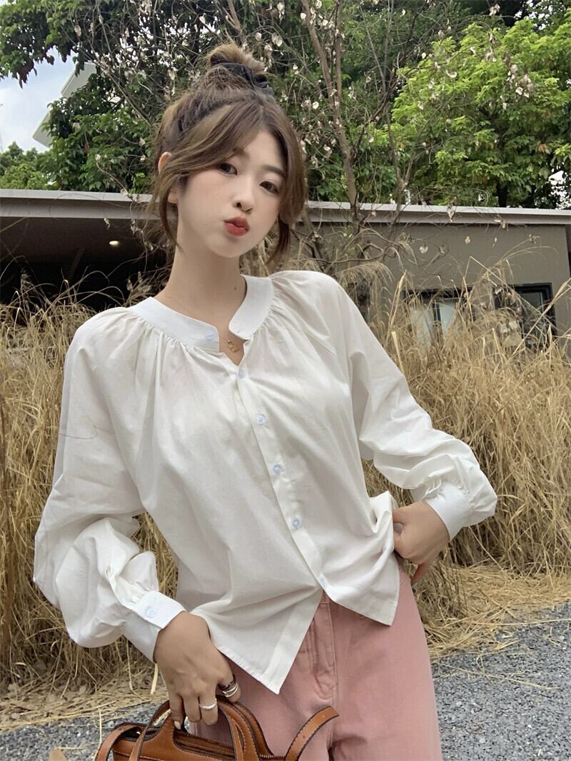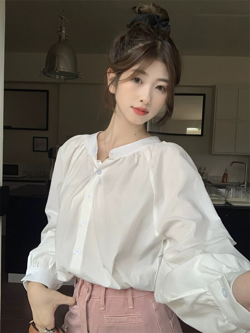 白いスタンドアップカラーランタンスリーブシャツレディース、春と秋のフレンチデザイン、ゆったりとした通勤用長袖トップ、ショートジャケット ロング ホワイト スプリング 春物 オータム 秋物 7460095996480739 | framboise21