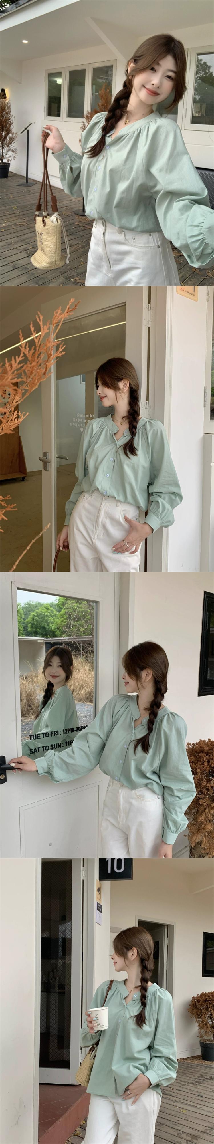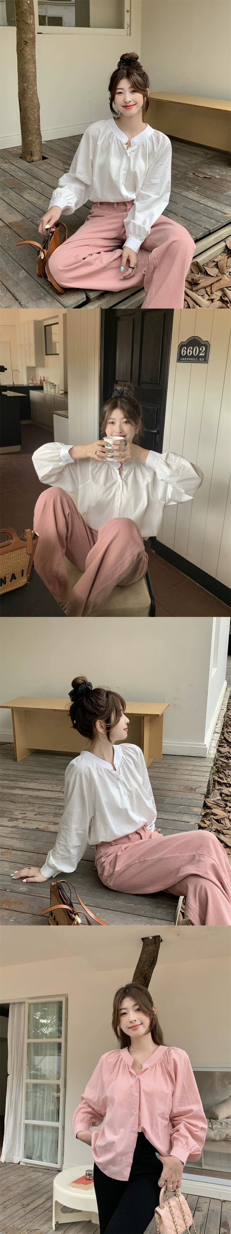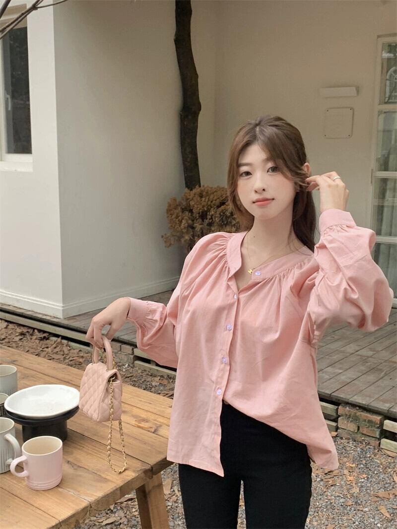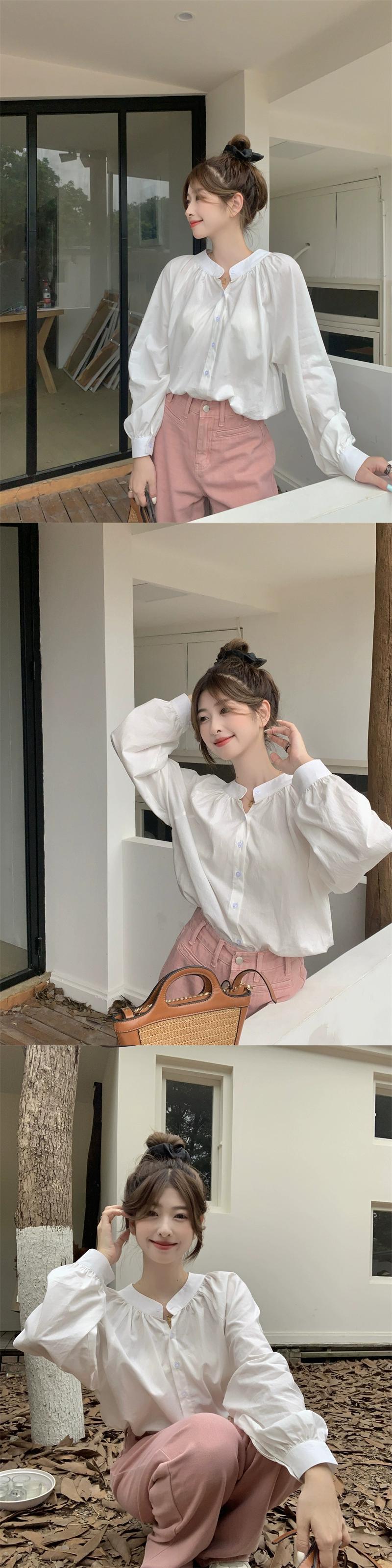 白いスタンドアップカラーランタンスリーブシャツレディース、春と秋のフレンチデザイン、ゆったりとした通勤用長袖トップ、ショートジャケット ロング ホワイト スプリング 春物 オータム 秋物 7460095996480739 | framboise21