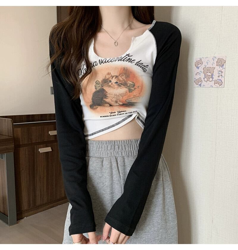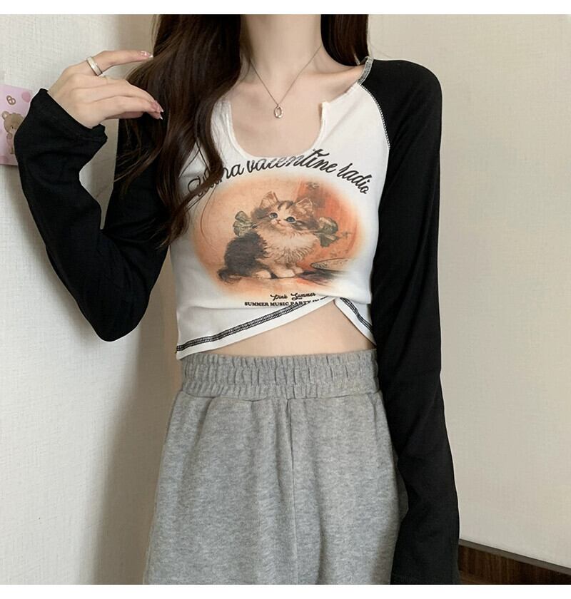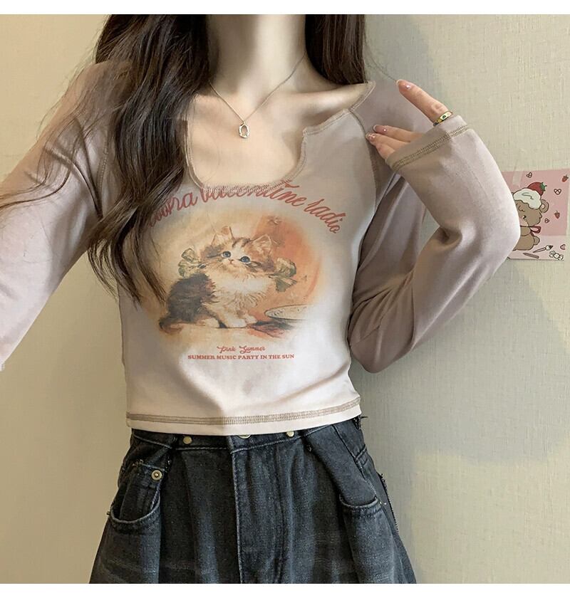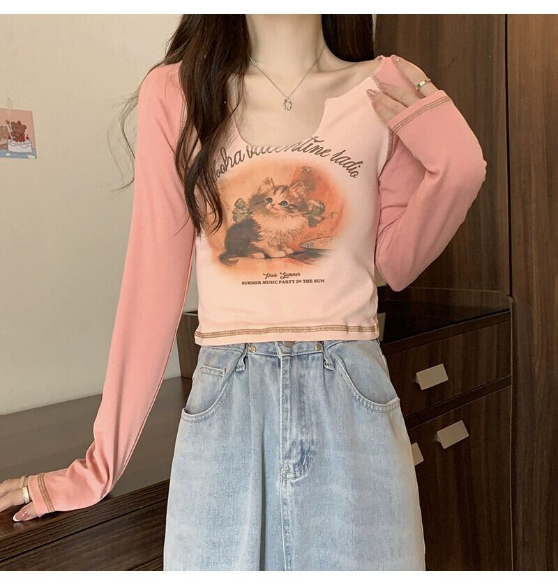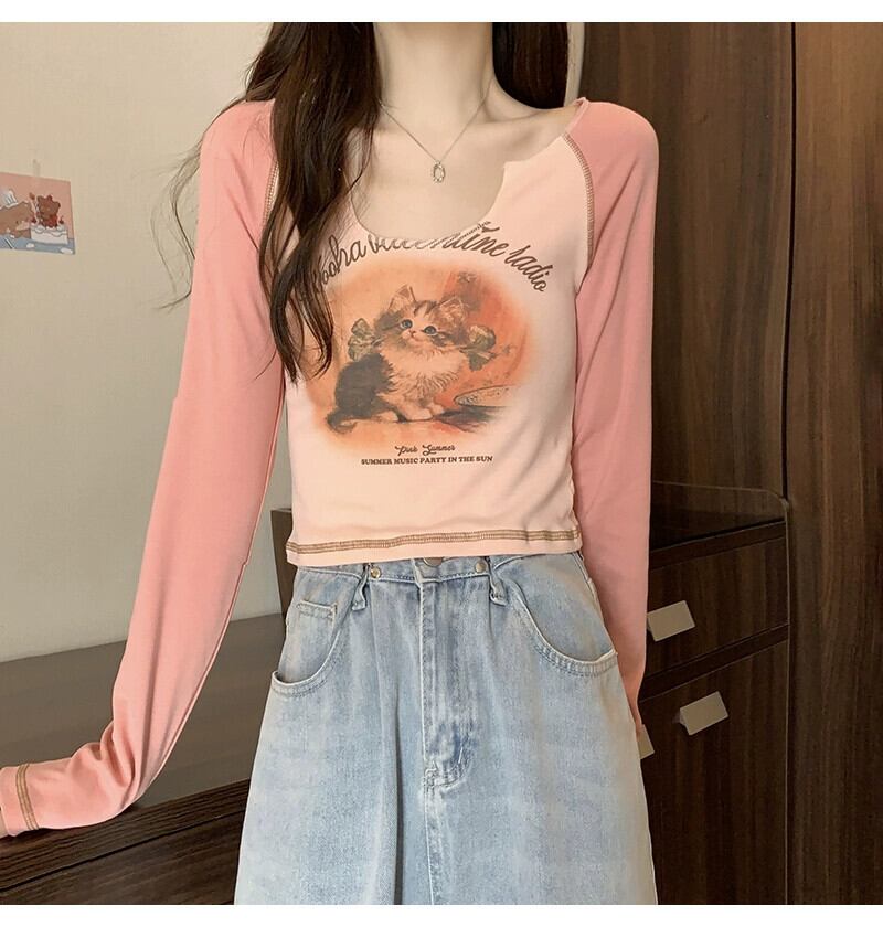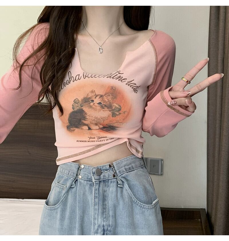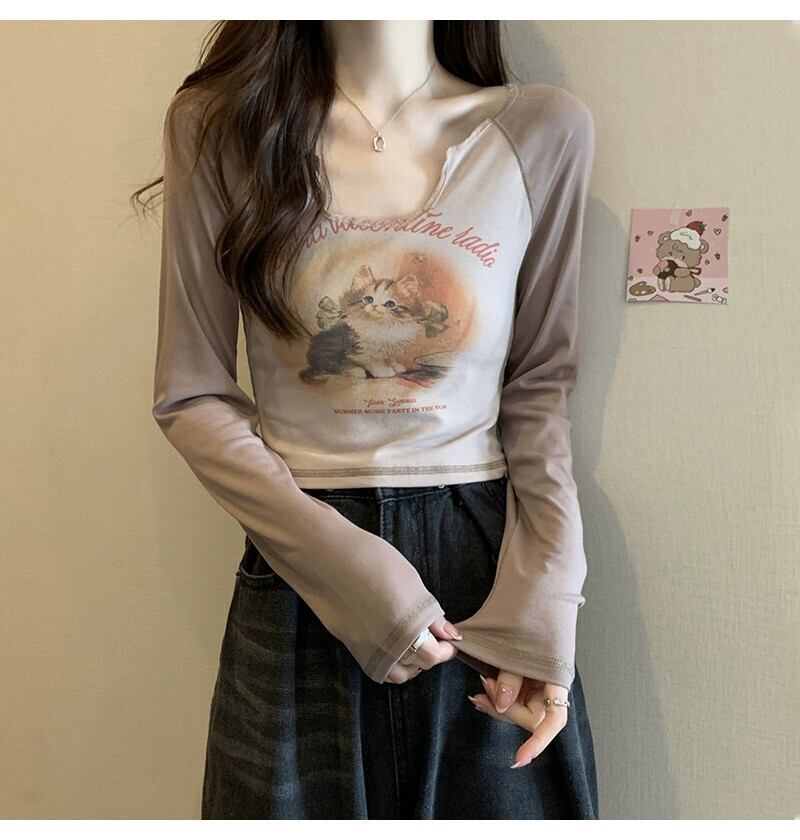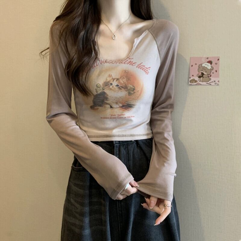 Pure Desire Hot Girl ショート長袖トップ レディース 春と秋のフレンチ スリムフィット プリント V ネック ボトリング Tシャツ ロング スプリング 春物 オータム 秋物 Vネック 746003346958538 | framboise21
