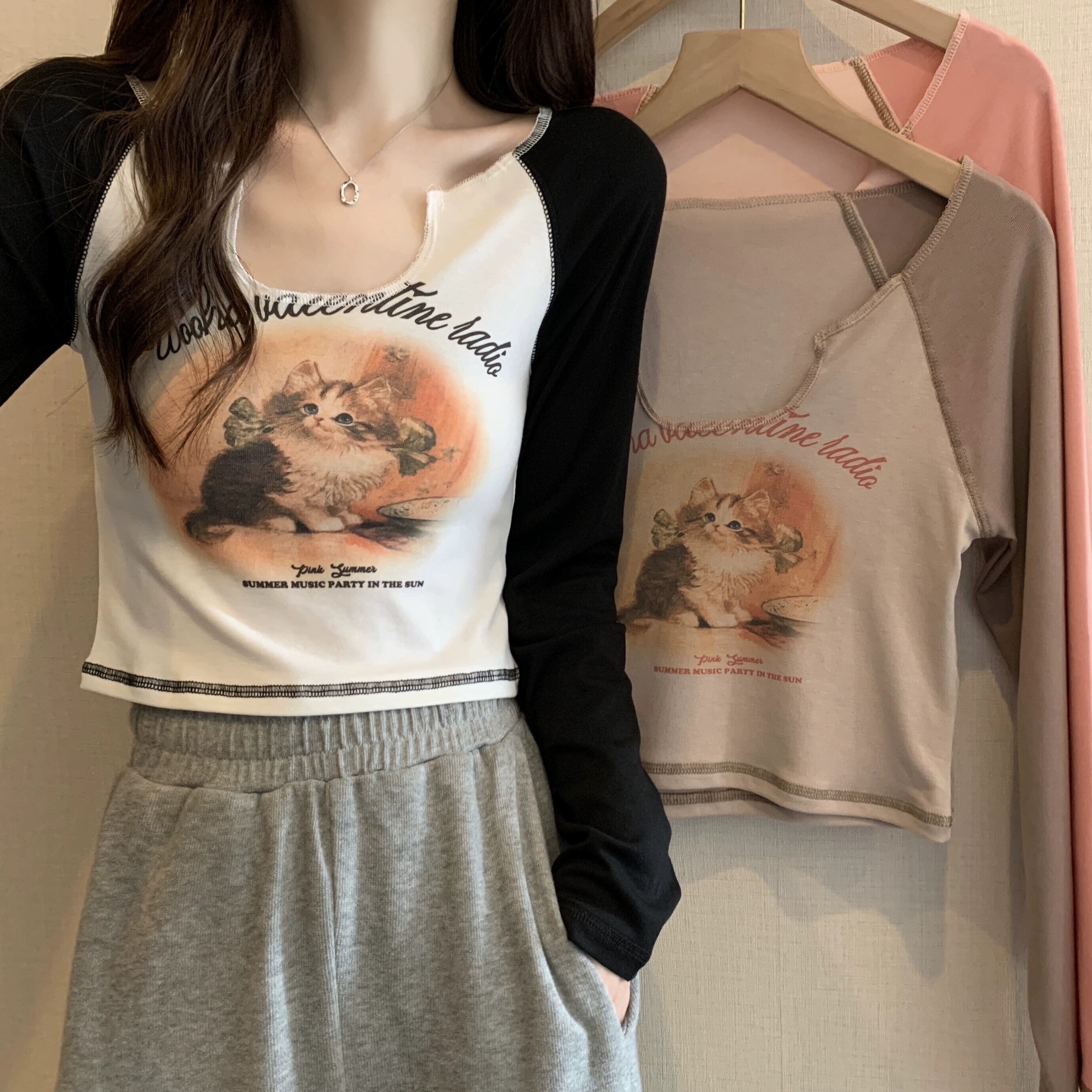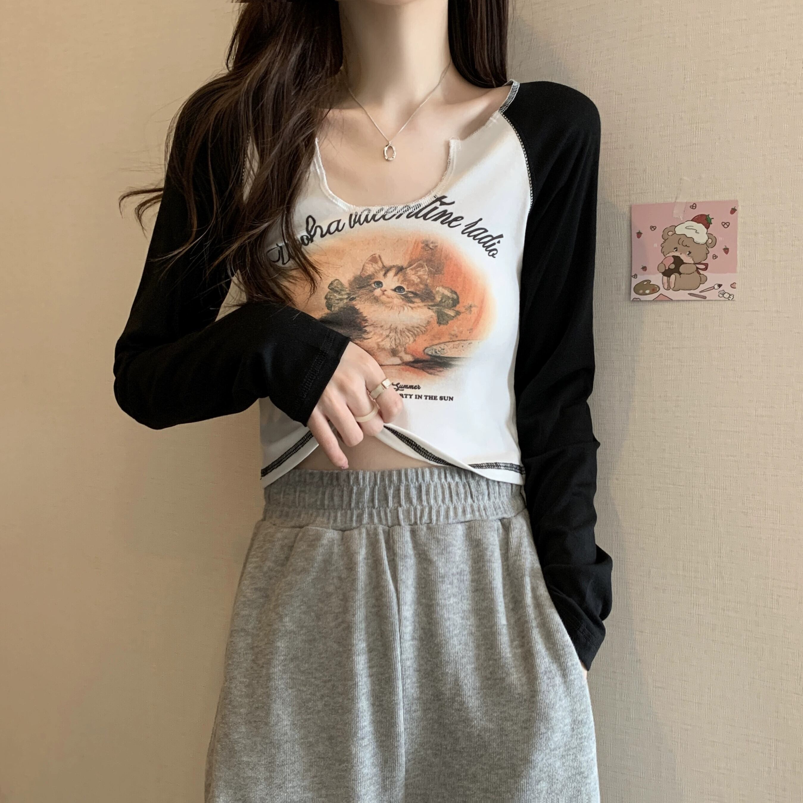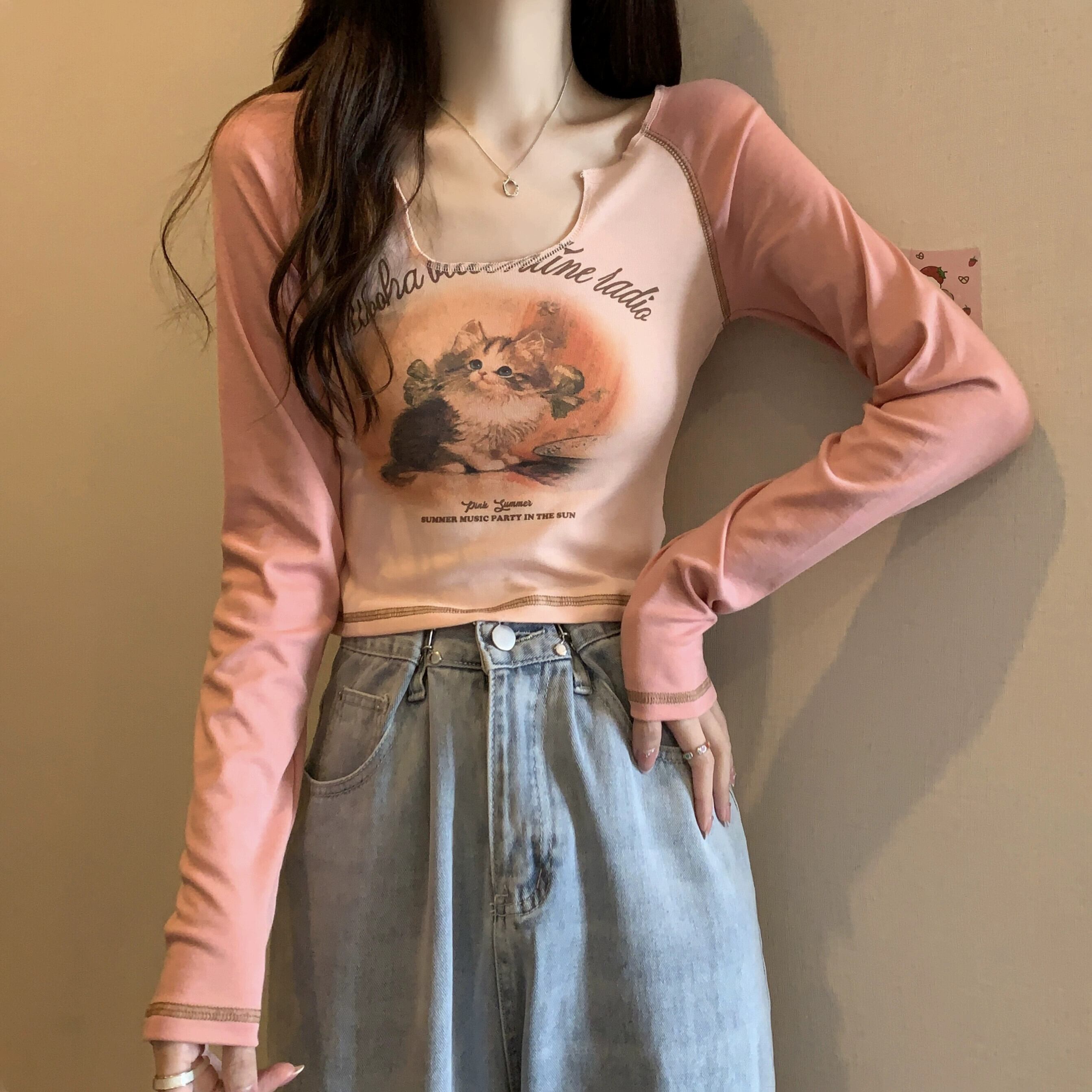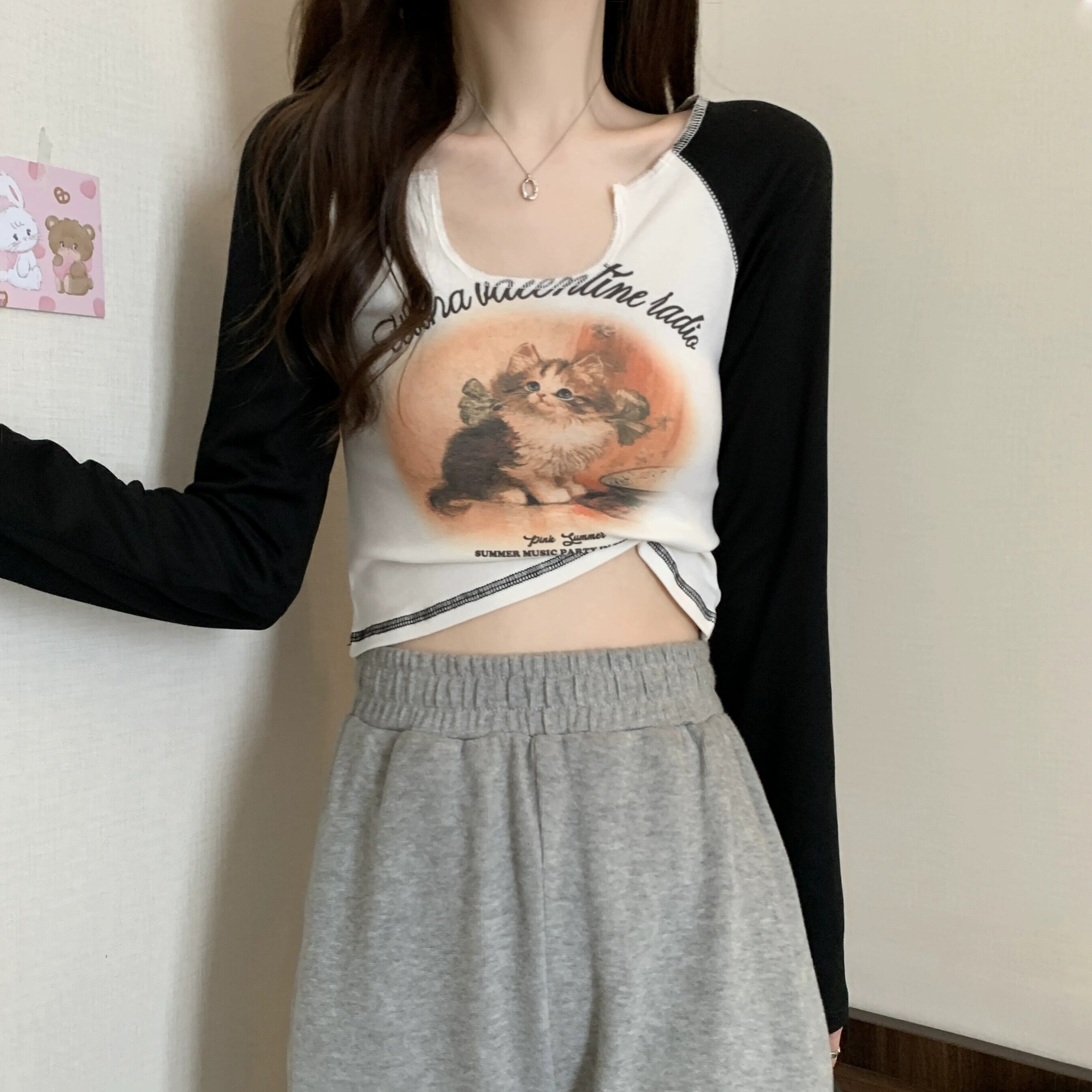 Pure Desire Hot Girl ショート長袖トップ レディース 春と秋のフレンチ スリムフィット プリント V ネック ボトリング Tシャツ ロング スプリング 春物 オータム 秋物 Vネック 746003346958538 | framboise21