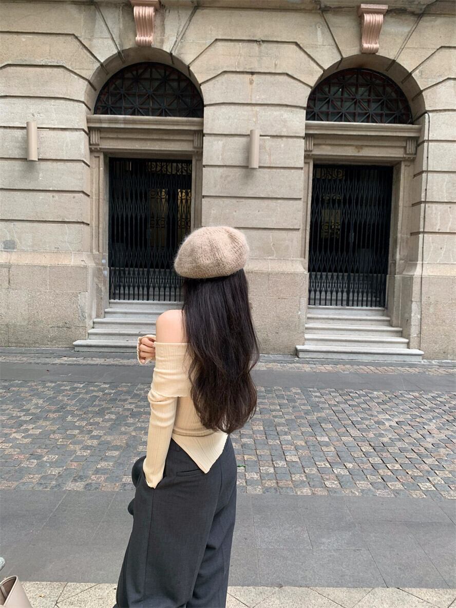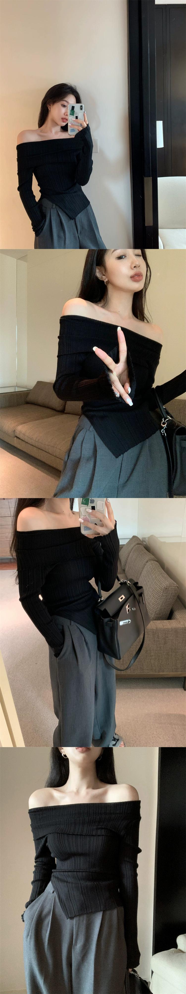 ワンショルダー長袖トップス女性 2023 秋の新しいファッションスリムフィットインナーレイヤード不規則なニットオフショルダーボトリングシャツ ロング レッド オータム 秋物 7460084640012239 | framboise21