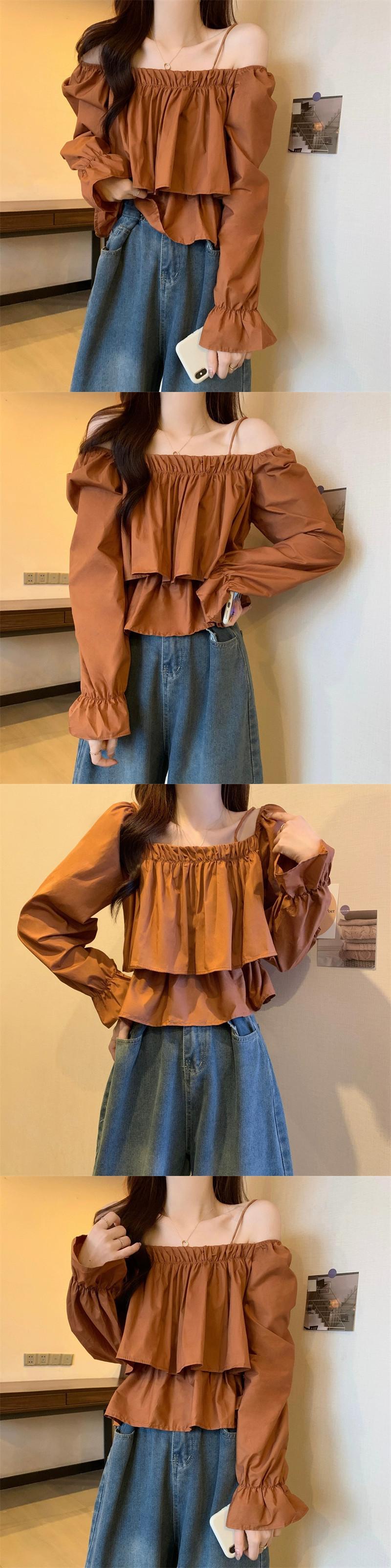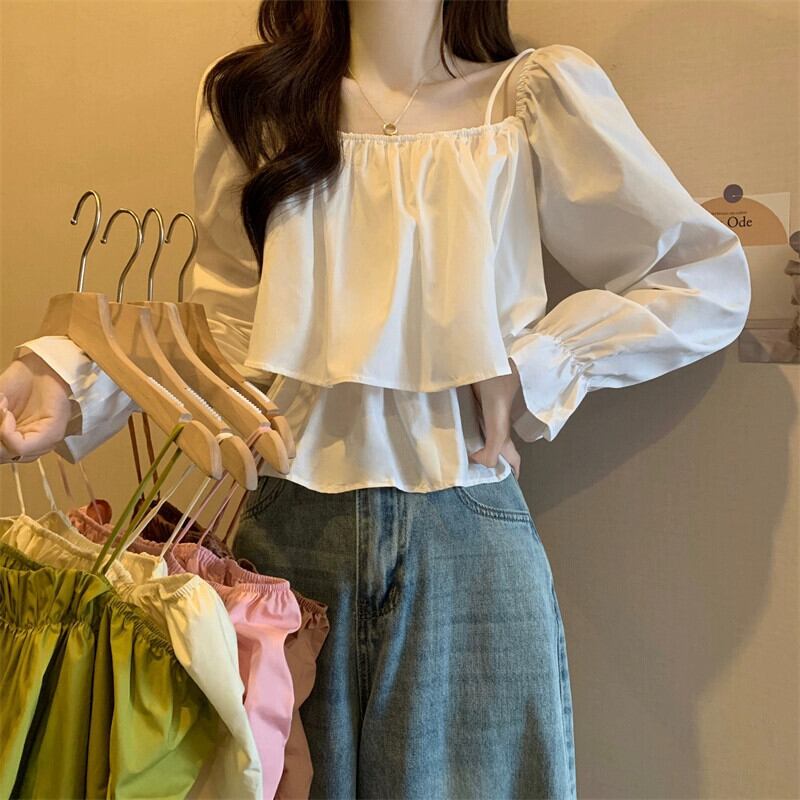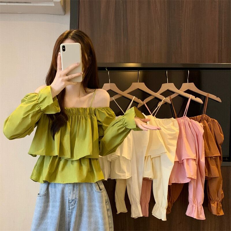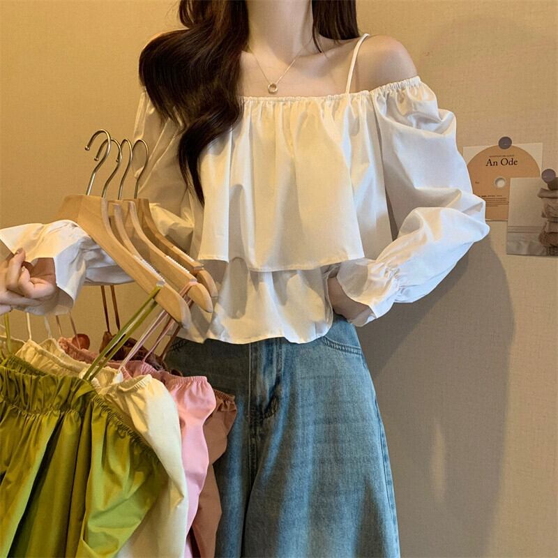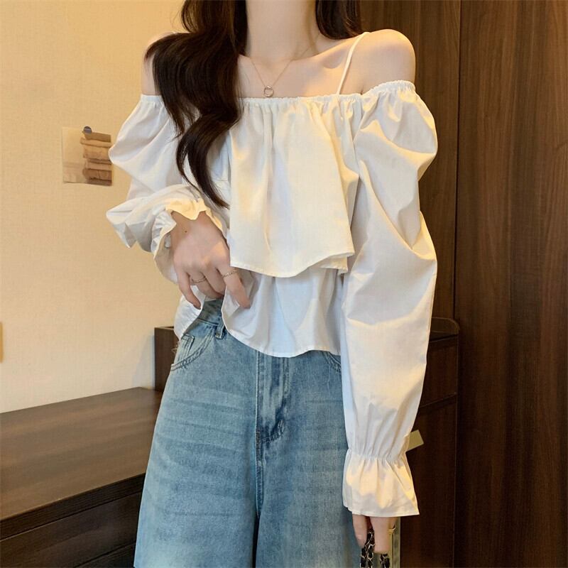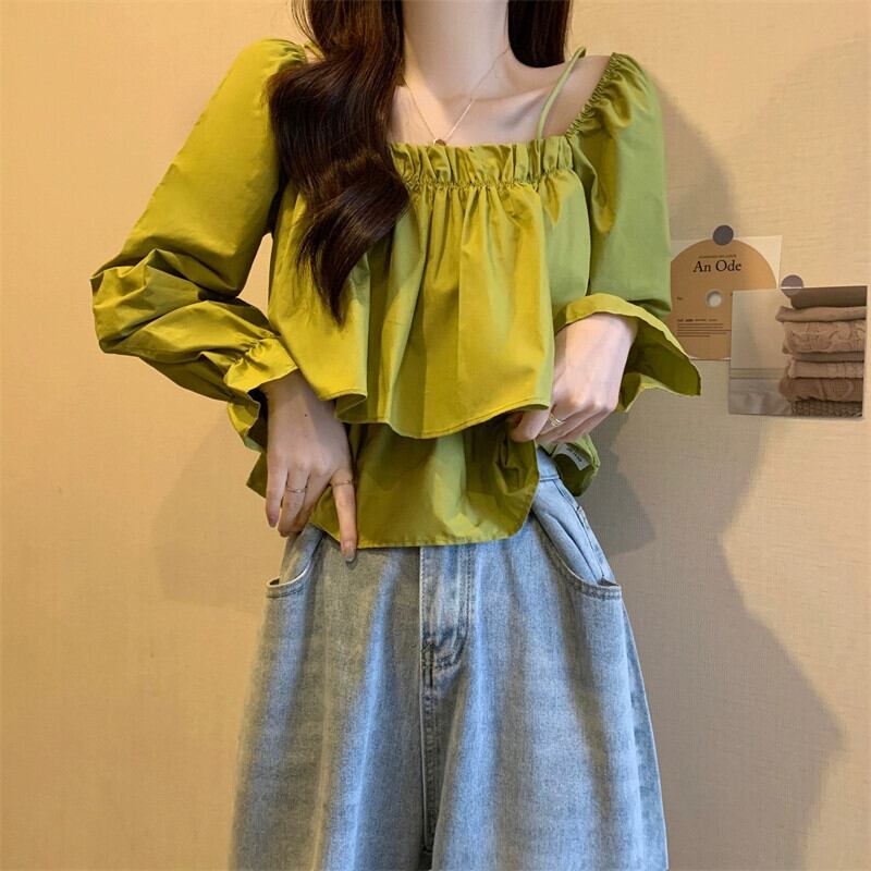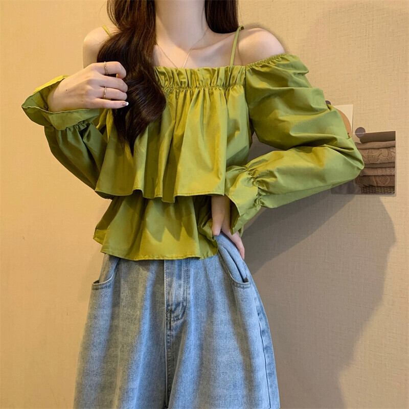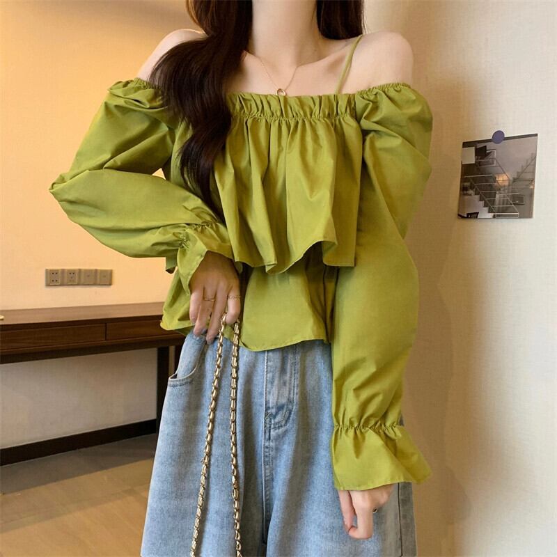 春と秋の短いフリルシャツの女性、ファッショナブルで西洋的なデザイン、ルーズでスリム、ワンショルダートランペット長袖トップ ショート ロング スプリング 春物 オータム 秋物 746003321848415 | framboise21