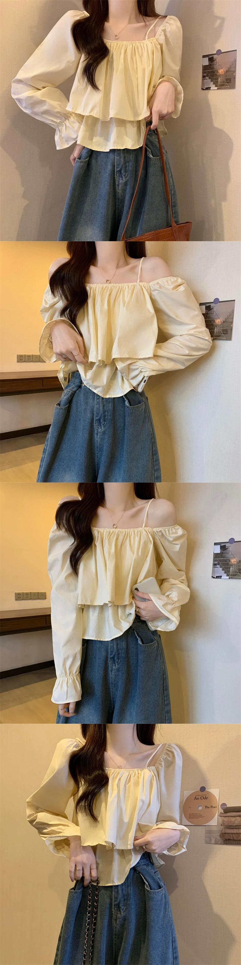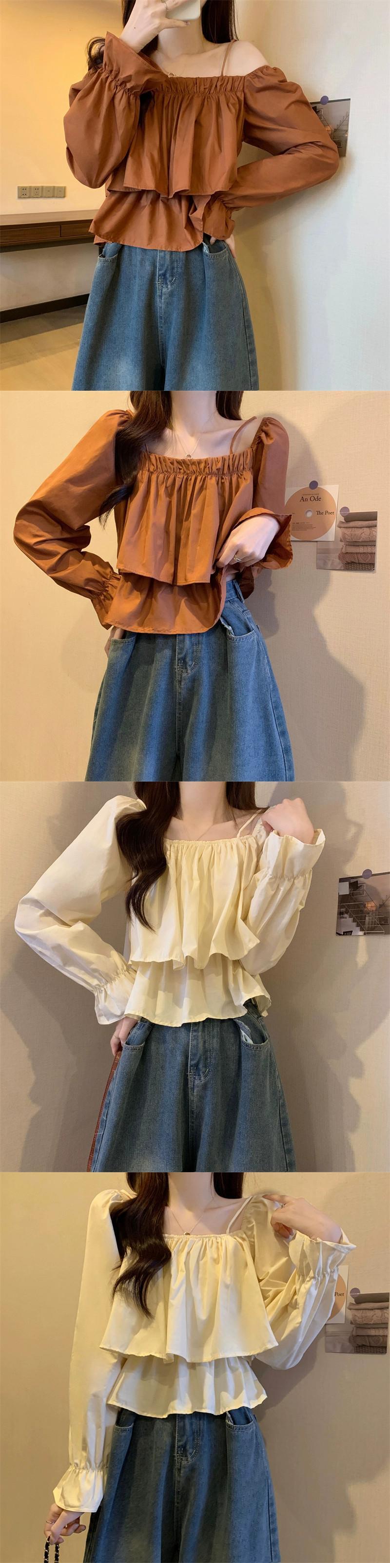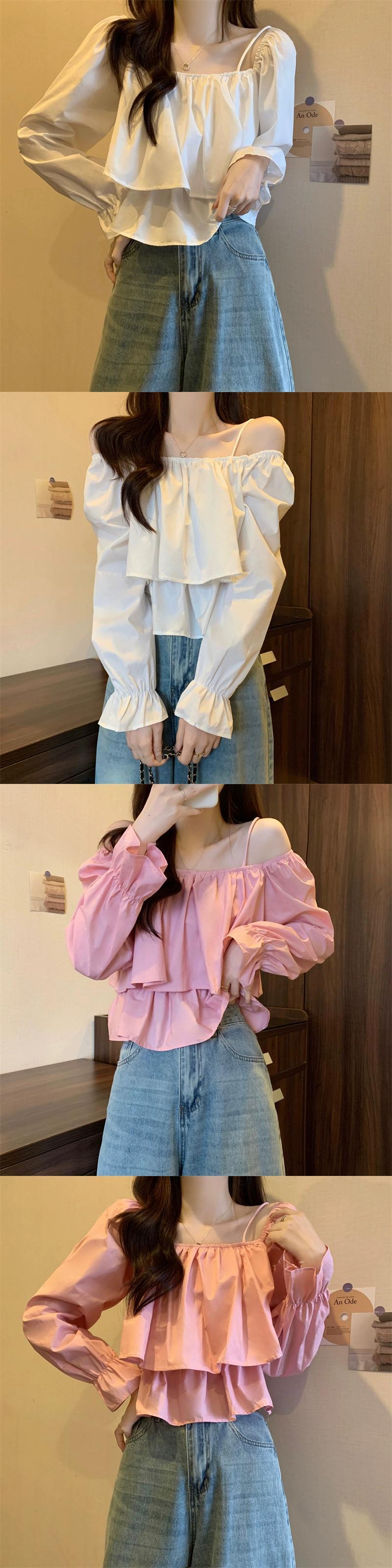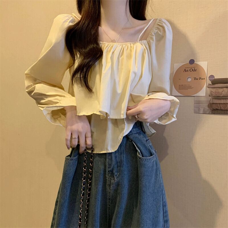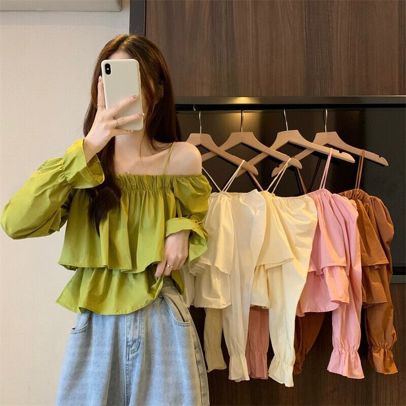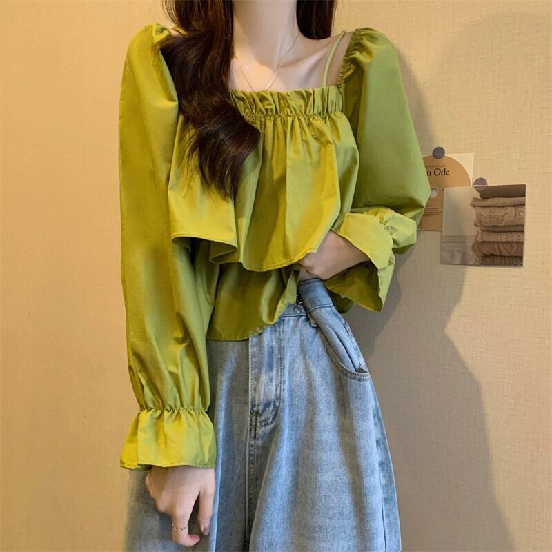 春と秋の短いフリルシャツの女性、ファッショナブルで西洋的なデザイン、ルーズでスリム、ワンショルダートランペット長袖トップ ショート ロング スプリング 春物 オータム 秋物 746003321848415 | framboise21
