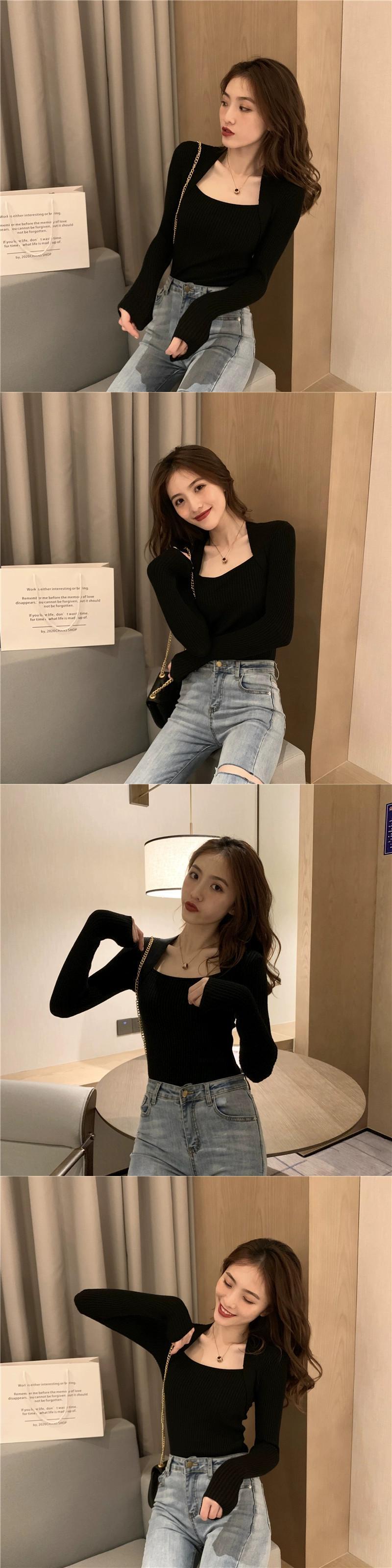鎖骨スクエアネックボトリングシャツ 2023 レディース秋冬スリムフィットセーター、有能で多用途な長袖ニットトップ ロング オータム 秋物 ウィンター 冬物 スクウェア 7460025250094591 | framboise21