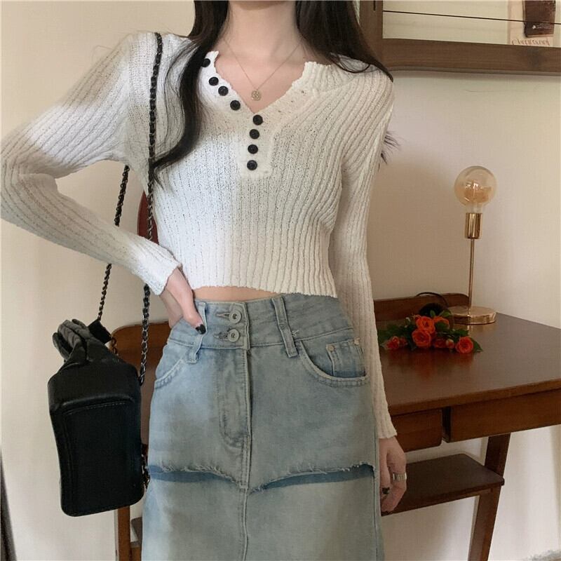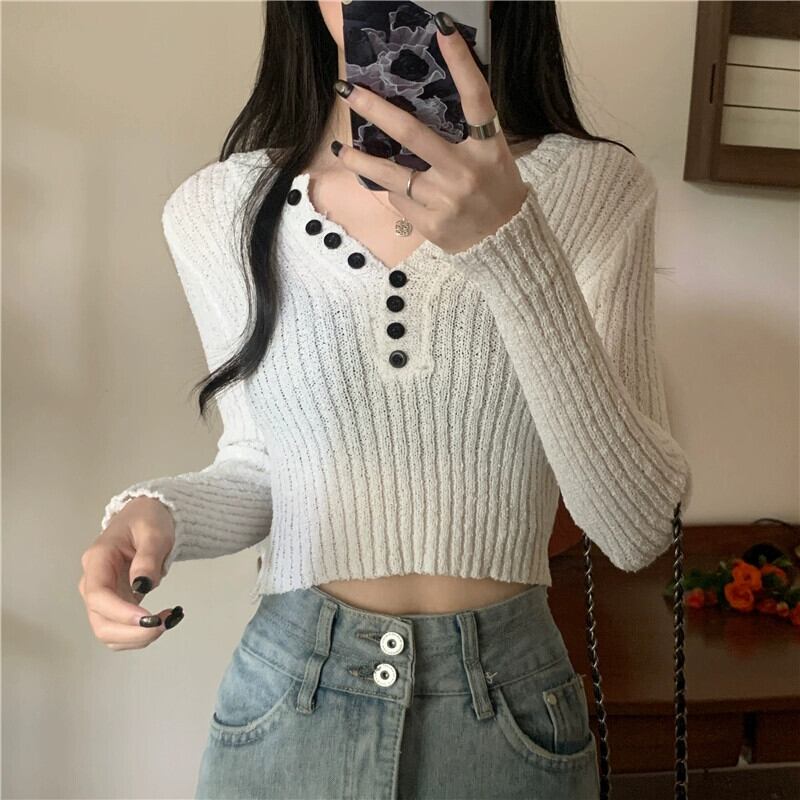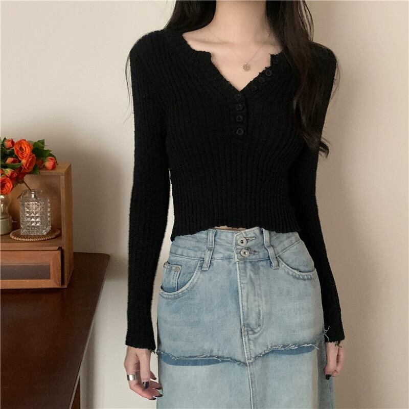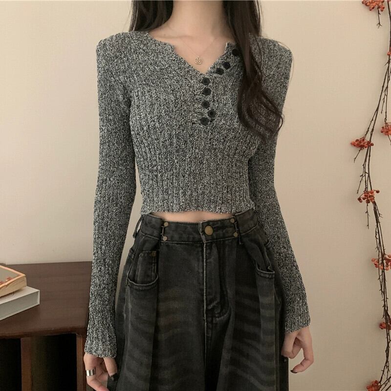 グレー V ネックニットボトムシャツ 2023 新しい女性の秋冬スタイルのインナースタイルスリムショート長袖トップ ロング オータム 秋物 ウィンター 冬物 Vネック 7460076334941989 | framboise21