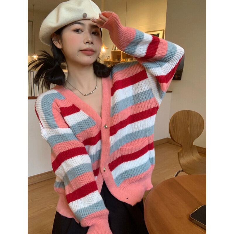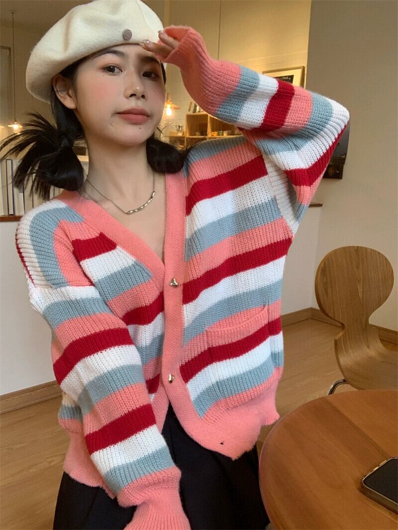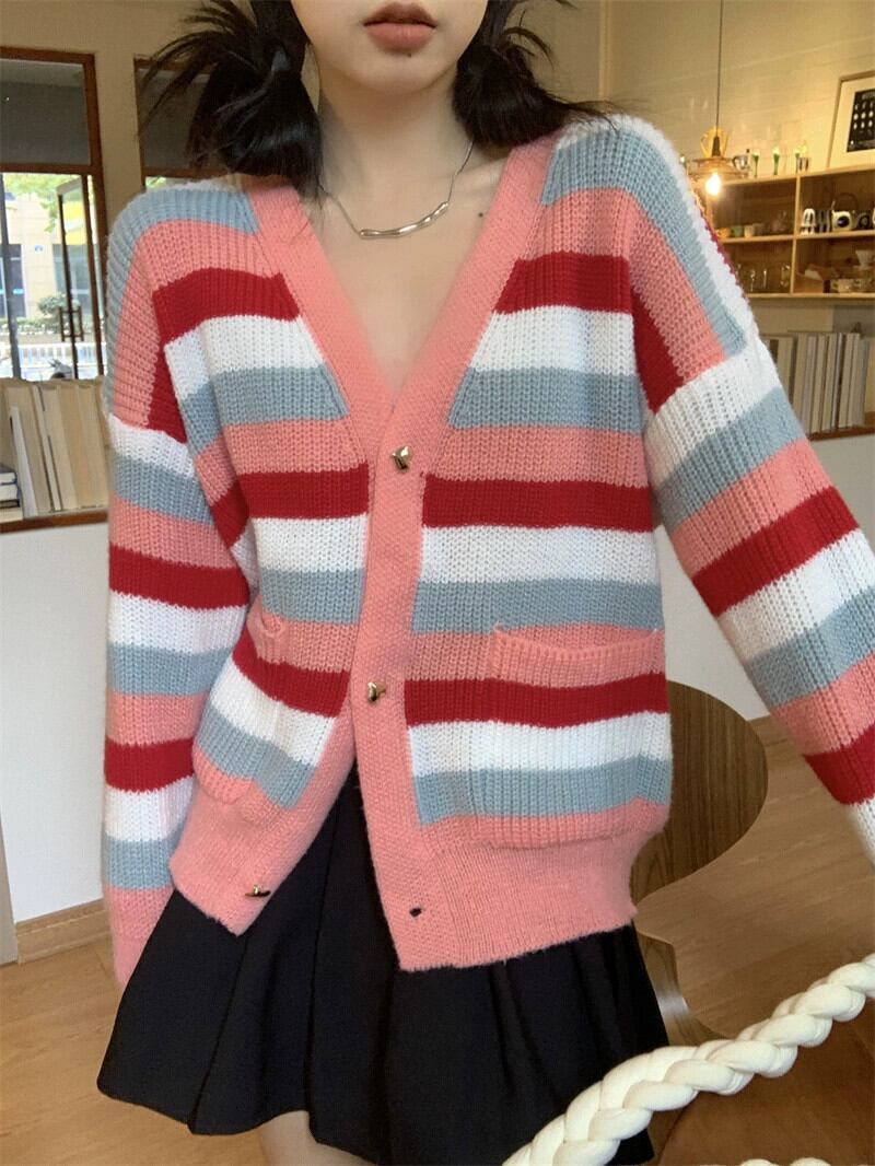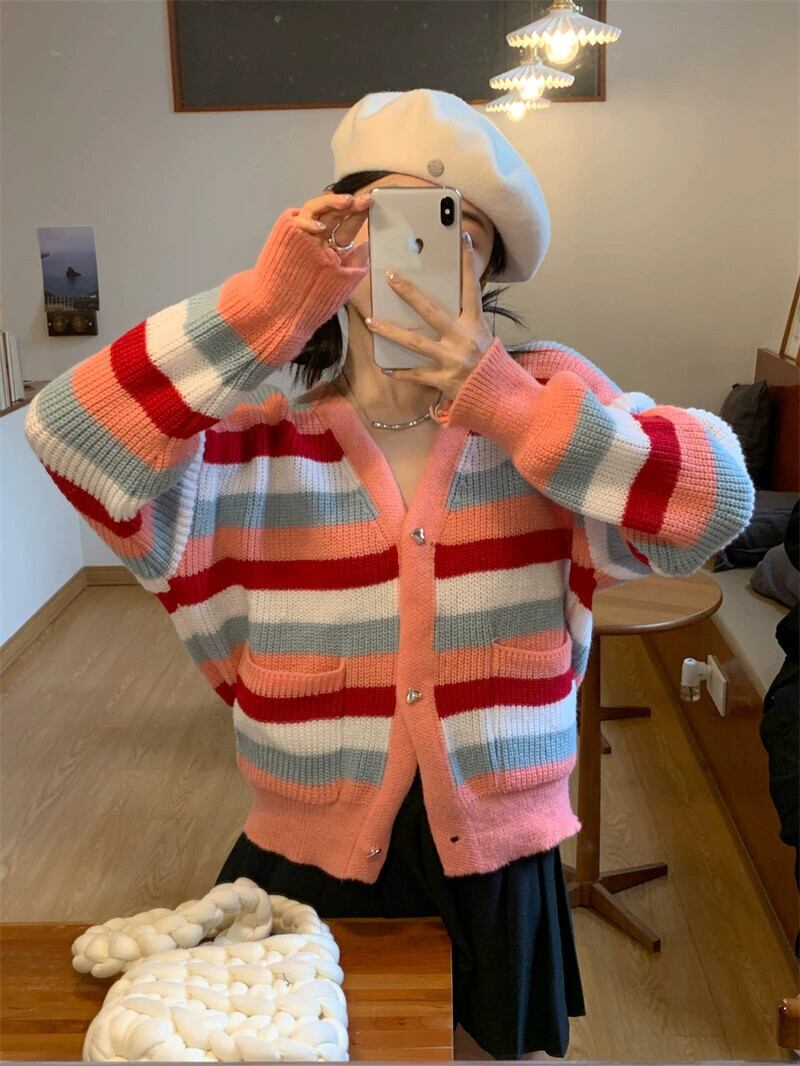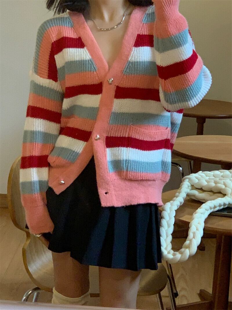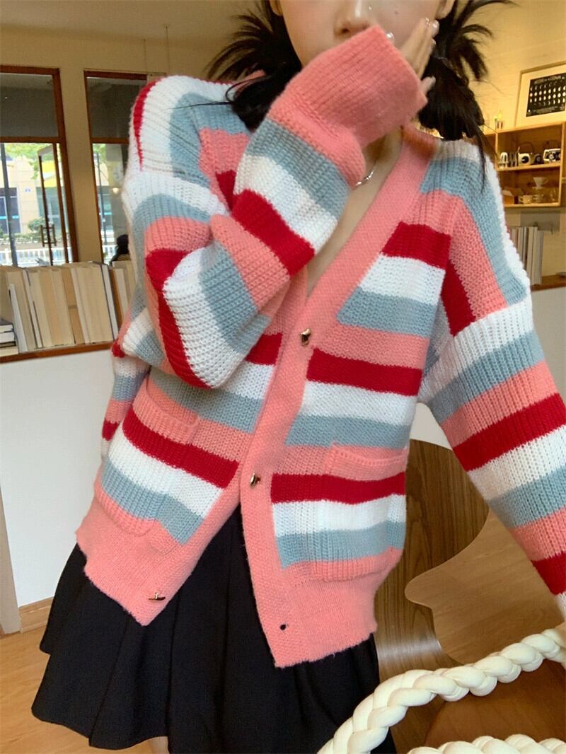 レインボーストライプの太いラインのセータージャケットの女性、秋冬スタイル、レトロなルーズなアウターウェア、レイジースタイルのVネック長袖セーター ロング オータム 秋物 ウィンター 冬物 7460087256597304 | framboise21