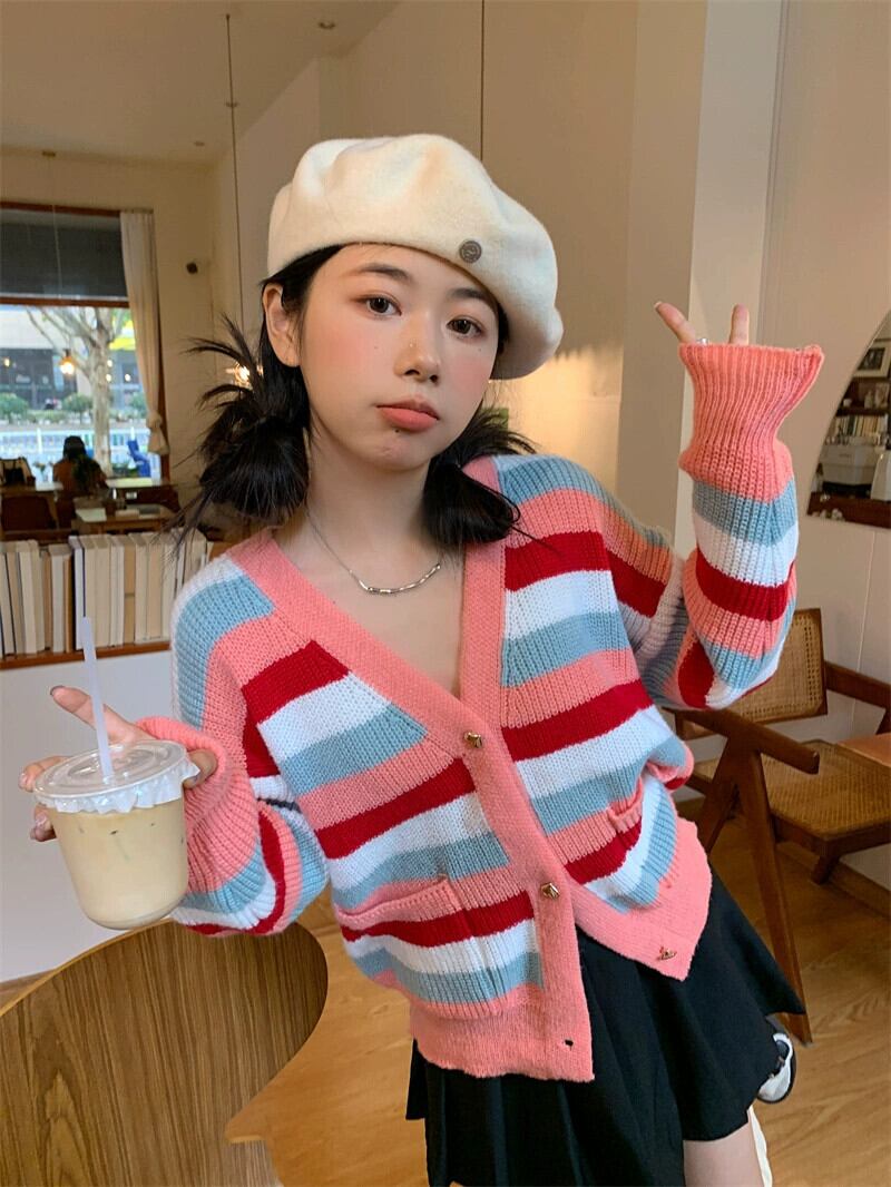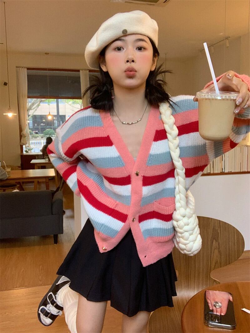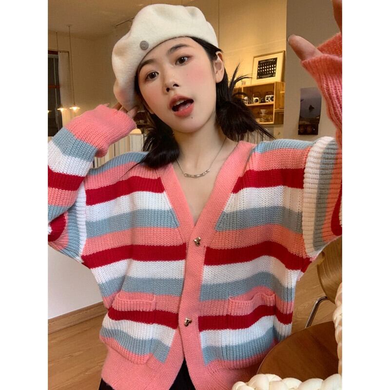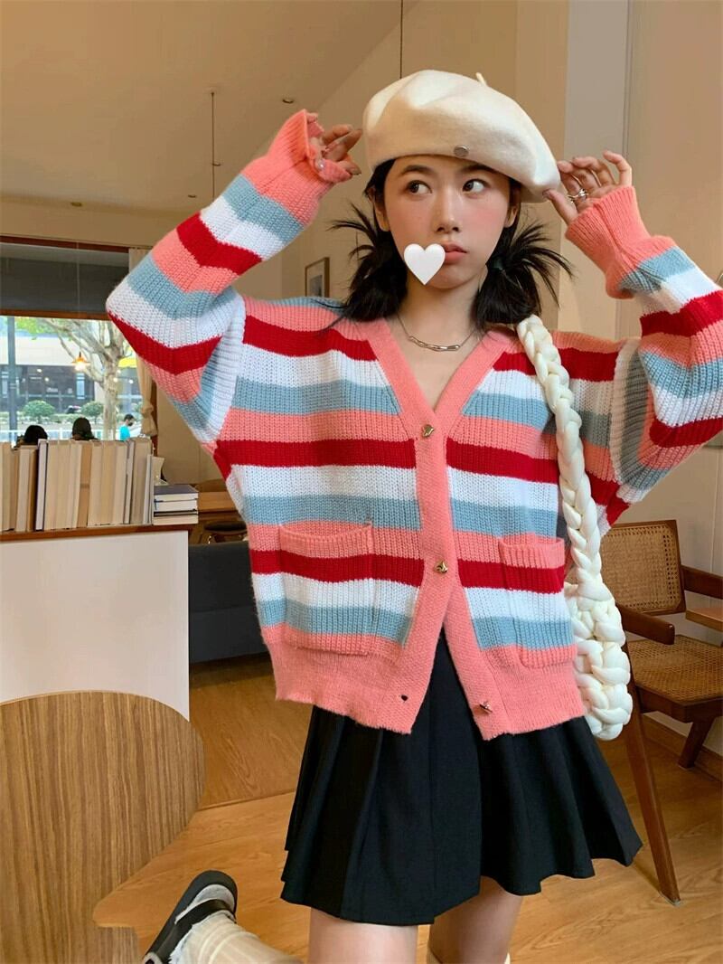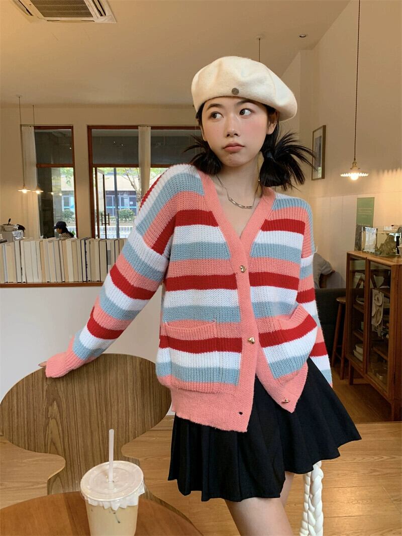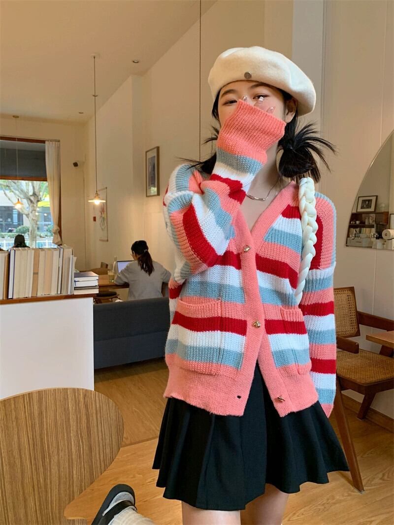 レインボーストライプの太いラインのセータージャケットの女性、秋冬スタイル、レトロなルーズなアウターウェア、レイジースタイルのVネック長袖セーター ロング オータム 秋物 ウィンター 冬物 7460087256597304 | framboise21