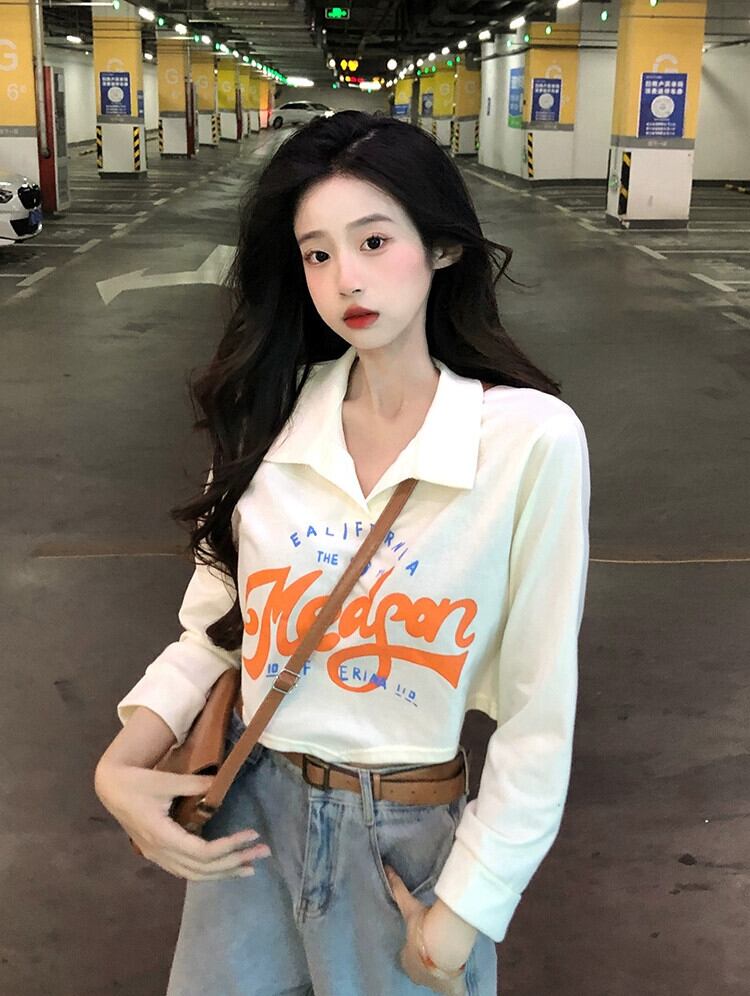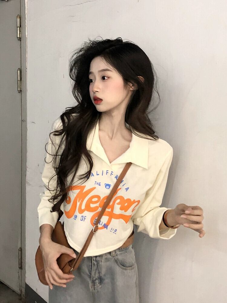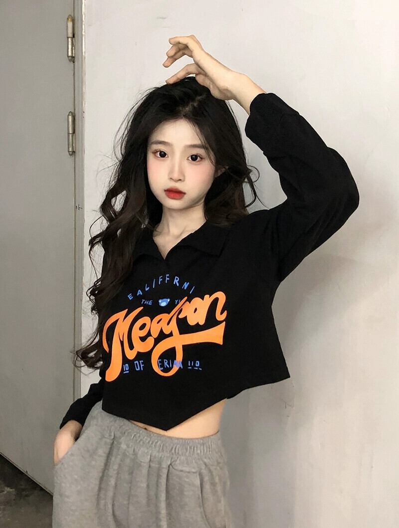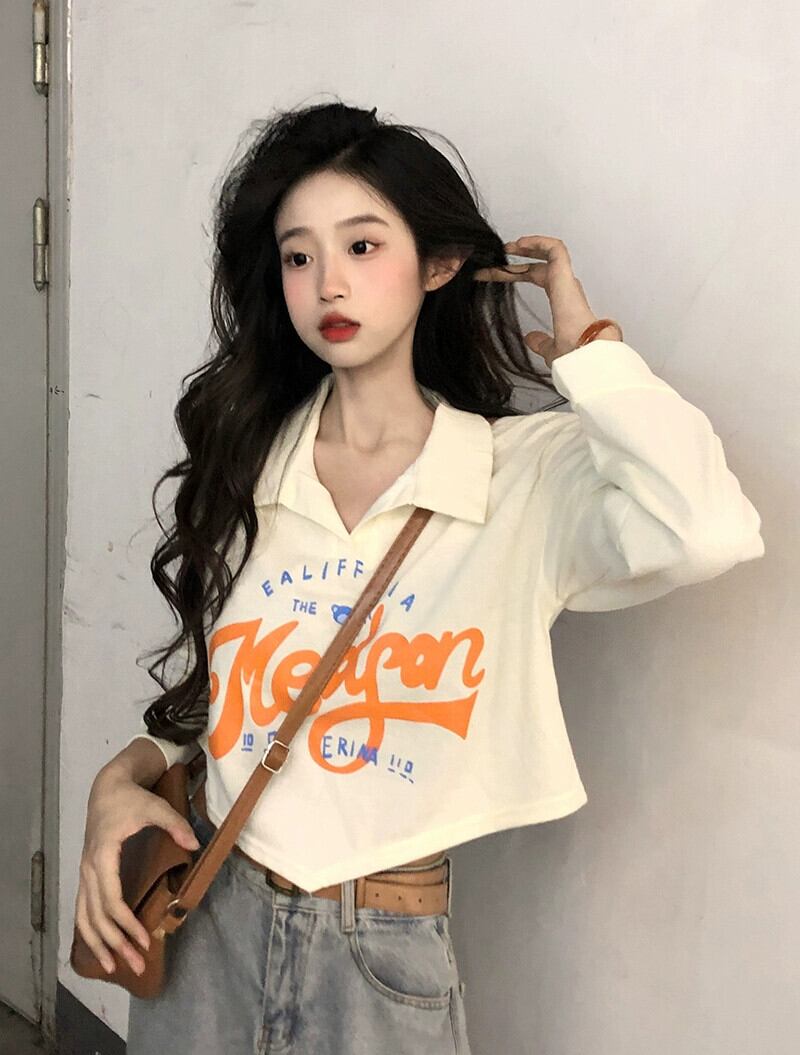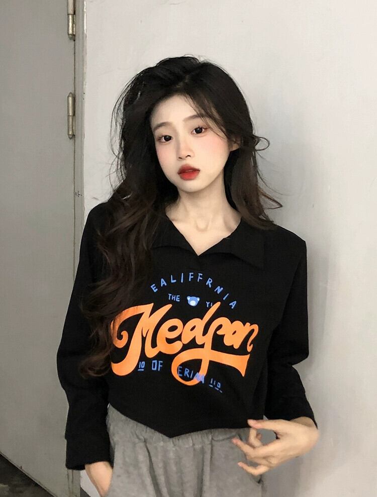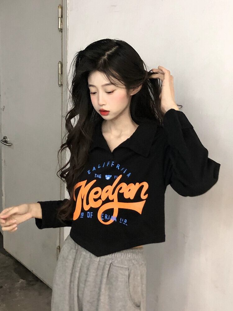 アメリカン レター プリント ポロカラー スウェットシャツ 春と秋スタイルのルーズで多用途なショート イレギュラー プルオーバー トップ スプリング 春物 オータム 秋物 7460084563147892 | framboise21