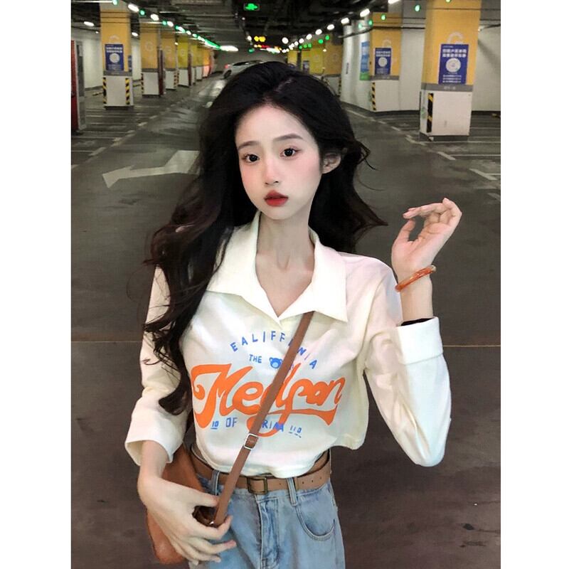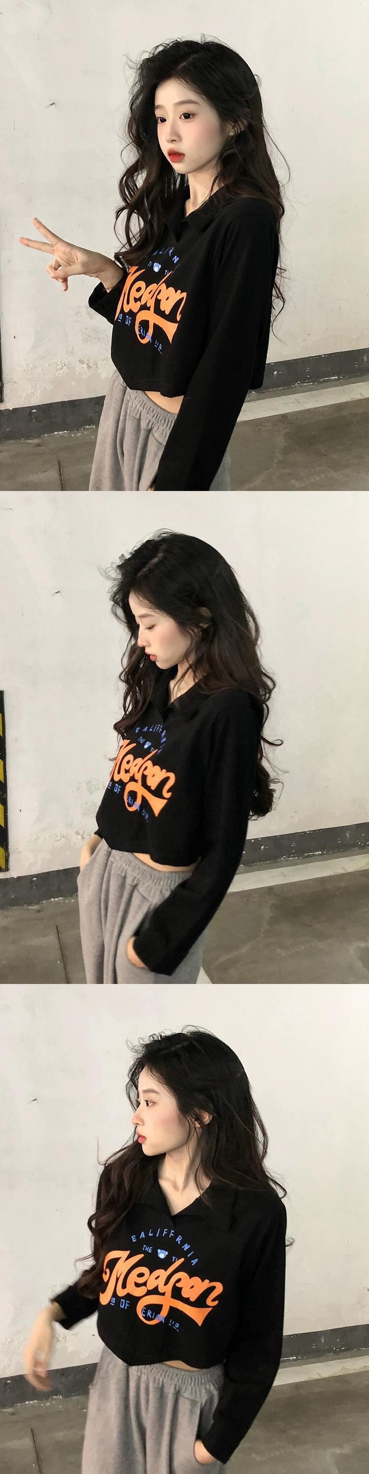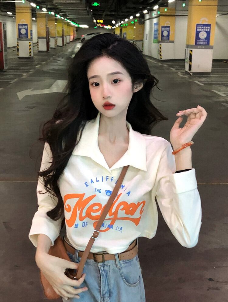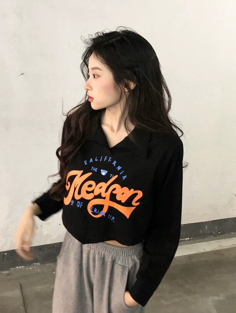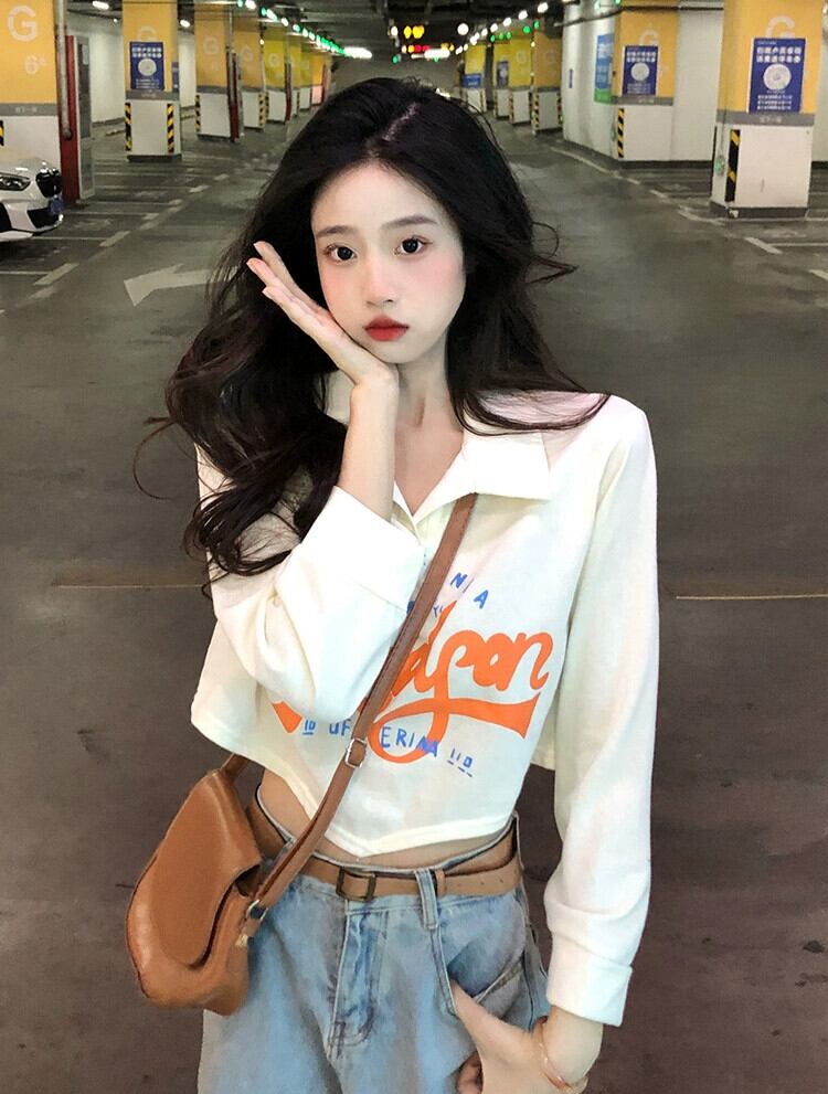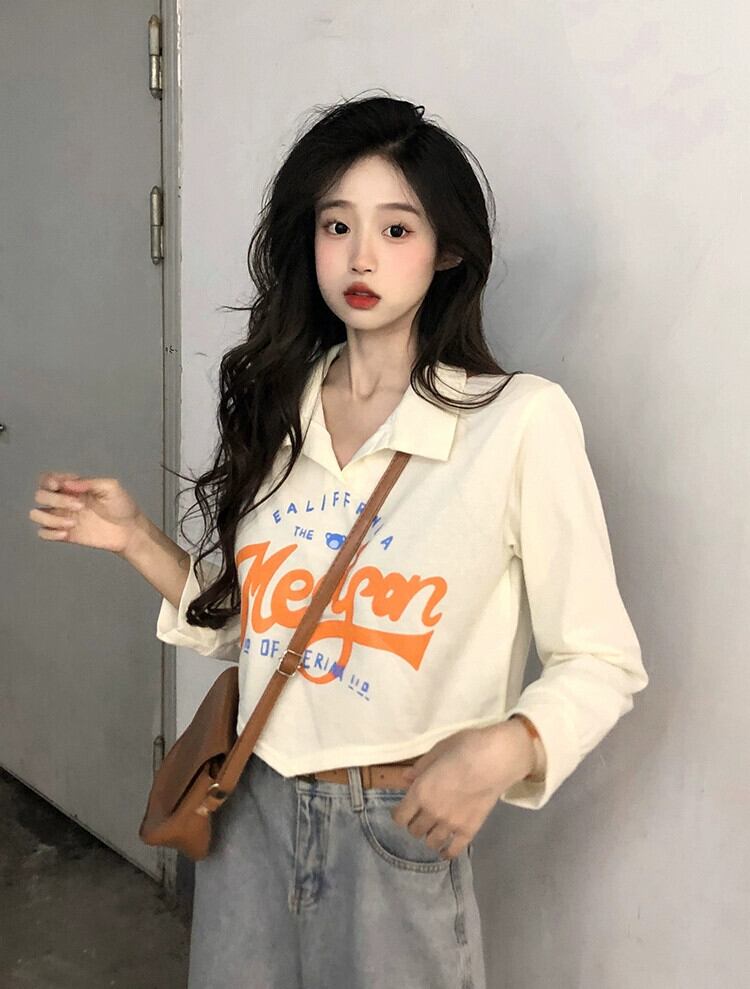 アメリカン レター プリント ポロカラー スウェットシャツ 春と秋スタイルのルーズで多用途なショート イレギュラー プルオーバー トップ スプリング 春物 オータム 秋物 7460084563147892 | framboise21