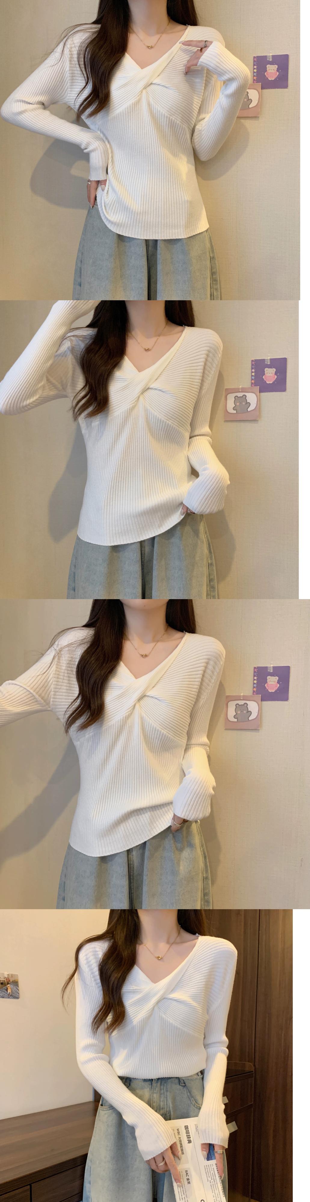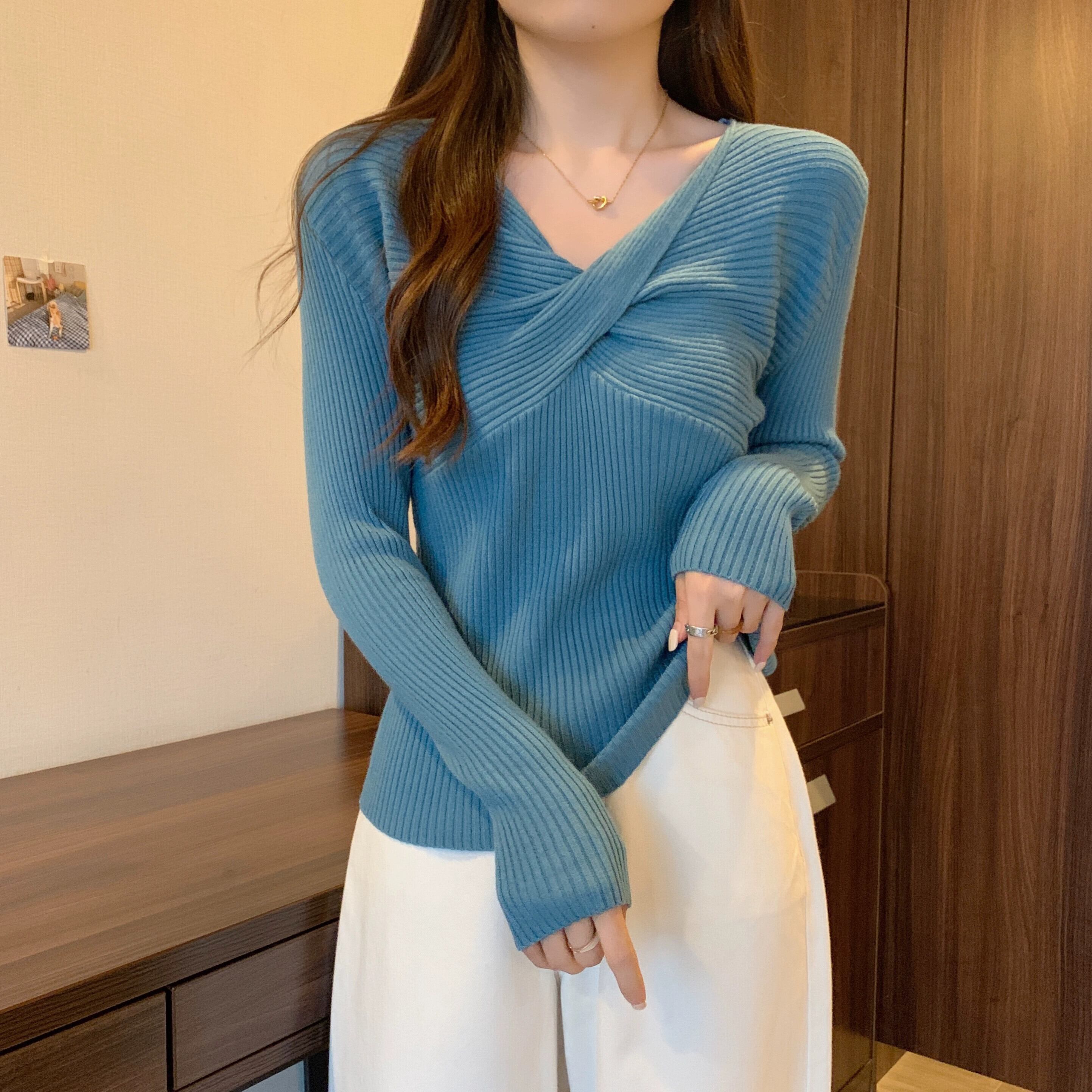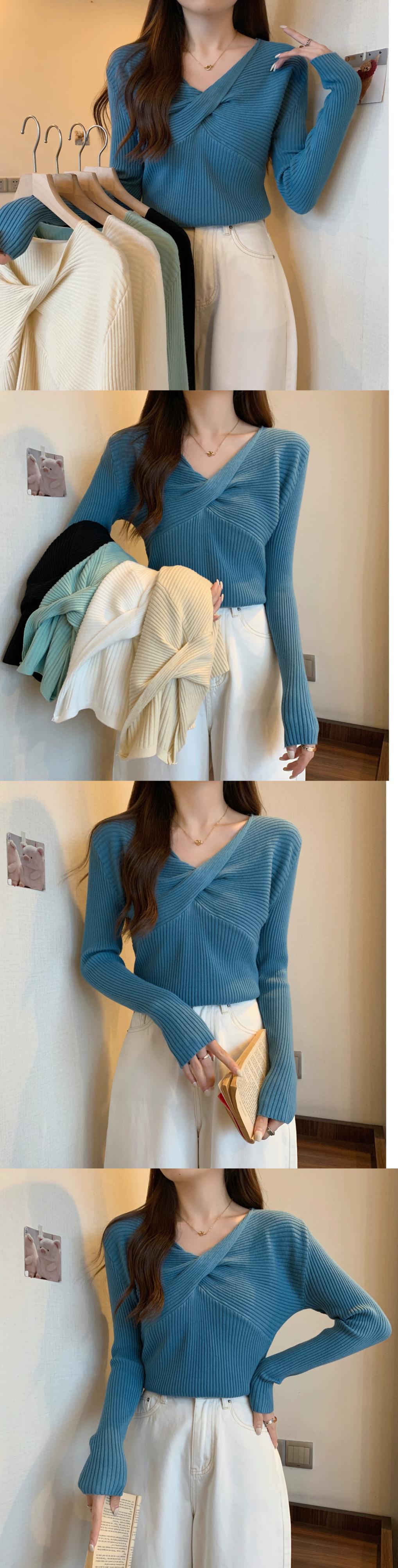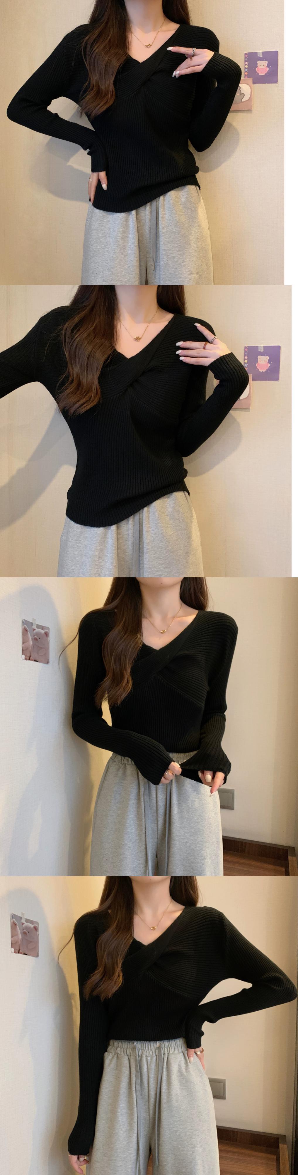 スタイリッシュなデザインとスリムフィットのニット V ネック ニット セーターを備えた秋と冬のクロスオーバー ショート長袖ボトリング シャツ女性 ロング オータム 秋物 ウィンター 冬物 Vネック 7460083702589525 | framboise21