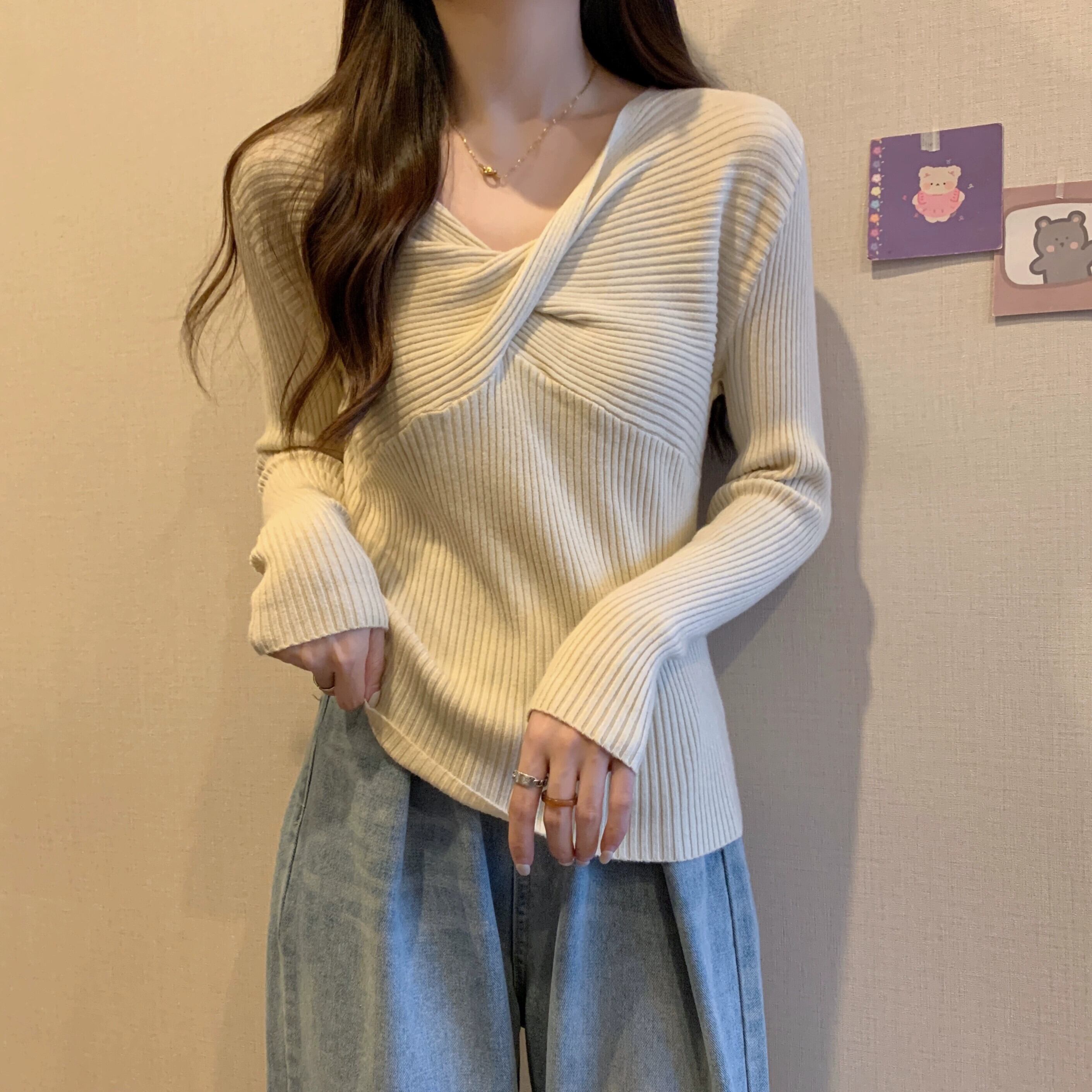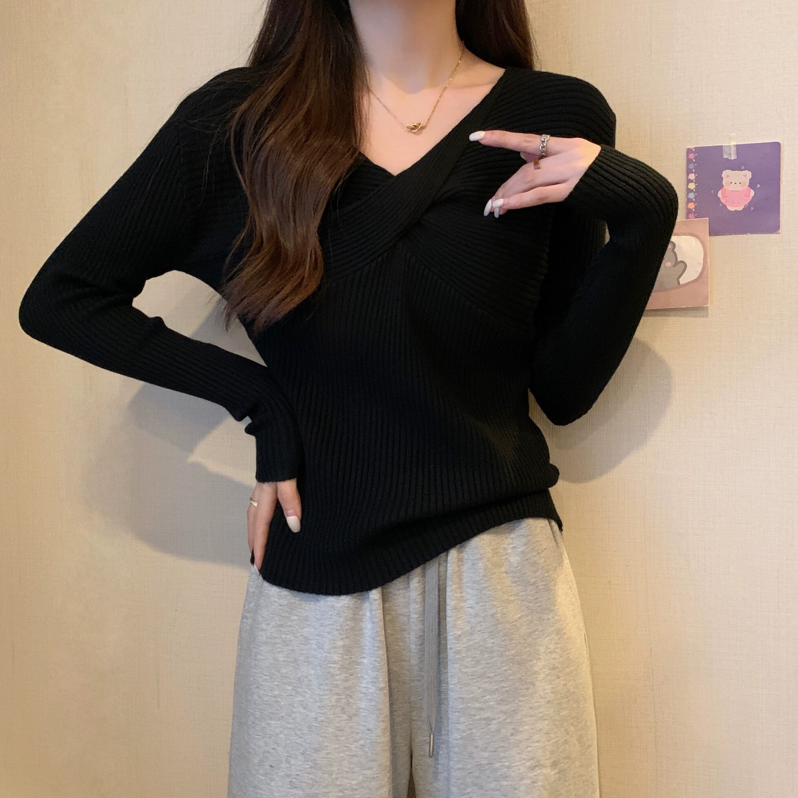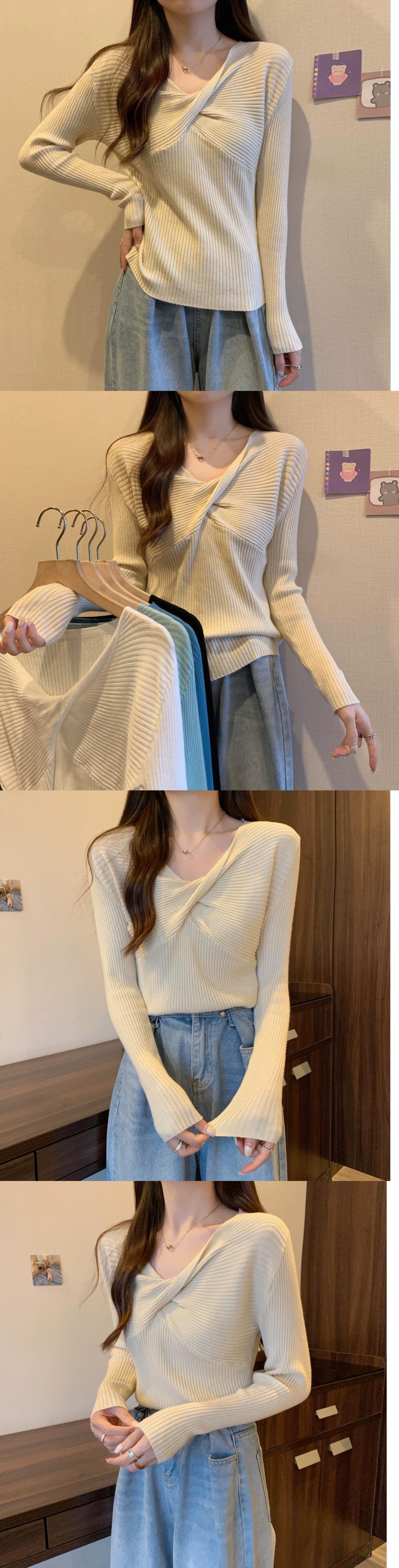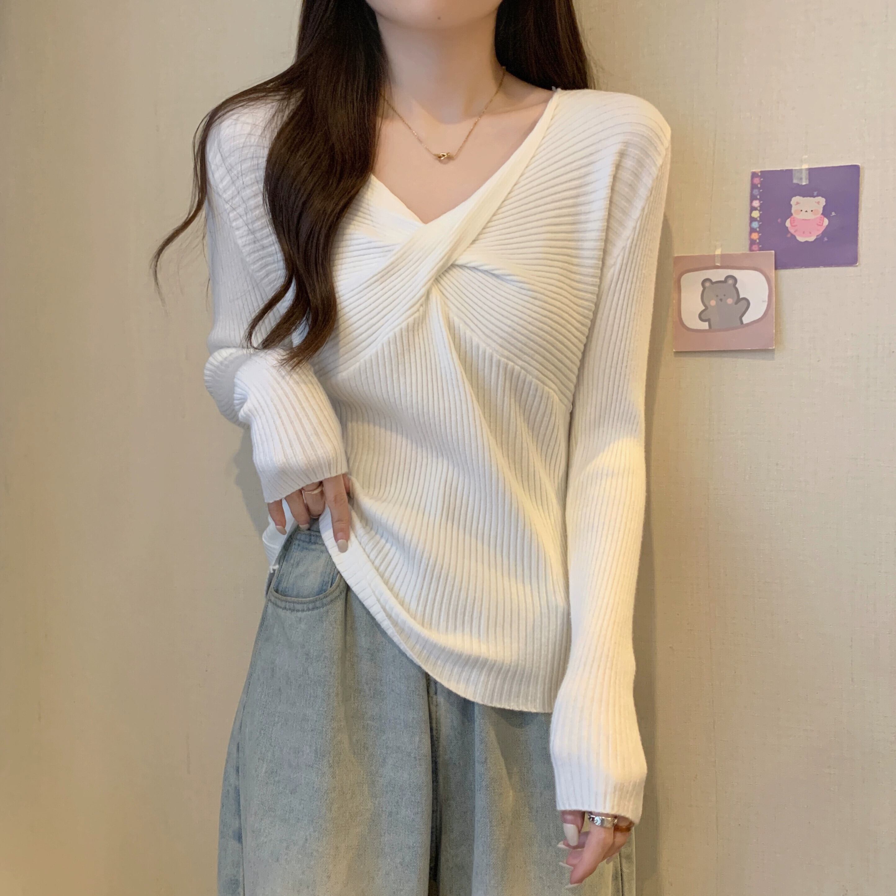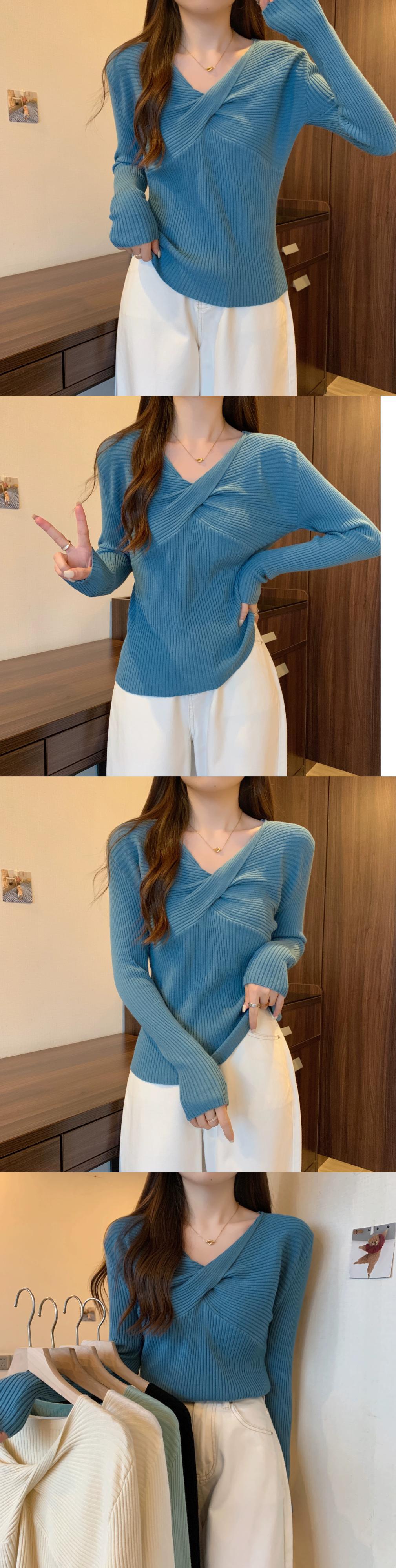 スタイリッシュなデザインとスリムフィットのニット V ネック ニット セーターを備えた秋と冬のクロスオーバー ショート長袖ボトリング シャツ女性 ロング オータム 秋物 ウィンター 冬物 Vネック 7460083702589525 | framboise21