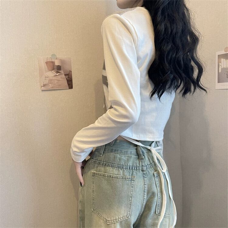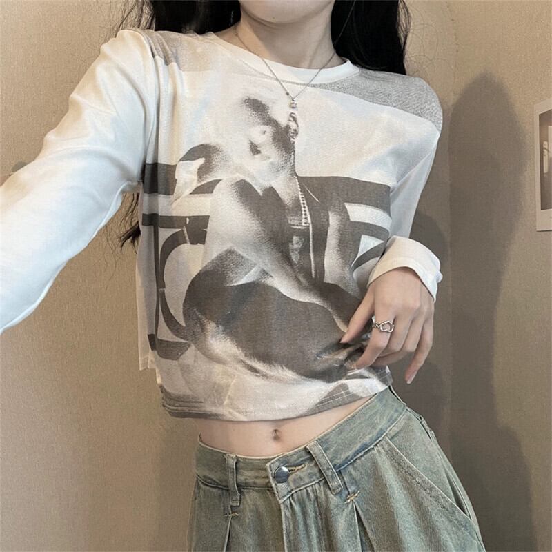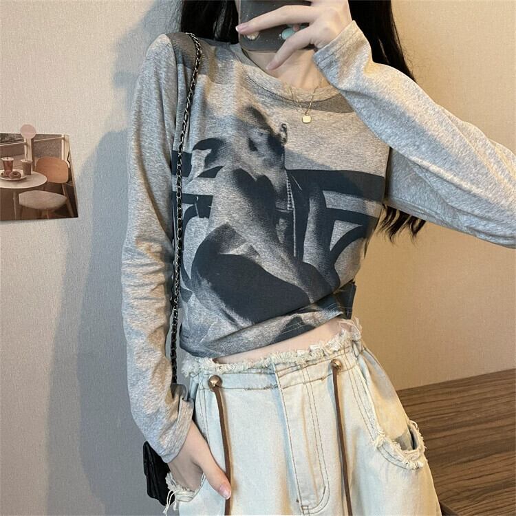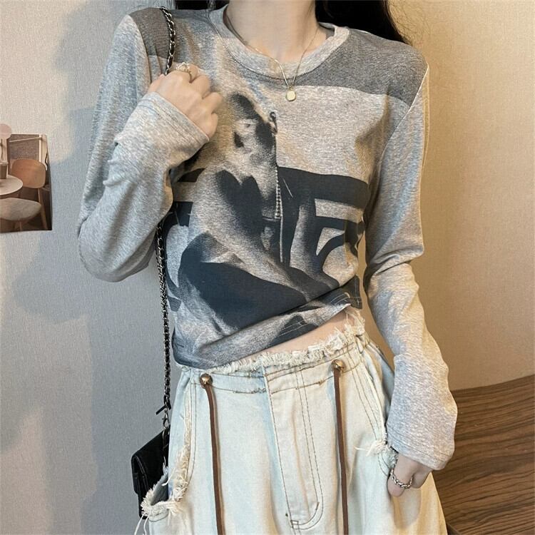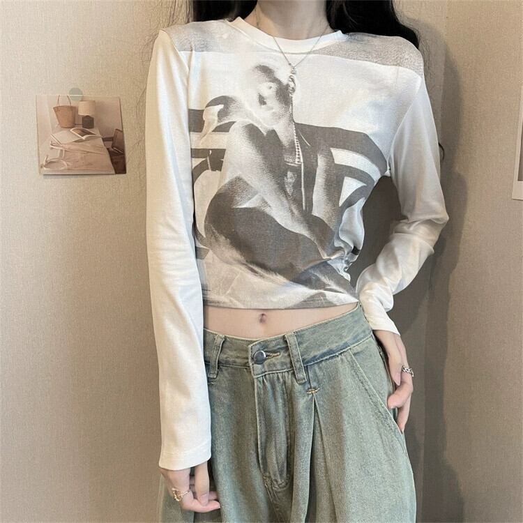 落書きプリント長袖トップス女性春と秋 2023 スタイルウエスタンスリムフィットショートボトム Tシャツ ロング スプリング 春物 オータム 秋物 7460017407461418 | framboise21