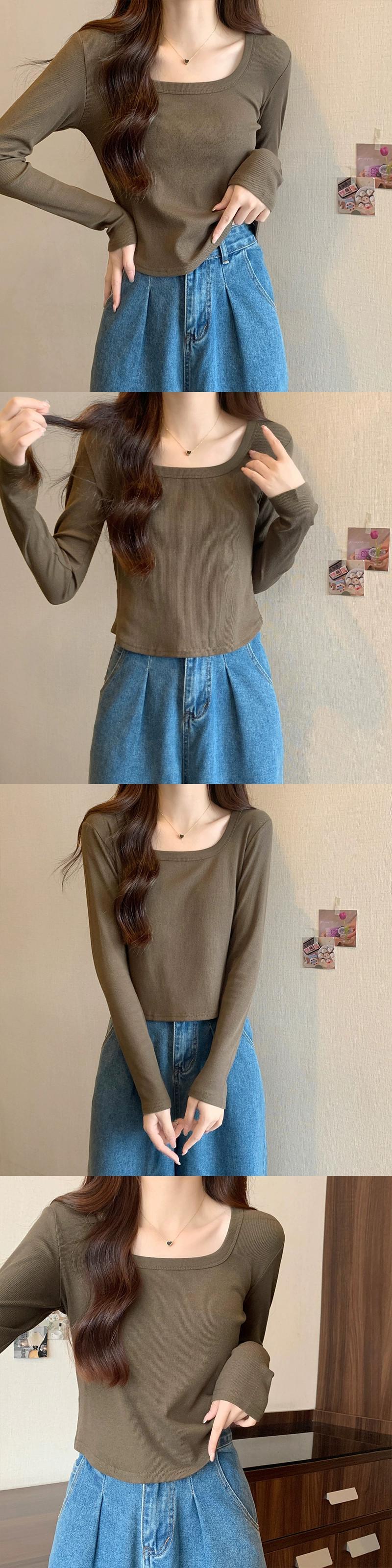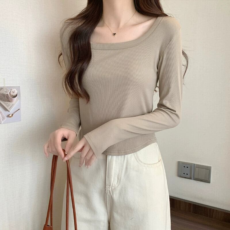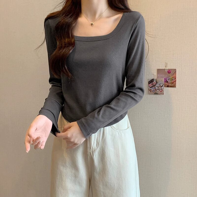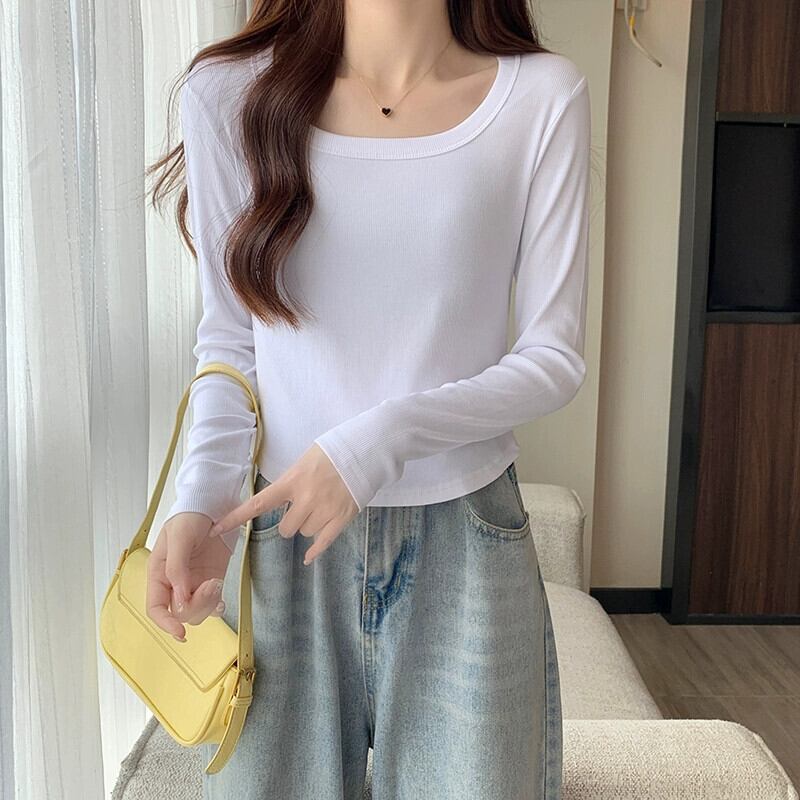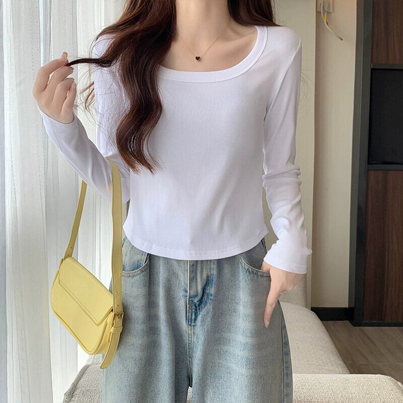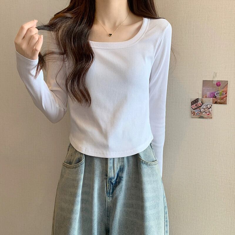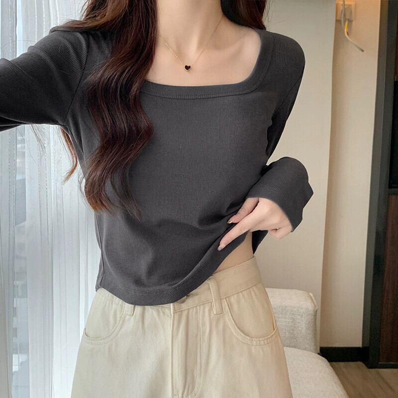 春と秋の小さな短い長袖ボトムストップ女性、ファッショナブルでスリム、不規則なスクエアネックTシャツ ショート ロング スプリング 春物 オータム 秋物 スクウェア 746006029270383 | framboise21