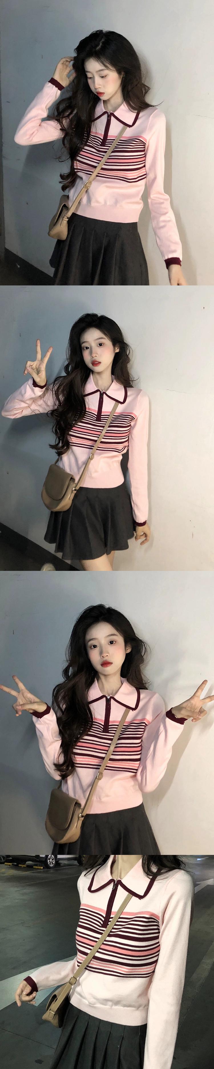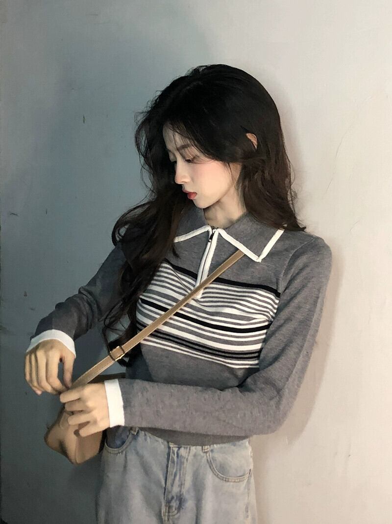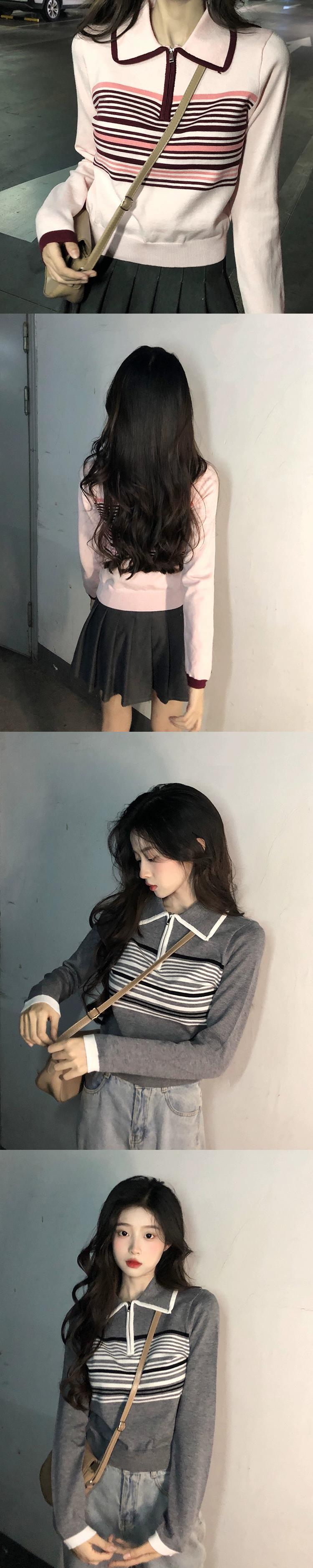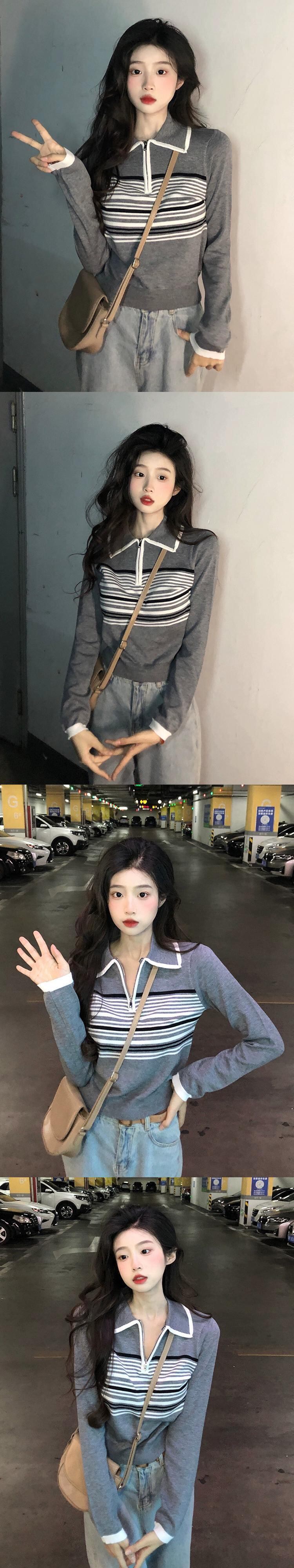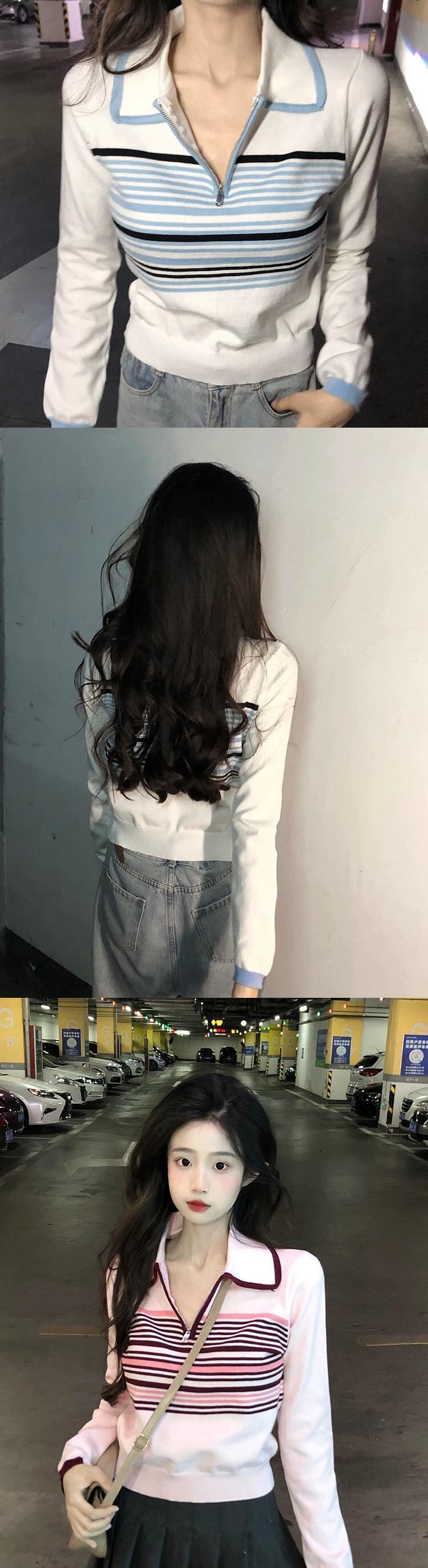秋冬のストライプのポロカラーニットボトムシャツレディース、ファッショナブル、スタイリッシュ、スリムフィット、ショート長袖トップ ロング オータム 秋物 ウィンター 冬物 746003924062114 | framboise21