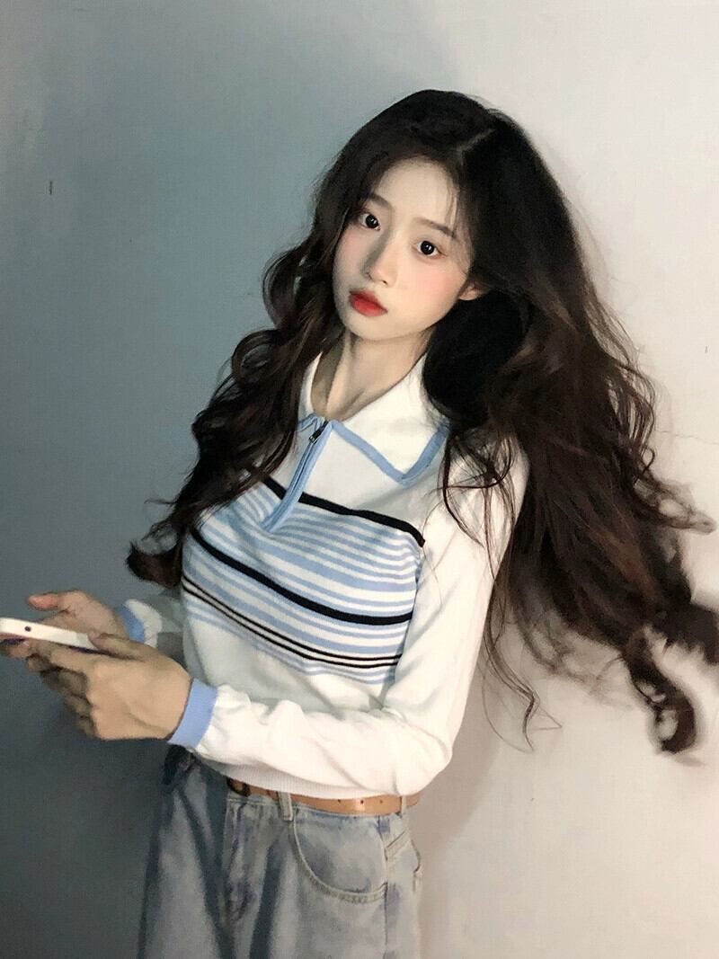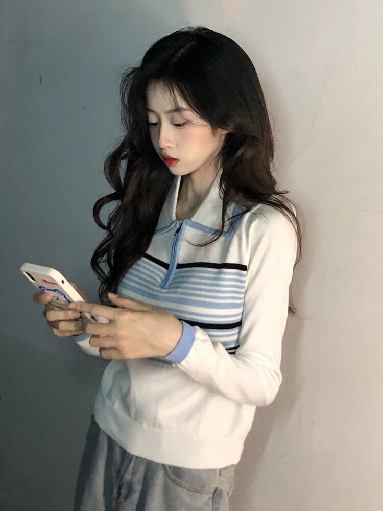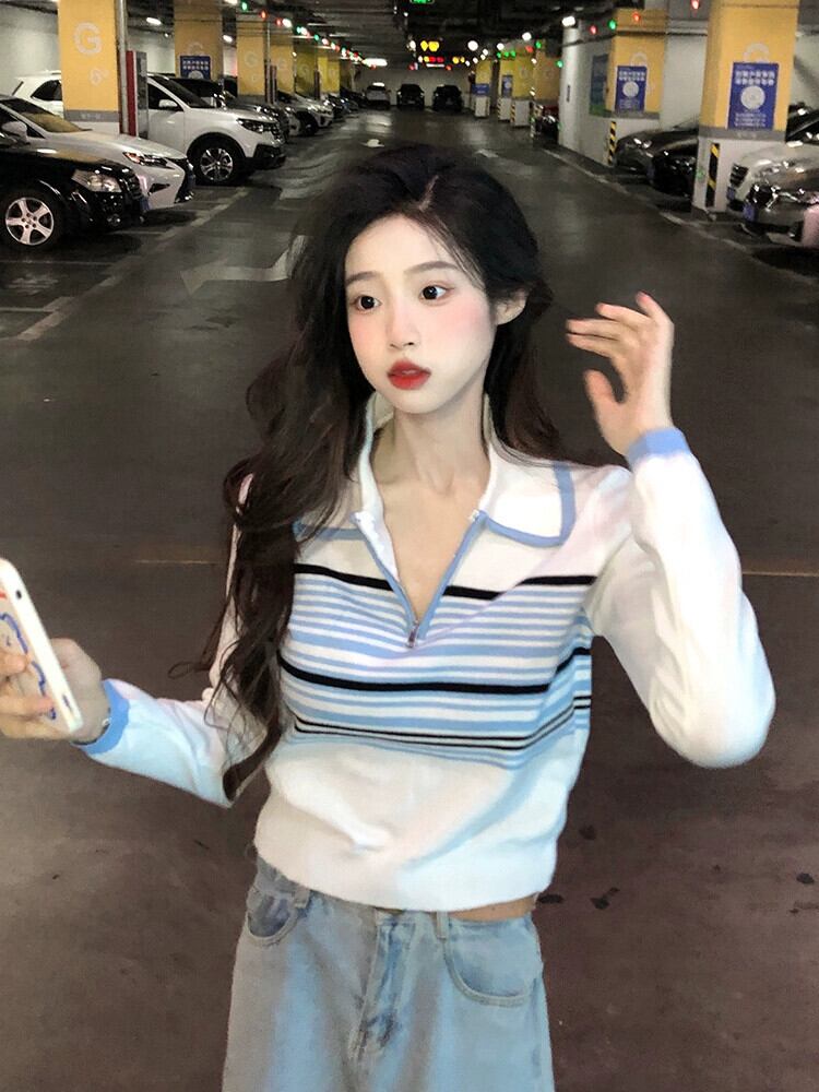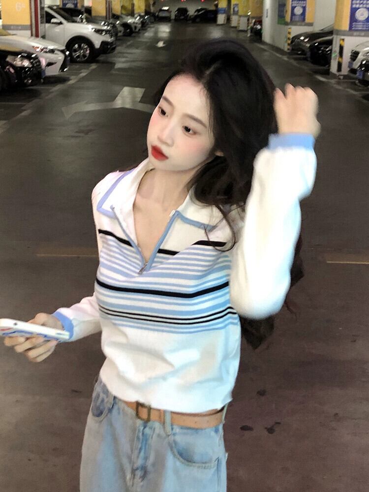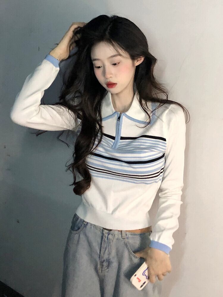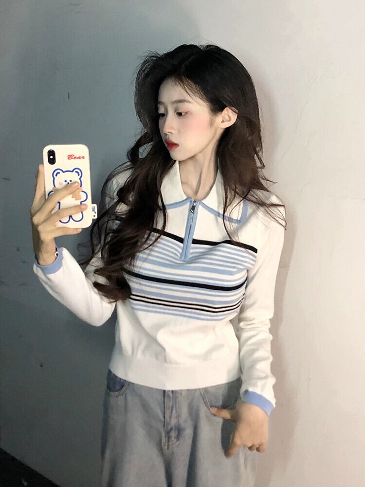 秋冬のストライプのポロカラーニットボトムシャツレディース、ファッショナブル、スタイリッシュ、スリムフィット、ショート長袖トップ ロング オータム 秋物 ウィンター 冬物 746003924062114 | framboise21